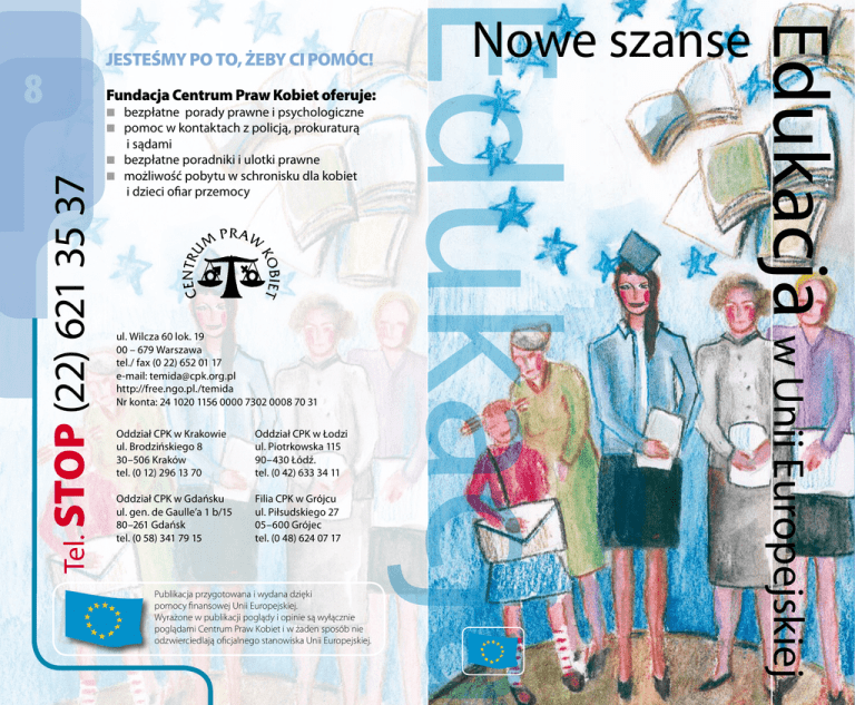 621 35 37 Tel. STOP (22) bezpłatne porady prawne i psychologiczne pomoc w kontaktach z policją, prokuraturą i sądami bezpłatne poradniki i ulotki prawne możliwość pobytu w schronisku dla kobiet i dzieci ofiar przemocy ul. Wilcza 60 lok. 19 00 – 679 Warszawa tel./ fax (0 22) 652 01 17 e-mail: [email protected] http://free.ngo.pl./temida Nr konta: 24 1020 1156 0000 7302 0008 70 31 Oddział CPK w Krakowie ul. Brodzińskiego 8 30–506 Kraków tel. (0 12) 296 13 70 Oddział CPK w Łodzi ul. Piotrkowska 115 90–430 Łódź. tel. (0 42) 633 34 11 Oddział CPK w Gdańsku ul. gen. de Gaulle’a 1 b/15 80–261 Gdańsk tel. (0 58) 341 79 15 Filia CPK w Grójcu ul. Piłsudskiego 27 05–600 Grójec tel. (0 48) 624 07 17 Publikacja przygotowana i wydana dzięki pomocy finansowej Unii Europejskiej. Wyrażone w publikacji poglądy i opinie są wyłącznie poglądami Centrum Praw Kobiet i w żaden sposób nie odzwierciedlają oficjalnego stanowiska Unii Europejskiej. Nowe szanse Edukacja w Unii Europejskiej Fundacja Centrum Praw Kobiet oferuje: Edukacja 8 JESTEŚMY PO TO, ŻEBY CI POMÓC! 2 SZANSE EDUKACYJNE W UE POLITYKA EDUKACYJNA UE 1 maja 2004 roku Polska została przyjęta do Unii Europejskiej (UE). W tym historycznym dniu staliśmy się pełnoprawnym członkiem wielkiej europejskiej rodziny, zjednoczonej nie tylko więzami politycznymi, prawnymi i gospodarczymi, ale także dużo głębszymi więzami wspólnej tradycji i kultury. Unia Europejska to szansa na lepsze jutro dla każdego z nas, także dla ciebie i twoich dzieci. Będąc obywatelami UE, mamy większe możliwości kształcenia się za granicą, uczenia się języków obcych i zdobywania doświadczenia zawodowego na wspólnotowym rynku pracy. Dzięki członkostwu w Unii Europejskiej (aktywnemu korzystaniu z jej programów edukacyjnych, zasadzie swobodnego przemieszczania się obywateli, wzajemnemu uznawaniu dyplomów i kwalifikacji zawodowych oraz dzięki dostępowi do ogromnych funduszy na tzw. rozwój zasobów ludzkich) mamy szansę na zmniejszenie dystansu edukacyjnego, jaki dzieli Polskę od zachodnich państw UE. Mamy możliwość stania się społeczeństwem nowoczesnym, lepiej wykształconym i bardziej otwartym na inne narodowości i kultury. Społeczeństwem zdolnym stawić czoła wyzwaniom globalnej gospodarki i polityki. Dobre wykształcenie, zdobywane już od najmłodszych lat, stanowi warunek aktywnego uczestnictwa w życiu zintegrowanej Europy. UE już dziś oferuje dzieciom (nawet przedszkolakom!), młodzieży i dorosłym dostęp do programów edukacyjnych, takich jak SOCRATES, LEONARDO DA VINCI czy MŁODZIEŻ. Dzięki nim w Europie od lat rozwija się współpraca między uczniami oraz nauczycielami z różnych krajów członkowskich. Przyczynia się ona do wzajemnego poznawania i przenikania narodowych systemów edukacyjnych, co z kolei ułatwia wypracowywanie reguł wzajemnego uznawania dyplomów dla celów akademickich, stanowiącego warunek pełnej realizacji zasady swobodnego przepływu studentów i pracowników naukowych. W Polsce instytucją odpowiedzialną za uznawanie dyplomów jest Biuro Uznawalności Wykształcenia i Wymiany Międzynarodowej, podległe Ministrowi Edukacji Narodowej i Sportu (ul. Smolna 13, 00-375 Warszawa, tel. (0 22) 826 76 34, e-mail: [email protected]). Unia Europejska nie wytworzyła jednolitego systemu edukacyjnego. Każde z państw członkowskich samodzielnie określa kształt własnego systemu oświaty (w tym treść programów nauczania), dzięki czemu jest on dostosowany do specyficznych warunków kulturowych, społecznych i ekonomicznych danego kraju. Na szczeblu unijnym wypracowywuje się jedynie ogólne założenia i cele europejskiej polityki edukacyjnej. Najważniejszym z nich jest podnoszenie jakości nauczania we wszystkich krajach członkowskich UE poprzez: upowszechnianie wśród młodzieży poczucia integracji europejskiej; nauczanie języków państw członkowskich; popieranie wymiany międzynarodowej studentów i nau czycieli; wzajemne uznawanie dyplomów i okresów studiów; wymianę doświadczeń edukacyjnych. Zadania te Unia realizuje poprzez organizowanie i wspieranie współpracy w dziedzinie edukacji między poszczególnymi państwami członkowskimi. Jednym z najważniejszych osiągnięć unijnej polityki edukacyjnej jest Dyrektywa Rady Unii Europejskiej nr 96 z 1993 r., na mocy której obywatele wszystkich państw UE chcący kształcić się za granicą mają prawo do podejmowania nauki w innym państwie członkowskim na takich samych warunkach jak uczniowie i studenci tego kraju. Od 1 maja 2004 r. zasada ta dotyczy także obywateli polskich. Oznacza to, że jeśli np. zechcesz studiować w Szwecji, Anglii lub w Niemczech, masz takie same prawa i przywileje, jak Szwed, Anglik bądź Niemiec. Obowiązują cię takie same opłaty za studia, przysługują ci takie same prawa do stypendiów naukowych czy do opieki medycznej, a nawet do zniżek na transport czy korzystanie z Internetu. Twój pobyt za granicą nie może jednak obciążać systemu socjalnego państwa przyjmującego, co znaczy, że nie możesz ubiegać się np. o dofinansowanie kosztów wynajmowanego na czas studiów mieszkania. Zasada równego traktowania obywateli Unii obowiązuje również wtedy, gdy podejmiesz naukę w kraju członkowskim, w którym jest ona bezpłatna. 3 4 STUDIA W KRAJACH UE PROGRAM SOCRATES Jeśli marzysz o studiach w jednym z państw UE, musisz przede wszystkim wybrać uczelnię, na której chciałabyś się kształcić i dowiedzieć się, jakie są zasady naboru i studiowania. Ambasady i instytuty kulturalne państw obcych oferują pomoc w wyborze uczelni (spis szkół, adresy) oraz w załatwieniu niezbędnych formalności. Musisz pamiętać, że w większości krajów unijnych studia wyższe wiążą się z opłatami (czesne, wpisowe itp.). Jeśli nie stać cię na ich pokrycie, możesz próbować ubiegać się o stypendium. Większość państw członkowskich ma własn