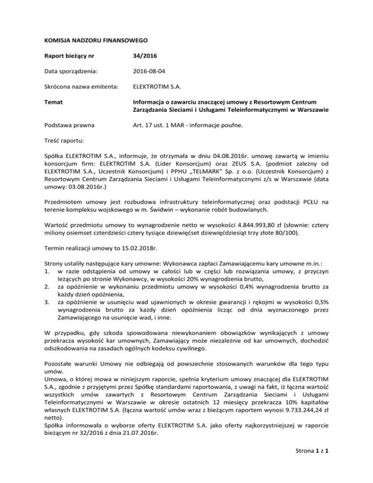 KOMISJA NADZORU FINANSOWEGO Raport bieżący nr 34/2016 Data sporządzenia: 2016-08-04 Skrócona nazwa emitenta: ELEKTROTIM S.A. Temat Informacja o zawarciu znaczącej umowy z Resortowym Centrum Zarządzania Sieciami i Usługami Teleinformatycznymi w Warszawie Podstawa prawna Art. 17 ust. 1 MAR - informacje poufne. Treść raportu: Spółka ELEKTROTIM S.A., informuje, że otrzymała w dniu 04.08.2016r. umowę zawartą w imieniu konsorcjum firm: ELEKTROTIM S.A. (Lider Konsorcjum) oraz ZEUS S.A. (podmiot zależny od ELEKTROTIM S.A., Uczestnik Konsorcjum) i PPHU „TELMARK” Sp. z o.o. (Uczestnik Konsorcjum) z Resortowym Centrum Zarządzania Sieciami i Usługami Teleinformatycznymi z/s w Warszawie (data umowy: 03.08.2016r.) Przedmiotem umowy jest rozbudowa infrastruktury teleinformatycznej oraz podstacji PCŁU na terenie kompleksu wojskowego w m. Świdwin – wykonanie robót budowlanych. Wartość przedmiotu umowy to wynagrodzenie netto w wysokości 4.844.993,80 zł (słownie: cztery miliony osiemset czterdzieści cztery tysiące dziewięćset dziewięćdziesiąt trzy złote 80/100). Termin realizacji umowy to 15.02.2018r. Strony ustaliły następujące kary umowne: Wykonawca zapłaci Zamawiającemu kary umowne m.in.: 1. w razie odstąpienia od umowy w całości lub w części lub rozwiązania umowy, z przyczyn leżących po stronie Wykonawcy, w wysokości 20% wynagrodzenia brutto, 2. za opóźnienie w wykonaniu przedmiotu umowy w wysokości 0,4% wynagrodzenia brutto za każdy dzień opóźnienia, 3. za opóźnienie w usunięciu wad ujawnionych w okresie gwarancji i rękojmi w wysokości 0,5% wynagrodzenia brutto za każdy dzień opóźnienia licząc od dnia wyznaczonego przez Zamawiającego na usunięcie wad, i inne. W przypadku, gdy szkoda spowodowana niewykonaniem obowiązków wynikających z umowy przekracza wysokość kar umownych, Zamawiający może niezależnie od kar umownych, dochodzić odszkodowania na zasadach ogólnych kodeksu cywilnego. Pozostałe warunki Umowy nie odbiegają od powszechnie stosowanych warunków dla tego typu umów. Umowa, o której mowa w niniejszym raporcie, spełnia kryterium umowy znaczącej dla ELEKTROTIM S.A., zgodnie z przyjętymi przez Spółkę standardami raportowania, z uwagi na fakt, iż łączna wartość wszystkich umów zawartych z Resortowym Centrum Zarządzania Sieciami i Usługami Teleinformatycznymi w Warszawie w okresie ostatnich 12 miesięcy przekracza 10% kapitałów własnych ELEKTROTIM S.A. (łączna wartość umów wraz z bieżącym raportem wynosi 9.733.244,24 zł netto). Spółka informowała o wyborze oferty ELEKTROTIM S.A. jako oferty najkorzystniejszej w raporcie bieżącym nr 32/2016 z dnia 21.07.2016r. Strona 1 z 1