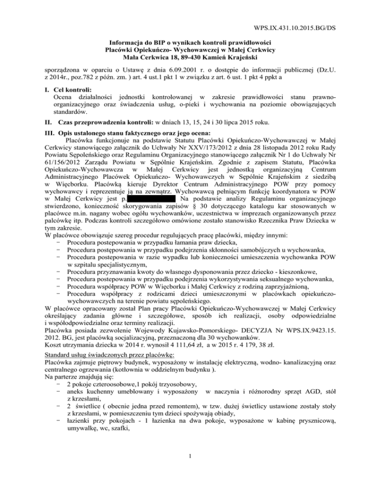 WPS.IX.431.10.2015.BG/DS Informacja do BIP o wynikach kontroli prawidłowości Placówki Opiekuńczo- Wychowawczej w Małej Cerkwicy Mała Cerkwica 18, 89-430 Kamień Krajeński sporządzona w oparciu o Ustawę z dnia 6.09.2001 r. o dostępie do informacji publicznej (Dz.U. z 2014r., poz.782 z późn. zm. ) art. 4 ust.1 pkt 1 w związku z art. 6 ust. 1 pkt 4 ppkt a I. Cel kontroli: Ocena działalności jednostki kontrolowanej w zakresie prawidłowości stanu prawnoorganizacyjnego oraz świadczenia usług, o-pieki i wychowania na poziomie obowiązujących standardów. II. Czas przeprowadzenia kontroli: w dniach 13, 15, 24 i 30 lipca 2015 roku. III. Opis ustalonego stanu faktycznego oraz jego ocena: Placówka funkcjonuje na podstawie Statutu Placówki Opiekuńczo-Wychowawczej w Małej Cerkwicy stanowiącego załącznik do Uchwały Nr XXV/173/2012 z dnia 28 listopada 2012 roku Rady Powiatu Sępoleńskiego oraz Regulaminu Organizacyjnego stanowiącego załącznik Nr 1 do Uchwały Nr 61/156/2012 Zarządu Powiatu w Sępólnie Krajeńskim. Zgodnie z zapisem Statutu, Placówka Opiekuńczo-Wychowawcza w Małej Cerkwicy jest jednostką organizacyjną Centrum Administracyjnego Placówek Opiekuńczo- Wychowawczych w Sępólnie Krajeńskim z siedzibą w Więcborku. Placówką kieruje Dyrektor Centrum Administracyjnego POW przy pomocy wychowawcy i reprezentuje ją na zewnątrz. Wychowawcą pełniącym funkcję koordynatora w POW w Małej Cerkwicy jest p.xxxxxxxxxxxxxx Na podstawie analizy Regulaminu organizacyjnego stwierdzono, konieczność skorygowania zapisów § 30 dotyczącego katalogu kar stosowanych w placówce m.in. nagany wobec ogółu wychowanków, uczestnictwa w imprezach organizowanych przez palcówkę itp. Podczas kontroli szczegółowo omówione zostało stanowisko Rzecznika Praw Dziecka w tym zakresie. W placówce obowiązuje szereg procedur regulujących pracę placówki, między innymi: - Procedura postepowania w przypadku łamania praw dziecka, - Procedura postępowania w przypadku podejrzenia skłonności samobójczych u wychowanka, - Procedura postepowania w razie wypadku lub konieczności umieszczenia wychowanka POW w szpitalu specjalistycznym, - Procedura przyznawania kwoty do własnego dysponowania przez dziecko - kieszonkowe, - Procedura postepowania w przypadku podejrzenia wykorzystywania seksualnego wychowanka, - Procedura współpracy POW w Więcborku i Małej Cerkwicy z rodziną zaprzyjaźnioną, - Procedura współpracy z rodzicami dzieci umieszczonymi w placówkach opiekuńczowychowawczych na terenie powiatu sępoleńskiego. W placówce opracowany został Plan pracy Placówki Opiekuńczo-Wychowawczej w Małej Cerkwicy określający zadania główne i szczegółowe, sposób ich realizacji, osoby odpowiedzialne i współodpowiedzialne oraz terminy realizacji. Placówka posiada zezwolenie Wojewody Kujawsko-Pomorskiego- DECYZJA Nr WPS.IX.9423.15. 2012. BG, jest placówką socjalizacyjną, przeznaczoną dla 30 wychowanków. Koszt utrzymania dziecka w 2014 r. wynosił 4 111,64 zł, a w 2015 r. 4 179, 38 zł. Standard usług świadczonych przez placówkę: Placówka zajmuje piętrowy budynek, wyposażony w instalację elektryczną, wodno- kanalizacyjną oraz centralnego ogrzewania (kotłownia w oddzielnym budynku ). Na parterze znajdują się: - 2 pokoje czteroosobowe,1 pokój trzyosobowy, - aneks kuchenny umeblowany i wyposażony w naczynia i różnorodny sprzęt AGD, stół z krzesłami, - 2 świetlice ( obecnie jedna przed remontem), w tzw. dużej świetlicy ustawione zostały stoły z krzesłami, w pomieszczeniu tym dzieci spożywają obiady, - łazienki przy pokojach - 1 łazienka na dwa pokoje, wyposażone w kabinę prysznicową, umywalkę, wc, szafki, 1 - pomieszczenie do wypoczynku wyposażone w kanapy, meble, sprzęt RTV, zabawki i gry dostosowane do wieku wychowanków, - miejsce do nauki- pokój wyposażony w stoliki i krzesła, stanowiska komputerowe, - podręczny magazynek spożywczy i pomieszczenie gospodarcze, - pomieszczenie stanowiące pralnio- suszarnie. Na parterze mieści się również szatnia z szafkami, w której dzieci zostawiają okrycia wierzchnie oraz zmieniają obuwie. Na piętrze: - 3 pokoje czteroosobowe, 1 pokój dwuosobowy, 2 pokoje trzyosobowe umeblowane stosownie do potrzeb, tj. szafy, biurka, miejsce do spania, - łazienki przy pokojach - 1 łazienka na dwa pokoje, wyposażone w kabinę prysznicową, umywalkę, wc, szafki, - miejsce do nauki- wyposażenie j.w., - 2 aneksy kuchenne umeblowane i wyposażone w naczynia i różnorodny sprzęt AGD, stół z krzesłami, - świetlica stanowiąca miejsce do wypoczynku, - pomieszczenie gospodarcze. Ogrodzona wokół placówki działka, na której znajduje się piaskownica, zjeżdżalnia dla dzieci, huśtawka oraz trampolina. W okresie letnim dzieci mogą korzystać z dmuchanego basenu. Do dyspozycji wychowanków boisko do gry w siatkówkę oraz ogólnodostępne boisko do piłki nożnej. W zakresie warunków socjalno-bytowych stwierdzono, iż placówka posiada wszystkie pomieszczenia zgodnie ze standardem określonym w § 18 ust. 3 rozporządzenia MPiPS z dnia 22 grudnia 2011r. w sprawie instytucjonalnej pieczy zastępczej (Dz.U. z 2011r.,Nr 292, poz. 1720). Wyposażenie, estetyka i stan sanitarno-higieniczny pomieszczeń nie budzi zastrzeżeń. Zabezpieczenie standardu opieki i wychowania w placówce: Placówka zapewnia wyżywienie dostosowane do potrzeb rozwojowych, kulturowych, religijnych oraz stanu zdrowia wychowanków. Stawka żywieniowa na rok 2015 wynosi 12,50 zł. Placówka korzysta z cateringu - wszystkie posiłki przywożone są do placówki, a przygotowywane przez obsługę kuchni zlokalizowanej w budynku Bursy, w którym mieści się również druga placówka opiekuńczowychowawcza obsługiwana przez Centrum. Wychowankom umożliwia się samodzielne przygotowanie dodatkowych posiłków zgodnie z własnymi pomysłami (głównie w dni wolne od nauki). Dzieci mają dostęp do produktów żywnośc