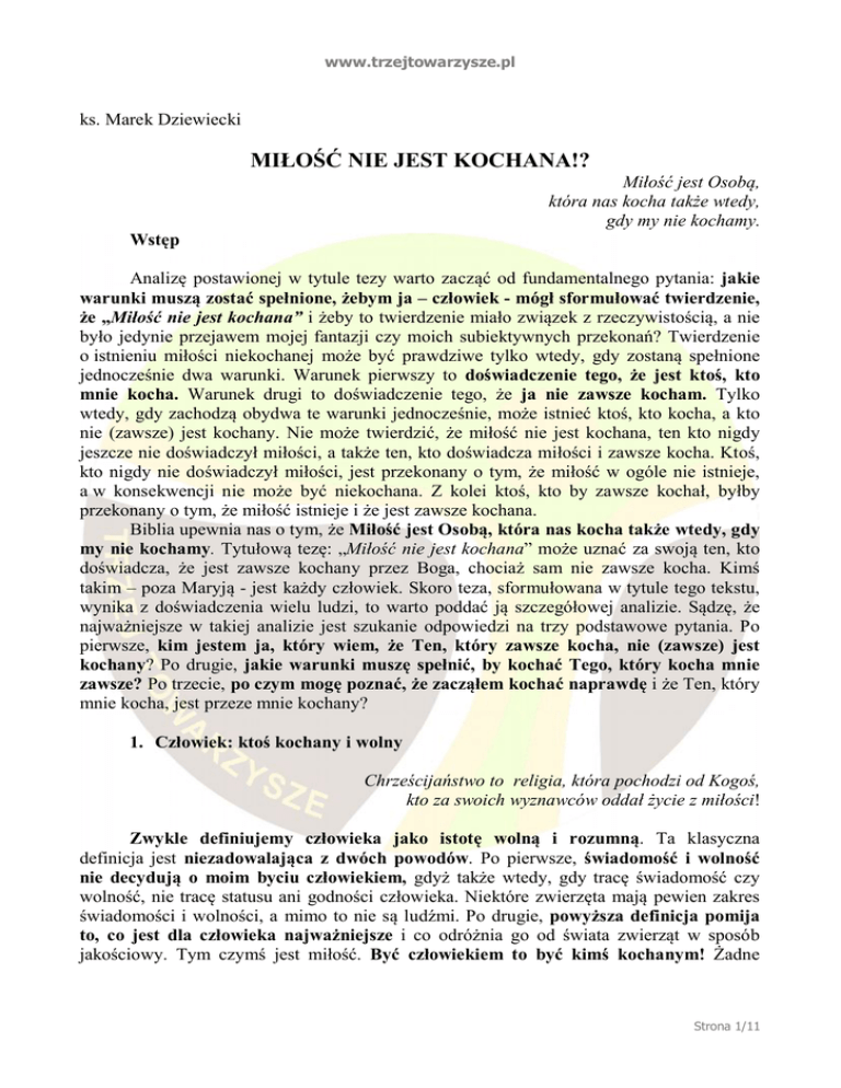 www.trzejtowarzysze.pl ks. Marek Dziewiecki MIŁOŚĆ NIE JEST KOCHANA!? Miłość jest Osobą, która nas kocha także wtedy, gdy my nie kochamy. Wstęp Analizę postawionej w tytule tezy warto zacząć od fundamentalnego pytania: jakie warunki muszą zostać spełnione, żebym ja – człowiek - mógł sformułować twierdzenie, że „Miłość nie jest kochana” i żeby to twierdzenie miało związek z rzeczywistością, a nie było jedynie przejawem mojej fantazji czy moich subiektywnych przekonań? Twierdzenie o istnieniu miłości niekochanej może być prawdziwe tylko wtedy, gdy zostaną spełnione jednocześnie dwa warunki. Warunek pierwszy to doświadczenie tego, że jest ktoś, kto mnie kocha. Warunek drugi to doświadczenie tego, że ja nie zawsze kocham. Tylko wtedy, gdy zachodzą obydwa te warunki jednocześnie, może istnieć ktoś, kto kocha, a kto nie (zawsze) jest kochany. Nie może twierdzić, że miłość nie jest kochana, ten kto nigdy jeszcze nie doświadczył miłości, a także ten, kto doświadcza miłości i zawsze kocha. Ktoś, kto nigdy nie doświadczył miłości, jest przekonany o tym, że miłość w ogóle nie istnieje, a w konsekwencji nie może być niekochana. Z kolei ktoś, kto by zawsze kochał, byłby przekonany o tym, że miłość istnieje i że jest zawsze kochana. Biblia upewnia nas o tym, że Miłość jest Osobą, która nas kocha także wtedy, gdy my nie kochamy. Tytułową tezę: „Miłość nie jest kochana” może uznać za swoją ten, kto doświadcza, że jest zawsze kochany przez Boga, chociaż sam nie zawsze kocha. Kimś takim – poza Maryją - jest każdy człowiek. Skoro teza, sformułowana w tytule tego tekstu, wynika z doświadczenia wielu ludzi, to warto poddać ją szczegółowej analizie. Sądzę, że najważniejsze w takiej analizie jest szukanie odpowiedzi na trzy podstawowe pytania. Po pierwsze, kim jestem ja, który wiem, że Ten, który zawsze kocha, nie (zawsze) jest kochany? Po drugie, jakie warunki muszę spełnić, by kochać Tego, który kocha mnie zawsze? Po trzecie, po czym mogę poznać, że zacząłem kochać naprawdę i że Ten, który mnie kocha, jest przeze mnie kochany? 1. Człowiek: ktoś kochany i wolny Chrześcijaństwo to religia, która pochodzi od Kogoś, kto za swoich wyznawców oddał życie z miłości! Zwykle definiujemy człowieka jako istotę wolną i rozumną. Ta klasyczna definicja jest niezadowalająca z dwóch powodów. Po pierwsze, świadomość i wolność nie decydują o moim byciu człowiekiem, gdyż także wtedy, gdy tracę świadomość czy wolność, nie tracę statusu ani godności człowieka. Niektóre zwierzęta mają pewien zakres świadomości i wolności, a mimo to nie są ludźmi. Po drugie, powyższa definicja pomija to, co jest dla człowieka najważniejsze i co odróżnia go od świata zwierząt w sposób jakościowy. Tym czymś jest miłość. Być człowiekiem to być kimś kochanym! Żadne Strona 1/11 www.trzejtowarzysze.pl zwierze nie jest i nie będzie kochane. Człowiek to ktoś kochany! To ktoś stworzony z Miłości i powołany do miłości. To ktoś, kto cierpi nie tylko wtedy, gdy jest krzywdzony, ale tak wtedy, gdy jest niekochany. Bóg o tym wie i kocha mnie zawsze. Także wtedy, gdy nie odpowiadam na Jego miłość. Kocha mnie nawet wtedy, gdy od Niego odchodzę czy gdy już nie wierzę w to, że ktokolwiek może mnie jeszcze kochać. Prorok Izajasz upewnia o tym naród wybrany, który okazał się niewierny wobec Boga i popadł w niewolę: Jak kogo pociesza własna matka, tak Ja was pocieszać będę (Iz 66, 13). Czyż może niewiasta zapomnieć o swym niemowlęciu, ta, która kocha syna swego łona? A nawet gdyby ona zapomniała, Ja nie zapomnę o tobie (Iz 49,15). Od Wielkiego Piątku wiemy już więcej niż Izajasz. Wiemy już o tym, że Bóg kocha człowieka nad życie. Dosłownie! I nie dlatego, że Bóg musi aż tak kochać, lecz dlatego, że chce kochać człowieka aż tak bardzo. Człowiek to ktoś kochany, kto sam nie zawsze kocha i kto czasem nie kocha wcale. Po drugie, człowiek to ktoś podobny do Boga. To ktoś podobny do tej najbardziej Niezwykłej Osoby, która stworzyła wszechświat i która każdego z nas kocha zawsze. Ta Osoba nie tylko kocha. Ta Osoba jest Miłością. Człowiek jest podobny do Boga! Podobny, ale nie taki sam! Podobny, to znaczy zdolny do tego, by kochać, ale niezdolny do tego, by być miłością, czyli by własną mocą gwarantować, że będzie kochać zawsze i za każdą cenę. Także wtedy, gdy sam nie będzie kochany przez tych, których kocha. Gdy ja – człowiek – zaczynam kochać, to moja zdolność kochania podlega tym wszystkim ograniczeniom i zagrożeniom, którym ja podlegam. Nie byłbym w stanie zacząć kochać, gdybym nie był kochany przez Boga i przez niektórych ludzi. A gdy już zacząłem kochać, to z trudem przychodzi mi kochać tych ludzi, którzy nie kochają, czy którzy nie komunikują swojej miłości. Bóg nie potrzebuje mojej miłości po to, by trwać w miłości do mnie, ale ja nie jestem Bogiem. Najłatwiej przychodzi mi kochać tych, którzy odpowiadają miłością na miłość i którzy z radością przyjmują miłość ode mnie. Podtrzymywanie miłości w relacjach między ludźmi, którzy nie są miłością, wymaga pewnego stopnia wzajemności. W przeciwnym przypadku więź z kochaną osobą zaczyna słabnąć. Miłość nie jest uczuciem, ale uczucie odgrywa ważną rolę w postawie miłości. Jeśli małżonek, dorosłe dziecko, rodzic, przyjaciel przestaje okazywać miłość, to ta druga strona – jeśli trwa w Bogu – może wytrwać w miłości do człowieka. Nawet do tego człowieka, który nie kocha czy który się emocjonalnie oddala. Jednak trwaniu w jednostronnej miłości nie będzie zwykle towarzyszyć już tak intensywna radość, troska i tęsknota jak wtedy, gdy miłość była wzajemna. Może niestety być też i tak, że zaczyna słabnąć moja miłość, że to ja