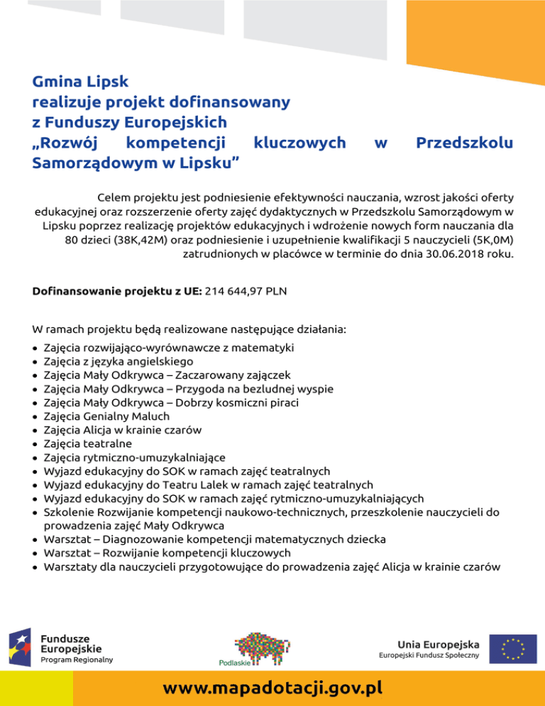 Gmina Lipsk realizuje projekt dofinansowany z Funduszy Europejskich „Rozwój kompetencji kluczowych Samorządowym w Lipsku” w Przedszkolu Celem projektu jest podniesienie efektywności nauczania, wzrost jakości oferty edukacyjnej oraz rozszerzenie oferty zajęć dydaktycznych w Przedszkolu Samorządowym w Lipsku poprzez realizację projektów edukacyjnych i wdrożenie nowych form nauczania dla 80 dzieci (38K,42M) oraz podniesienie i uzupełnienie kwalifikacji 5 nauczycieli (5K,0M) zatrudnionych w placówce w terminie do dnia 30.06.2018 roku. Dofinansowanie projektu z UE: 214 644,97 PLN W ramach projektu będą realizowane następujące działania: Zajęcia rozwijająco-wyrównawcze z matematyki Zajęcia z języka angielskiego Zajęcia Mały Odkrywca – Zaczarowany zajączek Zajęcia Mały Odkrywca – Przygoda na bezludnej wyspie Zajęcia Mały Odkrywca – Dobrzy kosmiczni piraci Zajęcia Genialny Maluch Zajęcia Alicja w krainie czarów Zajęcia teatralne Zajęcia rytmiczno-umuzykalniające Wyjazd edukacyjny do SOK w ramach zajęć teatralnych Wyjazd edukacyjny do Teatru Lalek w ramach zajęć teatralnych Wyjazd edukacyjny do SOK w ramach zajęć rytmiczno-umuzykalniających Szkolenie Rozwijanie kompetencji naukowo-technicznych, przeszkolenie nauczycieli do prowadzenia zajęć Mały Odkrywca Warsztat – Diagnozowanie kompetencji matematycznych dziecka Warsztat – Rozwijanie kompetencji kluczowych Warsztaty dla nauczycieli przygotowujące do prowadzenia zajęć Alicja w krainie czarów