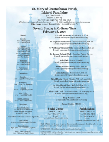 St. Mary of Czestochowa Parish Iskierki Parafialne 3010 South 48th Ct. Cicero, IL 60804 Tel. 708-652-0948 Fax. 708-652-0646 Website: www.stmaryofczestochowa.org E- Mail: [email protected] Office Hours: Monday through Friday - 9:00 AM to 5:00 PM Seventh Sunday in Ordinary Time February 18, 2007 Masses: Saturday 8:00 AM (English) 5:00 PM (English) Sunday 7:30 AM (English) 9:00 AM (English) 10:30 AM (Polish) 12:30 PM (Spanish) 5:00 PM (Spanish) 7:00 PM (Polish) Weekdays 7:00 AM (English) 8:00 AM (English) First Fridays 7:00 PM (Polish) Confessions: Saturday 4:00 – 4:45 PM (Trilingual) Wednesday 7:00 – 8:00 PM (Spanish) Sunday 10:00 – 10:30 AM (Polish) First Friday 6:30 – 7:00 PM (Polish) Fr. Radek Jaszczuk CSsR - Pastor, Ext. 28 E-mail: [email protected] Fr. Zbigniew Pienkos CSsR - Associate Pastor, Ext. 26 E-mail: [email protected] Fr. Waldemar Wieladek CSsR - Associate Pastor, Ext. 27 E-mail: [email protected] Fr. Tomasz Zielinski CSsR - Associate Pastor, Ext. 29 E-mail: [email protected] Alois Theis - School Principal E-mail: [email protected] Jessica Navarro - Receptionist, Ext. 20 E-mail: [email protected] Gabriela Garcia - Receptionist, Ext. 20 E-mail: [email protected] Witold Socha - Music Director, Tel. 708-430-8816 E-mail: [email protected] Sr. Magdalene Kabat - Bulletin Editor, Ext 31 E-mail: [email protected] Alice Krzak - Web Communications, Tel. 708-484-2640 E-Mail: [email protected] Fourth Saturday 7:00 – 8:00 PM (Polish) Mary Warchol - CCD E-mail: [email protected] Devotions: Sophie Schultz - SPRED Every Wednesday The entire day of adoration of the Blessed Sacrament 8:30 AM - 7:00 PM 7:00 PM Prayer Group-Adoration (Spanish) First Fridays 8:30-9:30 AM Holy Hour (English) First Saturdays 8:30-9:00 AM Adoration (English) Every Fourth Saturday 7:00 PM Prayer Vigil (Polish) Social Center Parish School 5000 W. 31st St. Tel. 708-652-7118 3001 S. 49th Ave. Tel. 708-656-5010 Fax 708-656-4043 E-mail: [email protected] E-mail: [email protected] SICK CALLS - In all cases of serious illness or accidents, a priest should be called at once. Holy Communion will be brought to the sick upon request. MARRIAGES - Should be arranged at least 6 months in advance. NEWCOMERS - All new families / individuals may register by stopping at the rectory or by calling the parish secretary ext. 20. Sunday Iskierki Parafialne MASS INTENTIONS February 18, Seventh Sunday in Ordinary Time 7:30 †Ben Pugno ( Mrs. & Mrs. Florian Kanikula) †Helen Natonski (Marcy Pugno & family) 9:00 †Gabino Luna (family) †Juan & Jesse Aguilera (family) †Tony Aguilera (family) †Lorraine Kelly (Mary Warchol) †Albina Mozdzen (Mary Warchol) 10:30 O opiekę M.B. i Boże bł. dla Juleńke w jej pierwsze urodziny †Janusz Ślęzak †Bernard Możdżeń †Maria Wiatr (4 rocz. śm.) †Stanisław Nieć (28 rocz. śm.) †Maria i Zdisław Maćkowiak †Michał Ciesla (4 rocz. śm.) †Bronisława Arast (Ona) †Jan Arast 12:30 Presentación de 3 años de Jacqueline Nuñez Presentación de 3 años de Alondra Ramirez †Alondra Herrera (Isais family) †Rafael Chavez (Olivia Martinez & Hilda M.) †Martha Perez (Nietas e hija) †Maria Hernandez (Rogelio Barrez y familia) 5PM Por los feligreses 7PM For the poor souls in the Book of Remembrance February 19, Monday, Weekday 7:00 †Ann Mietlicki (family) 8:00 †Florence Stachowiak (Bob Krolak) February 20, Tuesday, Weekday 7:00 †Rita I Tesar ..8:00 †Ed Koch (Lawry Natonski) February 21, Wednesday, Ash Wednesday 7:00 †Deceased members of the Tesar/Martin Family 8:00 †Eileen Maticka (family & friends 11:00 Bilingual Eng & Spanish Service 4:00 Bilingual English & Spanish Service 6:00 Spanish Mass 8:00 Polish Mass February 22, Thursday, Chair of St. Peter, apostle 7:00 †Deceased members of Cristman family 8:00 †Helen Natonski (son, Lawry) February 23, Friday,Polycarp, bishop & martyr 7:00 †Deceased members of Adams family 8:00 †Rita Tesar February 24, Saturday, Lenten Weekday 8:00 †Clara Kanikula Treece (Mr. & Mrs. Florian Kanikula) 5:00 Stolarski Family (Cele Mlyniec) †Mildred Borek (family) †Ted & Stanley Walkowiak (family) †Eleanore Firlick (Ed Firlick †Mildred Borek (family) †Anne Stachnik (family) 7PM Polish Vigil February 25, First Sunday of Lent 7:30 †Richard Pusateri (friend) 9:00 †Mike Vavrek (family) 10:30 †Janusz Ślęzak †Karol Weglarz (Zawadka family) †Marianna Staniszewska (12 rocz. śm.) Jan i Honorata Chlopek †Kazimierz Kokot (33-a rocz,śm.) †Jan Maturski ( 40-a rocz. śm.) 12:30 Por los feligreses 5:00 Por los feligreses 7:00 For the poor souls in the Book of Remembrance Lector Schedule Saturday, February 24, 2007 5PM Adam Jasinski, Joseph Graham Sunday, February 25, 2007 7:30 John Kociolko 9:00 Helen Cison, Kim Tross 10:30 Andrzej Szudziński, Alicja Krzak 12:30 Juan Rodriguez, Carmen Soto Marisol Ortiz, Linda Ramirez 5:00 Norma Rodriguez, Enrique Garcia, Umberto Tellez 7:00 - Eucharistic Ministers Saturday, February 24, 2007 5PM Joanne & Larry Napoletano, Sunday, February 25, 2007 7:30 Ed Hennessy 9:00 Christine Zaragoza, Myra Rodriguez John Kulaga, Georgia Czarnecki Joanne Napoletano, Larry Napoletano 10:30 Priests & Polish ministers 12:30 Vicente Saldana, Mariana Garcia 5:00 Margarita Morales, Maria Cruz Rodriguez 7:00 Priests ETERNAL REST………………. Bernard Sundwall May God who called you take you home. St. Mary of Czestochowa Sunday Collection February 11, 2007 SISTER BERNIE’S BINGO BASH! Hold on to your Bingo Card! There is just one week left to purchase your tickets for the professional, interactive Off-Broadway Comedy Show: SISTER BERNIE’S BINGO BASH! This event will be held at the Social Center on Sunday, February 25,2007. Doors will open at 1:30pm and Showtime is at 2:30pm. Tickets are available at the rectory during office hours. Tickets will also be available after all Masses or by calling Mary Warchol @ (708) 6524548. Advance tickets are $20 and tickets purchased at the door will sell for 