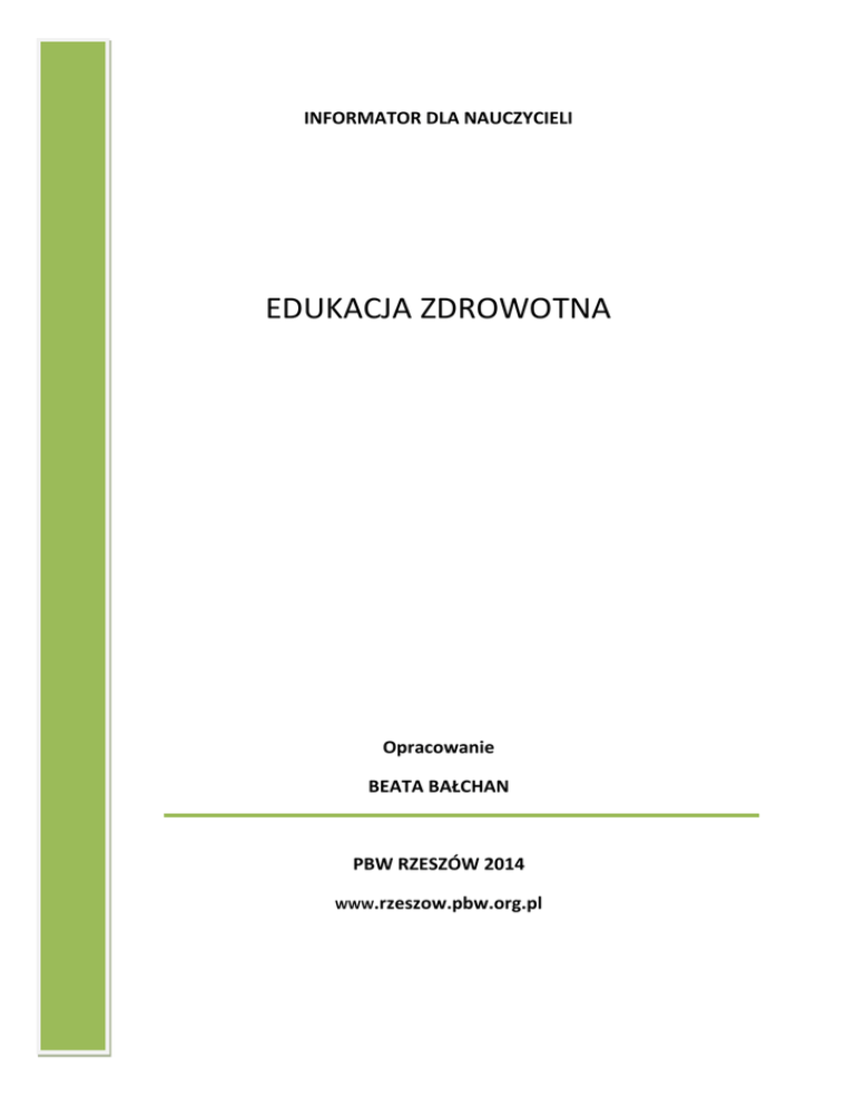 INFORMATOR DLA NAUCZYCIELI EDUKACJA ZDROWOTNA Opracowanie BEATA BAŁCHAN PBW RZESZÓW 2014 WWW.rzeszow.pbw.org.pl Edukacja zdrowotna to proces dydaktyczno-wychowawczy, w którym dzieci i młodzież uczą się jak żyć, aby zachować i doskonalić zdrowie własne i innych ludzi oraz tworzyć środowisko sprzyjające zdrowiu, w przypadku wystąpienia choroby lub niepełnosprawności aktywnie uczestniczyć w jej leczeniu lub rehabilitacji, radzić sobie i zmniejszać jej negatywne skutki. Edukacja zdrowotna jest podstawą szkolnego programu profilaktyki. Celem edukacji zdrowotnej w szkole jest pomoc uczniom w: -poznawaniu siebie, śledzeniu przebiegu swojego rozwoju, identyfikowaniu i rozwiązywaniu własnych problemów zdrowotnych -zrozumieniu, czym jest zdrowie, od czego zależy, dlaczego i jak należy o nie dbać - rozwijaniu poczucia odpowiedzialności za zdrowie własne i innych ludzi - wzmacnianiu poczucia własnej wartości i wiary w swoje możliwości - rozwijaniu umiejętności osobistych i społecznych, sprzyjających dobremu samopoczuciu i pozytywnej adaptacji do zadań i wyzwań codziennego życia - przygotowaniu się do uczestnictwa w działaniach na rzecz zdrowia i tworzenia zdrowego środowiska w domu, szkole, miejscu pracy, społeczności lokalnej. Pojęcie „edukacja prozdrowotna” pojawiło się w podstawie programowej w drugiej połowie lat 90-tych. Reforma z 1999 roku ukształtowała „ścieżki edukacyjne”, wśród których znalazła się edukacja prozdrowotna. W wyniku reformy z 2008 roku zrezygnowano ze ścieżek. Postulowano utworzenie nowego przedmiotu: edukacja zdrowotna, ale niestety nie udało się tego przeforsować. MEN wprowadziło tylko zapis w preambule podstawy programowej: „Ważnym zadaniem szkoły jest także edukacja zdrowotna, której celem jest kształtowanie u uczniów nawyków (postawy) dbania o zdrowie własne i innych ludzi i tworzenia środowiska sprzyjającego zdrowiu”. Przedmiotem wiodącym w realizacji tematu zostało wychowanie fizyczne. Wymagania szczegółowe dotyczące różnych aspektów zdrowia uwzględniono również w większości przedmiotów. I etap edukacyjny (klasy I-III) - wyodrębniono obszar: „wychowanie fizyczne i edukacja zdrowotna”. Na tym etapie nauczania edukacja zdrowotna jest jednym z wielu obszarów kształcenia zintegrowanego. Wymagania na koniec I etapu dotyczą głównie zdrowia fizycznego, w tym: troski o ciało (higiena osobista, dbałość o postawę ciała), zachowań sprzyjających zdrowiu (właściwe żywienie, aktywność fizyczna, poddawanie się szczepieniom ochronnym), zachowania bezpieczeństwa (w czasie zajęć ruchowych, w kontaktach z lekami i substancjami chemicznymi) i szukania pomocy w sytuacjach zagrożenia zdrowia lub życia, właściwego zachowania w chorobie, dbałości o zdrowie i bezpieczeństwo własne i innych, kontrolowania zdrowia, przestrzegania zaleceń lekarza i stomatologa, bezpieczeństwa w ruchu drogowym, relacji i współpracy z innymi, pomagania potrzebującym, ochrony środowiska przyrodniczego. II etap edukacyjny (klasy IV-VI szkoły podstawowej) wymagania szczegółowe, dotyczące bezpośrednio lub pośrednio edukacji zdrowotnej, znajdują się w wielu przedmiotach, zwłaszcza w przyrodzie, wychowaniu fizycznym i języku obcym nowożytnym. Dotyczą one dbałości o ciało, zdrowie oraz środowisko, z dominacją wymagań z zakresu zdrowia fizycznego. W podstawie programowej wychowania fizycznego uwzględniono: • bezpieczeństwo (w czasie zajęć ruchowych, pobytu nad wodą, w górach, w ruchu drogowym) oraz sposoby postępowania w zagrożeniach zdrowia lub życia, • troska o ciało (hartowanie i ochrona przed nadmiernym nasłonecznieniem). Edukacja zdrowotna w klasach IV-VI szkoły podstawowej wygląda więc podobnie jak w poprzedniej podstawie programowej. III i IV etap edukacyjny (gimnazja i szkoły ponadgimnazjalne) – wyodrębniono edukację zdrowotną jako jeden z bloków tematycznych realizowanych na wielu przedmiotach. Osiągnięcie zamierzonych celów wymaga podejmowania różnorodnych działań w ramach programu dydaktycznego, wychowawczego i szkolnego programu profilaktyki. Jest to proces długotrwały, wymaga sporego wysiłku nauczycieli, jak również zaangażowania samych uczniów i ich rodziców, gdyż skuteczność edukacji zdrowotnej głównie zależy od tego, czy dzieci przeniosą do swego codziennego życia to, czego uczą się w szkole. Niniejszy informator zawiera książki i artykuły znajdujące się w zbiorach Pedagogicznej Biblioteki Wojewódzkiej w Rzeszowie, a także wybór stron internetowych dotyczących tematu. Oznaczenia przy sygnaturach: WypRz – Wypożyczalnia Rzeszów ul. Gałęzowskiego 4 ; CzytR – Czytelnia Rzeszów ul. Towarnickiego 3. Książki 1. ABC sześciolatka : przyroda, zdrowie, komunikacja / Danuta Piotrowska ; il. Danuta Cesarska. - Warszawa : Wydawnictwa Szkolne i Pedagogiczne, 1998. Sygn. CzytR 34694 B 2. Biologia : program nauczania z elementami ścieżek edukacyjnych : prozdrowotnej i ekologicznej w klasach 1-3 gimnazjum (III etap kształcenia) / Danuta Cichy, Ilona ŻeberDzikowska. - Bielsko-Biała : "Debit", cop.1999. Sygn. CzytR 35299 B 3. Biorę odpowiedzialność : program profilaktyczno-edukacyjny / Teresa Jadczak-Szumiło, Katarzyna Kałamajska-Liszcz. - Warszawa : Parpamedia Wydawnictwo Edukacyjne, 2009. Sygn. CzytR 233832 4. Budowanie kompetencji zdrowotnych ludzi w środowisku ich życia : propozycje metodyczne dla pedagogów, nauczycieli, wychowawców i pracowników medycznych, wskazówki dla rodziców / Joanna Bulska. - Toruń : "Akapit", 2008. Sygn. CzytR 234054 5. Człowiek a środowisko : wybrane zagadnienia z zakresu wychowania zdrowotnego / Lesław Grzegorczyk ; Wyższa Szkoła Pedagogiczna w Rzeszowie. - Rzeszów : Wyższa Szkoła Pedagogiczna, 1993. Sygn. CzytR 215233, WypRz 215234, WypRz 215235, 6. Czynniki determinujące przebieg, jakość i efekty wychowania zdrowotnego dzieci 6-11letnich w
