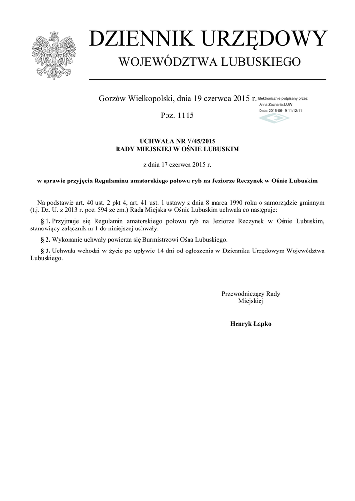 DZIENNIK URZĘDOWY WOJEWÓDZTWA LUBUSKIEGO Gorzów Wielkopolski, dnia 19 czerwca 2015 r. Elektronicznie podpisany przez: Anna Zacharia; LUW Data: 2015-06-19 11:12:11 Poz. 1115 UCHWAŁA NR V/45/2015 RADY MIEJSKIEJ W OŚNIE LUBUSKIM z dnia 17 czerwca 2015 r. w sprawie przyjęcia Regulaminu amatorskiego połowu ryb na Jeziorze Reczynek w Ośnie Lubuskim Na podstawie art. 40 ust. 2 pkt 4, art. 41 ust. 1 ustawy z dnia 8 marca 1990 roku o samorządzie gminnym (t.j. Dz. U. z 2013 r. poz. 594 ze zm.) Rada Miejska w Ośnie Lubuskim uchwala co następuje: § 1. Przyjmuje się Regulamin amatorskiego połowu ryb na Jeziorze Reczynek w Ośnie Lubuskim, stanowiący załącznik nr 1 do niniejszej uchwały. § 2. Wykonanie uchwały powierza się Burmistrzowi Ośna Lubuskiego. § 3. Uchwała wchodzi w życie po upływie 14 dni od ogłoszenia w Dzienniku Urzędowym Województwa Lubuskiego. Przewodniczący Rady Miejskiej Henryk Łapko Dziennik Urzędowy Województwa Lubuskiego –2– Poz. 1115 Załącznik nr 1 do Uchwały Nr V/45/2015 Rady Miejskiej w Ośnie Lubuskim z dnia 17 czerwca 2015 r. REGULAMIN AMATORSKIEGO POŁOWU RYB NA JEZIORZE RECZYNEK W OŚNIE LUBUSKIM I. Postanowienia ogólne. 1. Regulamin Amatorskiego Połowu Ryb, zwany dalej Regulaminem, stanowi zbiór przepisów dotyczących zasad uprawiania wędkarstwa w wodach jeziora Reczynek w Ośnie Lubuskim. Postanowienia regulaminu obowiązują wszystkich wędkujących w wodach jeziora Reczynek w Ośnie Lubuskim. II. Obowiązki wędkującego w wodach jeziora Reczynek. 1. Wędkujący w wodach jeziora Reczynek są zobowiązani do przestrzegania przepisów ustawy z dnia 18 kwietnia 1985 r. o rybactwie śródlądowym (t.j. Dz. U. z 2009 r., nr 189, poz. 1471 z późn. zmianami), rozporządzenia Ministra Rolnictwa i Rozwoju Wsi z dnia 12 listopada 2001 r. w sprawie połowu ryb oraz warunków chowu, hodowli i połowu innych organizmów żyjących w wodzie oraz niniejszego Regulaminu. 2. W czasie wędkowania wędkarz ma obowiązek posiadać przy sobie: ważną kartę wędkarską oraz dowód wpłaty za amatorski połów ryb w jeziorze Reczynek uiszczonej w kasie Urzędu Miejskiego w Ośnie Lubuskim lub u inkasenta. Wędkujący jest zobowiązany do okazania dokumentów, sprzętu wędkarskiego i ryb na żądanie kontrolujących. 3. Przy wyborze i zajmowaniu miejsca na łowisku pierwszeństwo ma ten wędkarz, który zajął je wcześniej. 4. W przypadku odbywania się zawodów wędkarskich, wędkarz nie biorący udziału w zawodach musi opuścić teren, na którym są zawody. 5. W czasie wędkowania wędki muszą być pod stałym nadzorem ich użytkownika. Sprzęt wędkarski pozostawiony bez opieki oraz zagrażający bezpieczeństwu korzystających z wody zostanie usunięty. 6. Wędkarz ma obowiązek utrzymać czystość na swoim stanowisku i w promieniu 5 m od niego bez względu na to w jakim stanie je zastał. 7. W przypadku zauważenia zanieczyszczenia wody (jak np. śnięte ryby, zmiana koloru wody lub inne zmiany budzące podejrzenie zanieczyszczenia), wędkarz jest zobowiązany bezzwłocznie zawiadomić Urząd Miejski w Ośnie Lubuskim tel. 957571335. 8. Zabrania się podnoszenia jakiegokolwiek sprzętu rybackiego, nie będącego własnością wędkującego. O zauważonym, a podejrzanym o pochodzenie kłusownicze, sprzęcie rybackim należy niezwłocznie powiadomić Policję lub Urząd Miejski w Ośnie Lubuskim. 9. W przypadku wędkowania ze sprzętu pływającego, wędkować wolno tylko z zarejestrowanego i spełniającego normy bezpieczeństwa sprzętu pływającego. III. Zasady wędkowania. 1. Wędkarz ma obowiązek posługiwać się wędką składającą się z wędziska o długości co najmniej 30 cm, do którego przymocowana jest linka zakończona: a) jednym haczykiem z przynętą, b) w metodzie spinningowej – sztuczną przynętą wyposażoną w nie więcej niż dwa haczyki (haczyk może mieć nie więcej niż cztery ostrza rozstawione w taki sposób aby nie wykraczały poza obwód koła o średnicy 30 mm); c) przy połowie ryb spod lodu – jednym haczykiem z przynętą (haczyk nie może mieć więcej niż trzy ostrza rozstawione w taki sposób, aby nie wykraczały poza obwód koła o średnicy 20 mm); 2. Wędkowanie: a) w wodach jeziora Reczynek z brzegu lub z pomostu dozwolone jest przez całą dobę. Dziennik Urzędowy Województwa Lubuskiego –3– Poz. 1115 b) wędkowanie z łodzi i z lodu jest dozwolone tylko w porze dziennej, tj. od świtu do zmierzchu, natomiast w nocy jest zabronione. 3. Dozwolone metody połowu: a) gruntowo – spławikowa (dozwolona równocześnie na dwie wędki, każda z linką zakończoną jednym haczykiem z przynętą naturalną); b) spinningowa (dozwolona jest na jedną wędkę trzymana w rękach zakończoną jedną sztuczną przynętą, uzbrojoną w nie więcej niż dwa haczyki; nie wolno stosować żadnych dodatkowych wskaźników brań instalowanych na lince); c) podlodowa (dozwolona tylko jedną wędką; otwory w lodzie o średnicy nie większej niż 20 cm; zabrania się połowu ryb w porze nocnej, tj. od zmierzchu do świtu; zabrania się stosować martwej i żywej ryby jako przynęty; złowione ryby przeznaczone do zabrania należy uśmiercić bezpośrednio po złowieniu; zabite ryby należy przechowywać w pojemnikach); 4. Wymiary ochronne ryb (wymiar ochronny ryby stanowi jej długość od początku głowy do najdalszego końca płetwy ogonowej): a) okoń – do 18 cm, b) karp – do 30 cm, c) szczupak – do 50 cm, d) węgorz – do 50 cm, e) sum – do 70 cm, f) amur – do 30 cm, g) wzdręga – do 15 cm, h) lin – do 25 cm. 4.1. Ryby niewymiarowe lub złowione w okresie ochronnym należy bezzwłocznie wpuścić do wody. 5. Okresy ochronne ryb: a) szczupak – 1 stycznia – 30 kwietnia, b) sum – 1 listopada – 30 czerwca, c) węgorz – 15 czerwca – 15 lipca. 6. Limity ilościowe ryb (ilość ryb dozwolona do zabrania z łowiska w ciągu doby w godz. 0.00 – 24.00): a) węgorz – 2 szt., b) s