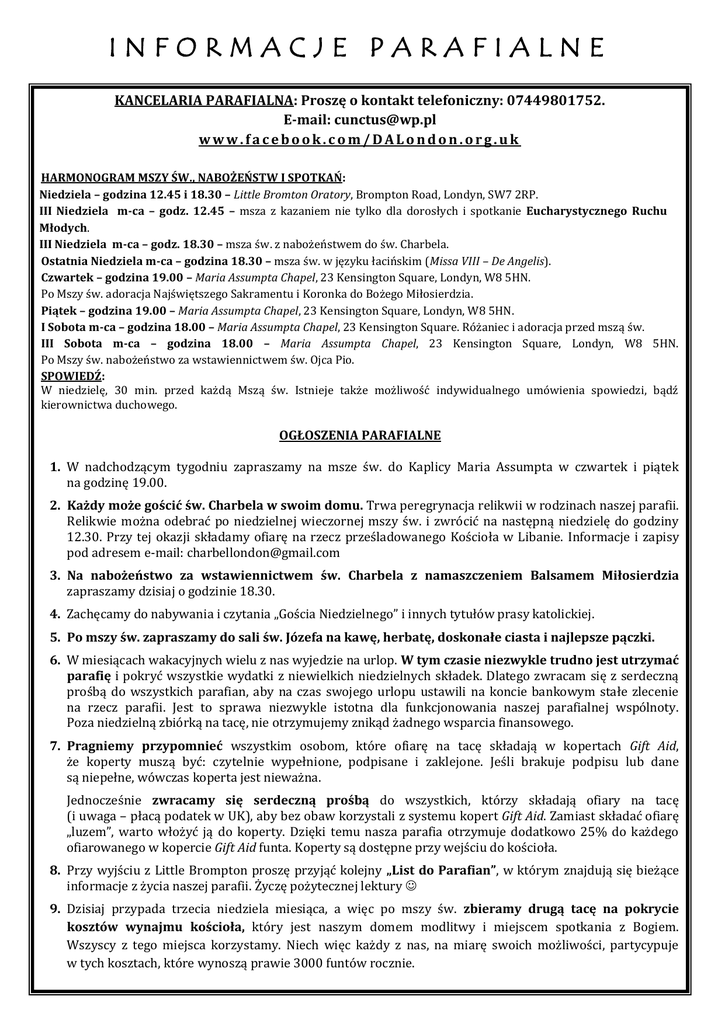 INFORMACJE PARAFIALNE KANCELARIA PARAFIALNA: Proszę o kontakt telefoniczny: 07449801752. E-mail: [email protected] www.facebook.com/DALondon.org.uk HARMONOGRAM MSZY ŚW., NABOŻEŃSTW I SPOTKAŃ: Niedziela – godzina 12.45 i 18.30 – Little Bromton Oratory, Brompton Road, Londyn, SW7 2RP. III Niedziela m-ca – godz. 12.45 – msza z kazaniem nie tylko dla dorosłych i spotkanie Eucharystycznego Ruchu Młodych. III Niedziela m-ca – godz. 18.30 – msza św. z nabożeństwem do św. Charbela. Ostatnia Niedziela m-ca – godzina 18.30 – msza św. w języku łacińskim (Missa VIII – De Angelis). Czwartek – godzina 19.00 – Maria Assumpta Chapel, 23 Kensington Square, Londyn, W8 5HN. Po Mszy św. adoracja Najświętszego Sakramentu i Koronka do Bożego Miłosierdzia. Piątek – godzina 19.00 – Maria Assumpta Chapel, 23 Kensington Square, Londyn, W8 5HN. I Sobota m-ca – godzina 18.00 – Maria Assumpta Chapel, 23 Kensington Square. Różaniec i adoracja przed mszą św. III Sobota m-ca – godzina 18.00 – Maria Assumpta Chapel, 23 Kensington Square, Londyn, W8 5HN. Po Mszy św. nabożeństwo za wstawiennictwem św. Ojca Pio. SPOWIEDŹ: W niedzielę, 30 min. przed każdą Mszą św. Istnieje także możliwość indywidualnego umówienia spowiedzi, bądź kierownictwa duchowego. OGŁOSZENIA PARAFIALNE 1. W nadchodzącym tygodniu zapraszamy na msze św. do Kaplicy Maria Assumpta w czwartek i piątek na godzinę 19.00. 2. Każdy może gościć św. Charbela w swoim domu. Trwa peregrynacja relikwii w rodzinach naszej parafii. Relikwie można odebrać po niedzielnej wieczornej mszy św. i zwrócić na następną niedzielę do godziny 12.30. Przy tej okazji składamy ofiarę na rzecz prześladowanego Kościoła w Libanie. Informacje i zapisy pod adresem e-mail: [email protected] 3. Na nabożeństwo za wstawiennictwem św. Charbela z namaszczeniem Balsamem Miłosierdzia zapraszamy dzisiaj o godzinie 18.30. 4. Zachęcamy do nabywania i czytania „Gościa Niedzielnego” i innych tytułów prasy katolickiej. 5. Po mszy św. zapraszamy do sali św. Józefa na kawę, herbatę, doskonałe ciasta i najlepsze pączki. 6. W miesiącach wakacyjnych wielu z nas wyjedzie na urlop. W tym czasie niezwykle trudno jest utrzymać parafię i pokryć wszystkie wydatki z niewielkich niedzielnych składek. Dlatego zwracam się z serdeczną prośbą do wszystkich parafian, aby na czas swojego urlopu ustawili na koncie bankowym stałe zlecenie na rzecz parafii. Jest to sprawa niezwykle istotna dla funkcjonowania naszej parafialnej wspólnoty. Poza niedzielną zbiórką na tacę, nie otrzymujemy znikąd żadnego wsparcia finansowego. 7. Pragniemy przypomnieć wszystkim osobom, które ofiarę na tacę składają w kopertach Gift Aid, że koperty muszą być: czytelnie wypełnione, podpisane i zaklejone. Jeśli brakuje podpisu lub dane są niepełne, wówczas koperta jest nieważna. Jednocześnie zwracamy się serdeczną prośbą do wszystkich, którzy składają ofiary na tacę (i uwaga – płacą podatek w UK), aby bez obaw korzystali z systemu kopert Gift Aid. Zamiast składać ofiarę „luzem”, warto włożyć ją do koperty. Dzięki temu nasza parafia otrzymuje dodatkowo 25% do każdego ofiarowanego w kopercie Gift Aid funta. Koperty są dostępne przy wejściu do kościoła. 8. Przy wyjściu z Little Brompton proszę przyjąć kolejny „List do Parafian”, w którym znajdują się bieżące informacje z życia naszej parafii. Życzę pożytecznej lektury 9. Dzisiaj przypada trzecia niedziela miesiąca, a więc po mszy św. zbieramy drugą tacę na pokrycie kosztów wynajmu kościoła, który jest naszym domem modlitwy i miejscem spotkania z Bogiem. Wszyscy z tego miejsca korzystamy. Niech więc każdy z nas, na miarę swoich możliwości, partycypuje w tych kosztach, które wynoszą prawie 3000 funtów rocznie. WIADOMOŚCI PARAFIALNE 17.07.2016 XVI NiedzielaZwykła Zwykła nr 121 (621) 04.07. – 11.07.2010 XIV Niedziela Lokalna Polska Misja Katolicka Chaplaincy przy Little Brompton Oratory w Londynie Tel: 07449801752 www.facebook.com/DALondon.org.uk ks. prałat Stefan Wylężek ks. Bartosz Rajewski Agnieszka Runowska – Rektor Polskiej Misji Katolickiej w Anglii i Walii – Proboszcz i Duszpasterz Akademicki – Prezes Rady Parafialnej I n t e n c j e m s z a l n e Niedziela – 17 lipca – XVI Niedziela Zwykła 12.45 – Śp. Henryk Minkiewicz 18.30 – W int. Esterki Żurek – za wstawiennictwem Św. Charbela – dziękując Bogu za dar życia córki i z prośbą o opiekę na każdy dzień oraz Boże bł. Proszę rodzice. Z Ewangelii wg św. Łukasza (Łk 10, 38-42) Jezus przyszedł do jednej wsi. Tam pewna niewiasta, imieniem Marta, przyjęła Go w swoim domu. Miała ona siostrę, imieniem Maria, która usiadłszy u nóg Pana, słuchała Jego słowa. Marta zaś uwijała się około rozmaitych posług. A stanąwszy przy Nim, rzekła: «Panie, czy Ci to obojętne, że moja siostra zostawiła mnie samą przy usługiwaniu? Powiedz jej, żeby mi pomogła». A Pan jej odpowiedział: «Marto, Marto, martwisz się i niepokoisz o wiele, a potrzeba mało albo tylko jednego. Maria obrała najlepszą cząstkę, której nie będzie pozbawiona». Czwartek – 21 lipca – Św. Apolinarego, biskupa 19.00 – INTENCJA WOLNA Piątek – 22 lipca – Św. Marii Magdaleny 19.00 – INTENCJA WOLNA Niedziela – 24 lipca – XVII Niedziela Zwykła 12.45 – INTENCJA WOLNA 18.30 – W int. Małgorzaty i Piotra (z ok. 5r. ślubu) – o Boże bł., potrzebna łaski oraz wzrost w miłości małżeńskiej i rodzinnej. Czwartek – 28 lipca – Św. Charbela 19.00 – NIE MA MSZY ŚW. Piątek – 29 lipca – Św. Marty 19.00 – NIE MA MSZY ŚW. Niedziela – 31 lipca – XVIII Niedziela Zwykła 12.45 – INTENCJA WOLNA 18.30 – Msza św. dziękczynna za łaskę zdrowia i uchronienie od choroby nowotworowej oraz z prośbą o dalsze obfite błogosławieństwo, wszelkie potrzebne łaski, zwłaszcza zdrowie.