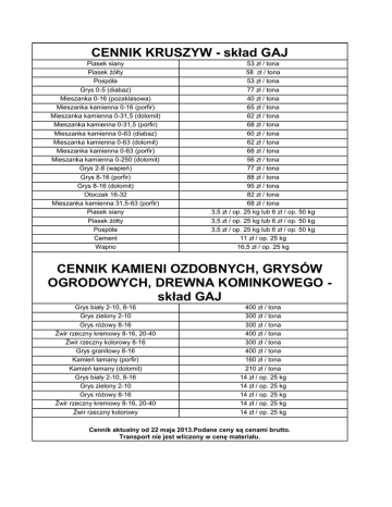 CENNIK KRUSZYW - skład GAJ Piasek siany Piasek żółty Pospóła Grys 0-5 (diabaz) Mieszanka 0-16 (pozaklasowa) Mieszanka kamienna 0-16 (porfir) Mieszanka kamienna 0-31,5 (dolomit) Mieszanka kamienna 0-31,5 (porfir) Mieszanka kamienna 0-63 (diabaz) Mieszanka kamienna 0-63 (dolomit) Mieszanka kamienna 0-63 (porfir) Mieszanka kamienna 0-250 (dolomit) Grys 2-8 (wapień) Grys 8-16 (porfir) Grys 8-16 (dolomit) Otoczak 16-32 Mieszanka kamienna 31,5-63 (porfir) Piasek siany Piasek żółty Pospóła Cement Wapno 53 zł / tona 58 zł / tona 53 zł / tona 77 zł / tona 40 zł / tona 65 zł / tona 62 zł / tona 68 zł / tona 60 zł / tona 62 zł / tona 68 zł / tona 56 zł / tona 77 zł / tona 88 zł / tona 95 zł / tona 82 zł / tona 68 zł / tona 3,5 zł / op. 25 kg lub 6 zł / op. 50 kg 3,5 zł / op. 25 kg lub 6 zł / op. 50 kg 3,5 zł / op. 25 kg lub 6 zł / op. 50 kg 11 zł / op. 25 kg 16,5 zł / op. 25 kg CENNIK KAMIENI OZDOBNYCH, GRYSÓW OGRODOWYCH, DREWNA KOMINKOWEGO skład GAJ Grys biały 2-10, 8-16 Grys zielony 2-10 Grys różowy 8-16 Żwir rzeczny kremowy 8-16, 20-40 Żwir rzeczny kolorowy 8-16 Grys granitowy 8-16 Kamień łamany (porfir) Kamień łamany (dolomit) Grys biały 2-10, 8-16 Grys zielony 2-10 Grys różowy 8-16 Żwir rzeczny kremowy 8-16, 20-40 Żwir rzeczny kolorowy 400 zł / tona 300 zł / tona 300 zł / tona 400 zł / tona 300 zł / tona 400 zł / tona 160 zł / tona 210 zł / tona 14 zł / op. 25 kg 14 zł / op. 25 kg 14 zł / op. 25 kg 14 zł / op. 25 kg 14 zł / op. 25 kg Cennik aktualny od 22 maja 2013.Podane ceny są cenami brutto. Transport nie jest wliczony w cenę materiału.