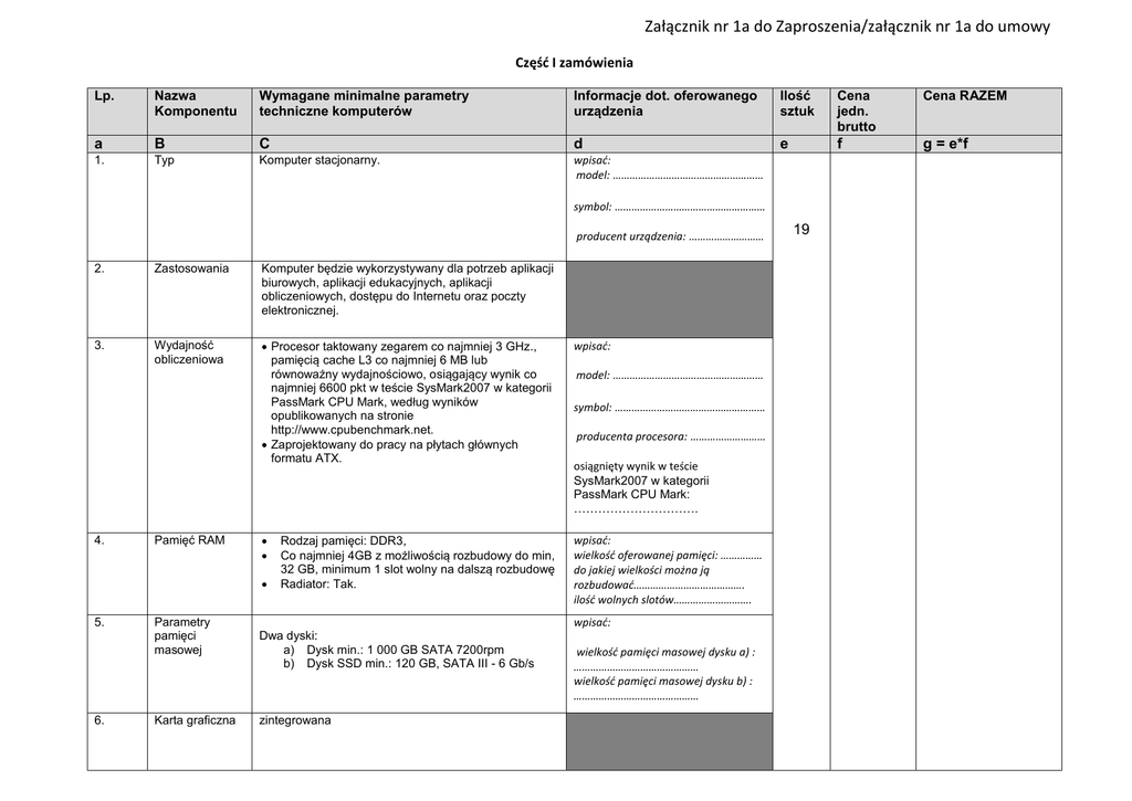 Załącznik nr 1a do Zaproszenia/załącznik nr 1a do umowy Część I zamówienia Lp. Nazwa Komponentu Wymagane minimalne parametry techniczne komputerów Informacje dot. oferowanego urządzenia Ilość sztuk Cena jedn. brutto Cena RAZEM a B C d e f g = e*f 1. Typ Komputer stacjonarny. wpisać: model: ……………………………………………… symbol: ……………………………………………… producent urządzenia: ……………………… 2. Zastosowania Komputer będzie wykorzystywany dla potrzeb aplikacji biurowych, aplikacji edukacyjnych, aplikacji obliczeniowych, dostępu do Internetu oraz poczty elektronicznej. 3. Wydajność obliczeniowa Procesor taktowany zegarem co najmniej 3 GHz., pamięcią cache L3 co najmniej 6 MB lub równoważny wydajnościowo, osiągający wynik co najmniej 6600 pkt w teście SysMark2007 w kategorii PassMark CPU Mark, według wyników opublikowanych na stronie http://www.cpubenchmark.net. Zaprojektowany do pracy na płytach głównych formatu ATX. wpisać: wpisać: wielkość oferowanej pamięci: …………… do jakiej wielkości można ją rozbudować…………………………………. ilość wolnych slotów………………………. 4. Pamięć RAM 5. 6. Parametry pamięci masowej Karta graficzna Rodzaj pamięci: DDR3, Co najmniej 4GB z możliwością rozbudowy do min, 32 GB, minimum 1 slot wolny na dalszą rozbudowę Radiator: Tak. model: ……………………………………………… symbol: ……………………………………………… producenta procesora: ……………………… osiągnięty wynik w teście SysMark2007 w kategorii PassMark CPU Mark: …………………………. wpisać: Dwa dyski: a) Dysk min.: 1 000 GB SATA 7200rpm b) Dysk SSD min.: 120 GB, SATA III - 6 Gb/s zintegrowana wielkość pamięci masowej dysku a) : ……………………………………… wielkość pamięci masowej dysku b) : ……………………………………… 19 Załącznik nr 1a do Zaproszenia/załącznik nr 1a do umowy 7. Zasilacz Zasilacz o mocy min. 600W pracujący w sieci 230V 50/60Hz prądu zmiennego i efektywności min. 85% przy obciążeniu zasilacza na poziomie 50% oraz o efektywności min. 80% przy obciążeniu zasilacza na poziomie 100%, wpisać: model: ……………………………………………… symbol: ……………………………………………… producenta zasilacza : ……………………… 8. Obudowa Typ obudowy Midi Tower, format: ATX, kolor: czarny, Złącza na przednim panelu min.: 1 x mikrofon, 1 x słuchawki, 1 x USB 3.0, certyfikat CE wpisać: model: ……………………………………………… symbol: ……………………………………………… producenta obudowy: ……………………… 9. Wyposażenie multimedialne Karta dźwiękowa zgodna z High Definition. Porty słuchawek i mikrofonu na przednim oraz na tylnym panelu obudowy. wpisać: model: ……………………………………………… symbol: ……………………………………………… producenta karty dźwiękowej: ……………………… 10. Płyta główna Płyta główna –pełen ATX, wyposażona w min. : Liczba portów USB 3.0: 4 Port / Złącze COM: Tak Port / Złącze LPT: Tak Złącza zewnętrzne: 1 x PS/2 Klawiatura/Mysz Combo Złącza zewnętrzne: 1 x D-Sub Złącza zewnętrzne: 1 x DVI-D Złącza zewnętrzne: 1 x HDMI Złącza zewnętrzne: 1 x Głośnik boczny Złącza zewnętrzne: 1 x Głośnik centralny / Subwoofer Złącza zewnętrzne: 1 x Głośnik tylny Złącza zewnętrzne: 1 x Line In Złącza zewnętrzne: 1 x Line Out Złącza zewnętrzne: 1 x MIC Złącza zewnętrzne: 1 x RJ-45 Złącza zewnętrzne: 4 x USB 2.0 Złącza zewnętrzne: 2 x USB 3.0 Złącza dostępne na płycie: 2 x SATA II 3Gb/s Złącza dostępne na płycie: 4 x SATA III 6Gb/s Złącza dostępne na płycie: 2 x USB 2.0/1.1 Złącza dostępne na płycie: 1 x USB 3.0 Złącza dostępne na płycie: 1 x Port szeregowy Złącza dostępne na płycie: 1 x Port równoległy wpisać: model: ……………………………………………… symbol: ……………………………………………… producenta płyty głównej: ……………… …………………………………………………………. Czy płyta posiada określone porty, złącza i system diagnostyczny : TAK/NIE* Załącznik nr 1a do Zaproszenia/załącznik nr 1a do umowy Złącza dostępne na płycie: 1 x System panel Złącza dostępne na płycie: 1 x Przedni panel audio Złącza dostępne na płycie: 1 x Wyjście S/PDIF Złącza dostępne na płycie: 1 x Wejście S/PDIF 11. Zgodność z systemami operacyjnymi i standardami 12. Głośność jednostki Głośność jednostki centralnej mierzona zgodnie z normą ISO 7779 oraz wykazana zgodnie z normą ISO 9296 w pozycji operatora w trybie pracy dysku twardego (WORK) wynosząca maksymalnie 28 dB TAK/NIE* ……………………………………………………… /podać głośność jednostki/ Określono we wzorze umowy 13. Warunki gwarancji 14. Wsparcie techniczne producenta 15. W celu szybkiej weryfikacji usterki w obudowę komputera musi być wbudowany wizualny lub dźwiękowy system diagnostyczny, służący do sygnalizowania i diagnozowania problemów z komputerem i jego komponentami; a w szczególności musi sygnalizować: - awarię BIOS-u, - awarię procesora, - uszkodzenie lub brak pamięci RAM, - uszkodzenie złączy PCI i PCIe, - uszkodzenie kontrolera Video, - uszkodzenie płyty głównej, - uszkodzenie kontrolera USB (Zamawiający dopuszcza zaoferowanie oprogramowania zarządzająco – diagnostycznego dostarczonego przez producenta komputera spełniającego pozostałe wymagania Zamawiającego) Oferowany system diagnostyczny nie może wykorzystywać minimalnej ilości wolnych slotów wymaganych w specyfikacji. Oferowane modele komputerów poprawnie współpracują z systemem operacyjnym Windows Pro 7 oraz Windo