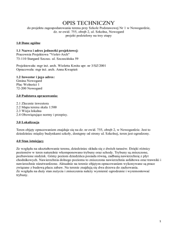 OPIS TECHNICZNY do projektu zagospodarowania terenu przy Szkole Podstawowej Nr 1 w Nowogardzie, dz. nr ewid. 755, obręb 2, ul. Szkolna, Nowogard projekt podzielony na trzy etapy 1.0 Dane ogólne 1.1 Nazwa i adres jednostki projektowej: Pracownia Projektowa "Violet-Arch" 73-110 Stargard Szczec. ul. Szczecińska 59 Projektowała: mgr inż. arch. Wioletta Kmita upr. nr 3/SZ/2001 Opracowała: mgr inż. arch. Anna Kwapień 1.2 Inwestor i jego adres: Gmina Nowogard Plac Wolności 1 72-200 Nowogard 2.0 Podstawa opracowania: 2.1 Zlecenie inwestora 2.2 Mapa terenu skala 1:500 2.3 Wizja lokalna 2.4 Obowiązujące normy i przepisy. 3.0 Lokalizacja Teren objęty opracowaniem znajduje się na dz. nr ewid. 755, obręb 2, w Nowogardzie. Jest to dziedziniec między budynkami szkoły, dostępny od strony ul. Szkolnej, teren jest ogrodzony. 4.0 Stan istniejący Ze względu na ukształtowanie terenu, dziedziniec składa się z dwóch tarasów. Dzięki różnicy poziomów w teren naturalnie wkomponowano trybuny oraz schody. Trybuny są zniszczone, pozbawione siedzisk. Górny poziom dziedzińca posiada równą, zadbaną nawierzchnię z płyt chodnikowych. Nawierzchnia dolnego poziomu to zniszczona nawierzchnia asfaltowa oraz trawniki i nawierzchnie nieutwardzone. Aktualnie na terenie objętym opracowaniem wykonywane są prace związane z budową placu zabaw. Na terenie znajdują się dwa drzewa do zachowania. Ze względu na duży stan zużycia i zniszczenia należy wymienić ogrodzenie i wyremontować trybuny. 1 Widok na wyższy taras dziedzińca. Widok na trybuny i ogrodzenie. . Widok na niższy taras dziedzińca. Widoczne istniejące drzewa do zachowania. 2 5.0 Przedmiot i zakres opracowania Przedmiotem opracowania jest projekt zagospodarowania terenu, podzielony na trzy następujące etapy: I Wymiana ogrodzenia polegający remoncie istniejące murka i umieszczeniu na nim nowego ogrodzenia. II Remont trybun polegający na usunięciu istniejących kamiennych donic, remoncie istniejących kamiennych trybun oraz wykonaniu na nich nowych siedzisk. III Zagospodarowanie terenu polegający na wymianie posadzek, wprowadzeniu schodów terenowych oraz nowych elementów małej architektury, wykonaniu nowych nasadzeń. 6.0 Opis planu zagospodarowania terenu Na działce jako uzupełnienie funkcji oświatowej i rekreacyjnej oraz aby uporządkować cały teren działki szkolnej i sprawić by służył zarówno dzieciom młodszym i starszym, oraz mieszkańcom dzielnicy, zaproponowano nowe zagospodarowanie terenu w granicach ogrodzenia. Projekt przewiduje wymianę starego ogrodzenia, remont istniejących trybun, wymianę nawierzchni posadzki, uporządkowanie i urządzenie zieleni. Opracowanie zakłada wprowadzenie nowych elementów małej architektury takich jak: ławki, stoły, stoły szachowe, karmniki, pojemniki na odpady. Przez teren dziedzińca przebiega instalacja kanalizacji deszczowej, projekt przewiduje wykorzystanie istniejących kratek odwadniających oraz pozostawienie istniejących studni. Nie przewiduje się wycinki istniejących na terenie drzew oraz krzewów. Inwestycja podzielona została na 3 etapy. 6.1 Etap I - wymiana ogrodzenia Istniejące ogrodzenie ze względu na zły stan techniczny i estetyczny przestało spełniać swoje funkcje. Należy wymienić je na nowe. Należy uwzględnić istniejące podziały i różnice terenu, należy zachować murek pod ogrodzeniem. Tam, gdzie wprowadza się nową lokalizację bramy i furtki, murki skorygować. 1) Rozebranie ogrodzeń z siatki w ramach z kątownika, 2) Przecinanie poprzeczne palnikiem - wycięcie słupków ogrodzenia, 3) Demontaż balustrad, 4) Rozebranie ścian z kamieni na zaprawie cementowej, 5) Uzupełnienie zbrojonych czapek murka, 6) Przygotowanie podłoża. Oczyszczenie podłoża, 7) Przygotowanie podłoża. Wyrównanie podłoża na ścianach; warstwa kontaktowa, 8) Układanie płytek klinkierowych w kolorze ciemno brązowym na gotowym podłożu na ścianach metodą kombinowaną - 46-60 płytek na 1 m2 9) Wiercenie otworów o śr. 80 mm techniką diamentową w betonie niezbrojonym- pod słupki ogrodzenia fi 80 na głębokość 20 cm i balustrady na głębokość 15 cm, 10) Osadzenie w betonie części stalowych o masie 10.0 kg- słupki ogrodzenia i balustrady 11) Osadzenie przęseł z siatki w ramach z kształtowników - ogrodzenie z paneli H=1,5 m; Panele H=1,5 m zgrzewane o oczkach 150/100 mm z drutu fi 5 mm ocynkowane i powlekane PCV w kolorze zielonym LxH 2,5x1,5 m 12) Dwukrotne malowanie farbą ftalową balustrad z prętów prostych, 3 13) Montowanie bram z furtkami wysokości 1,8 m; wymiary wrót- 3,25x1,8 m i furtki ,2x1,8 m na gotowych słupkach 14) Wywiezienie gruzu spryzmowanego samochodami skrzyniowymi Zestawienie: - ogrodzenie - długość - furtka 1,2x1,8m – ilość - brama 3,25x1,8m – ilość - słupek h=1,8m– przewidywana ilość - panele h=1,5m– ilość 54mb 2 szt. 2 szt. 28 szt. 23 szt. 6.2 Etap II – remont trybun Istniejące trybuny ze względu na zły stan techniczny i duży stopień zniszczenia wymagają remontu. Trybuny wykonane są z kamienia na zaprawie, część siedziskowa wykonana z cementu. Między trybunami ułożone zostały betonowe płyty chodnikowe. Przy trybunach znajdują się wykonane z kamienia na zaprawie donice, przeznaczone do rozebrania. 1) Rozebranie ścian z kamieni na zaprawie cementowej- rozebranie donic i murków pod nowe donice prefabrykowane, 2) Rozebranie chodników, i przejść dla pieszych z płyt betonowych 35x35x5 cm na podsypce piaskowej- miedzy trybunami, 3) Wywiezienie gruzu spryzmowanego samochodami skrzyniowymi, 4) Rozbiórka elementów konstrukcji betonowych niezbrojonych - skucie nadlewki betonowej z murków kamiennych trybun, 5) Uzupełnienie ścian z kamienia o grubości 40-55 cm lub zamurowanie otworów na zaprawie cementowej - materiały z rozbiórki- 20% całości, 6) Nakrywy attyk, ścian ogniowych o średniej grubości 7 cm - nadlewka na ściany trybun, 7) Spoinowanie m