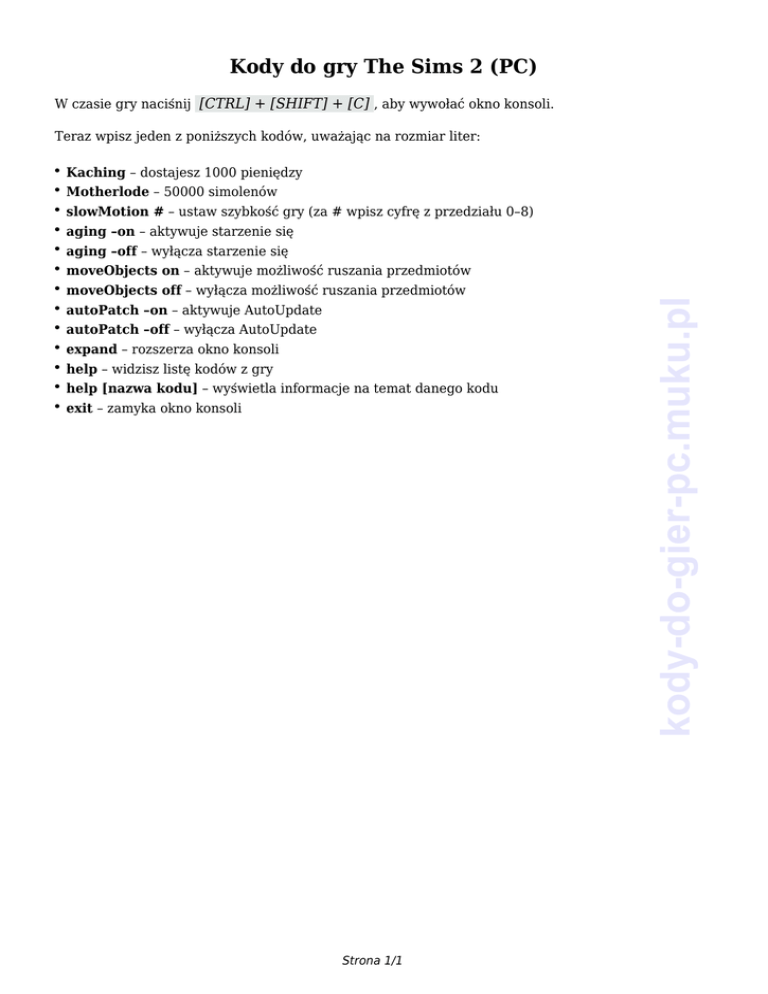 Kody do gry The Sims 2 (PC) W czasie gry naciśnij [CTRL] + [SHIFT] + [C] , aby wywołać okno konsoli. ● Kaching – dostajesz 1000 pieniędzy ● Motherlode – 50000 simolenów ● slowMotion # – ustaw szybkość gry (za # wpisz cyfrę z przedziału 0–8) ● aging –on – aktywuje starzenie się ● aging –off – wyłącza starzenie się ● moveObjects on – aktywuje możliwość ruszania przedmiotów ● moveObjects off – wyłącza możliwość ruszania przedmiotów ● autoPatch –on – aktywuje AutoUpdate ● autoPatch –off – wyłącza AutoUpdate ● expand – rozszerza okno konsoli ● help – widzisz listę kodów z gry ● help [nazwa kodu] – wyświetla informacje na temat danego kodu ● exit – zamyka okno konsoli Strona 1/1 kody-do-gier-pc.muku.pl Teraz wpisz jeden z poniższych kodów, uważając na rozmiar liter: