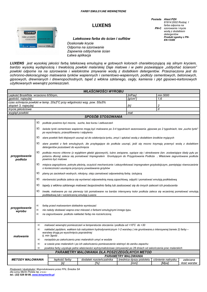 FARBY EMULSYJNE WEWNĘTRZNE Posiada LUXENS PN-C Atest PZH 81914:2002 Rodzaj I farba odporna na szorowanie i mycie wodą z dodatkiem detergentów Produkt zgodny z PNEN-13300 Lateksowa farba do ścian i sufitów Doskonałe krycie Odporna na szorowanie Zapewnia oddychanie ścian Łatwa aplikacja LUXENS jest wysokiej jakości farbą lateksową emulsyjną w gotowych kolorach charakteryzującą się silnym kryciem, bardzo wysoką wydajnością i trwałością powłoki malarskiej Daje matowe i w pełni pozwalające „oddychać ścianom” powłoki odporne na na szorowanie i wielokrotne zmywanie wodą z dodatkiem detergentów. Przeznaczona jest do ochronno-dekoracyjnego malowania tynków wapiennych i cementowo-wapiennych, podłoży cementowych, betonowych, gipsowych, drewnianych i drewnopochodnych, tapet z włókna szklanego, cegły, kamienia i płyt gipsowo-kartonowych użytkowanych wewnątrz pomieszczeń. WŁAŚCIWOŚCI WYROBU Lepkość Brookfilda wrzeciono 6/50rpm, [mPas] min 5000 gęstość, najwyżej czas schnięcia powłoki w temp. 20±20C przy wilgotności wzg. pow. 55±5% stopień 3, najwyżej krycie jakościowe wygląd powłoki [g/cm3] 1,6 [h] 2 II mat SPOSÓB STOSOWANIA • • • • przygotowanie podłoża • • • • • • przygotowanie wyrobu • • • • • malowanie • • • podłoże powinno być mocne, suche, bez kurzu i zatłuszczeń świeże tynki cementowo wapienne mogą być malowane po 3-4 tygodniach sezonowania ,gipsowe po 2 tygodniach, tzw „suche tynki” po wyschnięciu, przeszlifowaniu i odpyleniu stare powłoki farb klejowych usunąć aż do odsłonięcia tynku, zmyć i spłukać wodą z dodatkiem środków myjących stare powłoki z farb emulsyjnych, źle przylegające do podłoża usunąć, jeśli się mocno trzymają przemyć wodą z dodatkiem detergentów pozostawić do wyschnięcia podłoża mocno chłonne (z wyjątkiem gładzi gipsowych), luźno związane, sypiące się i skredowane (tzn. zostawiające ślady pyłu po potarciu dłonią) zaleca się pomalować Impregnatem Gruntującym do Przygotowania Podłoża . Właściwie zagruntowane podłoże powinno być matowe miejsca zagrzybione, pokryte pleśnią, oczyścić mechanicznie i zdezynfekować impregnatem grzybobójczym, pamiętając równocześnie o konieczności usunięcia przyczyny powstawania grzybów plamy po zaciekach wodnych, nikotyny, oleju zamalować odpowiednią farbą izolujacą nierówności podłoża zaleca się wyrównać odpowiednią masą szpachlową, odpylić i pomalować emulsją podkładową tapety z włókna szklanego malować bezpośrednio farbą lub zastosować się do innych zaleceń ich producenta trwałe, malowane po raz pierwszy lub pomalowane na bardzo intensywny kolor podłoża zaleca się wcześniej pomalować emulsją podkładową lub r ozcieńczoną emulsją Luxens farbę przed malowaniem dokładnie wymieszać nie należy dodawać wapna oraz mieszać z farbami emulsyjnymi innego typu. na zagruntowane podłoże nakładać farbę nie rozcieńczoną malować wewnątrz pomieszczeń w temperaturze otoczenia i podłoża od +100C do +30 nakładać pędzlem, wałkiem lub natryskiem hydrodynamicznym 1-2 warstwy ( nie gruntowane,o intensywnej barwie 2) farby – warstwę drugą po wyschnięciu poprzedniej tj. min 3godz . narzędzia po zakończeniu prac malarskich umyć w wodzie w czasie prac malarskich i po ich zakończeniu pomieszczenie wietrzyć do zaniku zapachu powłoka farby uzyskuje pełne właściwości wytrzymałościowe (zmywanie) po 28 dniach od zakończenia prac malarskich PARAMETRY MALOWANIA DLA POSZCZEGÓLNYCH METOD METODY MALOWANIA lepkość farby [s] Producent / dystrybutor: Wyprodukowano przez FFiL Śnieżka SA dla Leroy Merlin Polska Sp. z o.o.: tel.: (22) 528 58 00, www.leroymerlin.pl PARAMETRY MALOWANIA dodatek rozcieńczalnika średnica dyszy pistoletu [%] [mm] ciśnienie natrysku [Mpa] zalecana ilość warstw FARBY EMULSYJNE WEWNĘTRZNE pędzel, wałek postać handlowa natrysk pneumatyczny natrysk hydrodynamiczny * postać handlowa *-natrysk wykonany na urządzeniach firmy Graco, model 395 ST PRO OKRES PRZYDATNOŚCI DO 24 miesiące od daty produkcji nie stosuje się 0,430,66 - 1-2 2021 1-2 UŻYCIA: OPAKOWANIA: z tworzyw sztucznych: 2,5 ;5l WYDAJNOŚĆ: do 14m2/l przy jednokrotnym malowaniu DOSTĘPNE KOLORY: 40 gotowych kolorów LZO: Dopuszczalna w UE wartość LZO dla tego produktu (kat. A/a): 30g/l (2010). Ten produkt zawiera maksymalnie 5 g/l LZO. WSKAZANIA BHP i PPOŻ Produkt niepalny. Nie klasyfikowany jako materiał niebezpieczny. W trakcie prac malarskich i po ich zakończeniu pomieszczenie należy wietrzyć do zaniku charakterystycznego zapachu i po tym czasie nadaje się do użytkowania. Wyrób przechowywać w miejscu niedostępnym dla dzieci. Produkt wodorozcieńczalny, chronić przed mrozem i nasłonecznieniem. Temperatura przechowywania od +5 do +35 0C. Szczegółowe informacje zawarte są w karcie charakterystyki preparatu. Producent / dystrybutor: Wyprodukowano przez FFiL Śnieżka SA dla Leroy Merlin Polska Sp. z o.o.: tel.: (22) 528 58 00, www.leroymerlin.pl