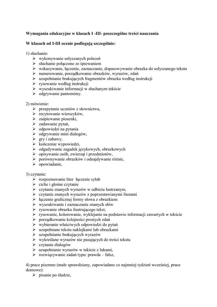 Wymagania edukacyjne w klasach I -III- poszczególne treści nauczania W klasach od I-III ocenie podlegają szczególnie: 1) słuchanie: wykonywanie usłyszanych poleceń słuchanie połączone ze śpiewaniem wskazywanie, łączenie, zaznaczanie, dopasowywanie obrazka do usłyszanego tekstu numerowanie, porządkowanie obrazków, wyrazów, zdań uzupełnianie brakujących fragmentów obrazka według instrukcji rysowanie według instrukcji wyszukiwanie informacji w słuchanym tekście odgrywanie pantomimy. 2) mówienie: przepytanie uczniów z słownictwa, recytowanie wierszyków, zaśpiewanie piosenki, zadawanie pytań, odpowiedzi na pytania odgrywanie mini dialogów, gry i zabawy, kończenie wypowiedzi, odgadywanie zagadek językowych, obrazkowych opisywanie osób, zwierząt i przedmiotów, porównywanie obrazków i odnajdywanie różnic, opowiadanie, 3) czytanie: rozpoznawanie liter łączenie sylab ciche i głośne czytanie czytanie znanych wyrazów w odbiciu lustrzanym, czytanie znanych wyrazów z poprzestawianymi literami łączenie graficznej formy słowa z obrazkiem wyszukiwanie i zaznaczanie znanych słów rysowanie obrazka ilustrującego tekst, rysowanie, kolorowanie, wyklejanie na podstawie informacji zawartych w tekście porządkowanie kolejności prostych zdań wybieranie właściwych odpowiedzi do pytań uzupełniane tekstu naklejkami lub obrazkami uzupełnianie brakujących wyrazów wykreślane wyrazów nie pasujących do treści tekstu czytanie dialogów uzupełnianie wyrazów w tekście z lukami, rozwiązywanie zadań typu: prawda – fałsz, 4) prace pisemne (małe sprawdziany, zapowiadane co najmniej tydzień wcześniej, prace domowe): pisanie po śladzie, odwzorowywanie kształtu liter, przepisywanie wyrazów i krótkich zwrotów, podpisywanie obrazków, odszyfrowywanie kodów i zapisywanie według nich znanych wyrazów, pisanie prostych zdań i krótkich tekstów według wzoru, pisanie słów lub prostych zdań ze słuchu, budowanie zdań z rozsypanek, zapisanie zakończenia zdania, zapisanie zakończenia tekstu, pisanie krótkich tekstów informacyjnych na swój temat, 5) aktywność na lekcji: odpowiedzi na pytania, chętny udział w grach i zabawach, zaśpiewanie piosenki, kolorowanie i rysowanie, rozwiązywanie zadań w zeszycie ćwiczeń, 6) działalności artystyczne: udział w konkursie plastyczno- językowym W przypadku uczniów ze specyficznymi trudnościami w czytaniu i pisaniu lub ze stwierdzonymi deficytami rozwojowymi stosuje się obniżone wymagania , uwzględniając zalecenia zawarte w opinii pedagogicznej , psychologicznej. Tematyka przerabiana na pierwszym roku nauki: podstawowe zwroty grzecznościowe przedstawianie się oraz pytanie o imię podawanie wieku przedstawienie członków rodziny, identyfikowanie osób, określanie cech osób, ulubione czynności, kolory, dni tygodnia, miesiące, świąteczne tradycje, składanie życzeń na różne okazje, części ciała, określanie dolegliwości, informowanie o naszych potrzebach, nazywanie i opisywanie produktów spożywczych, nazywanie zjawisk pogodowych np. pada deszcz, Tematyka przerabiana na drugim roku nauki: powitania i pożegnania w Niemczech i innych krajach niemieckojęzycznych przedstawienie przyjaciół przekazywanie informacji o sobie określanie ilości np. Mam cztery siostry. pytanie o ilość wyrażanie upodobań nazywanie i opisywanie szkoły, przyborów szkolnych określanie czynności wykonywanych w szkole określanie zasad bezpieczeństwa identyfikowanie miejsc przedmiotów Nazywanie i opisywanie mebli i przedmiotów nazywanie figur geometrycznych opisywanie umiejętności, pytanie o umiejętności Wyrażanie zachwytu i zainteresowania Informowanie o czasie, pytanie o czas- godziny zegarowe Określanie pory dnia, wyrażanie częstotliwości- manchmal, oft nie informowanie o otrzymanych prezentach z różnych okazji informowanie o zasadach higieny nazywanie posiłków informowanie o upodobaniach kulinarnych nazywanie i opisywanie elementów garderoby nazywanie i udzielanie informacji na temat zwierząt domowych, dziko żyjących i żyjących w zoo opisywanie zwierząt określanie celu podróży nazywanie środków transportów opisywanie planów wakacyjnych Tematyka przerabiana na trzecim roku nauki: pytanie o samopoczucie i określanie własnego samopoczucia udzielanie informacji i uzyskiwanie informacji np. o członkach rodziny, zawodach opisywanie umiejętności i pytanie o umiejętności, wykonywanie poleceń, nazywanie czynności, pomieszczenia w domu, w szkole, określanie miejsca, pytanie o miejsce, przyimki: in, auf, an, vor, określenie położenia i kierunków, podawanie nazw państw niemieckojęzycznych, opisywanie symboli narodowych, pytanie o drogę, opisywanie drogi, nazywanie obiektów w najbliższym otoczeniu, opisywanie miasta, czytanie planu, opisywanie regionu, podawanie i pytanie o nazwy ulubionych programów telewizyjnych, porównywanie, relacjonowanie wydarzeń, nazywanie czynności wykonywanych w ciągu dnia, opisywanie przygotowań do prywatki np. urodziny, świąteczne tradycje, wyrażanie chęci kupienia czegoś, wyrażanie przypuszczenia, obliczanie ilości, pytanie o cenę, zapraszanie, proste przepisy kulinarne, nazywanie zdrowej żywności, wyrażanie zakazu i nakazu, nazywanie kwiatów wiosennych, wyrażanie przynależności, posiadania sortowanie odpadów, opisywanie czynności wykonywanych w czasie wakacji i ferii, opowiadanie o minionych wakacjach.