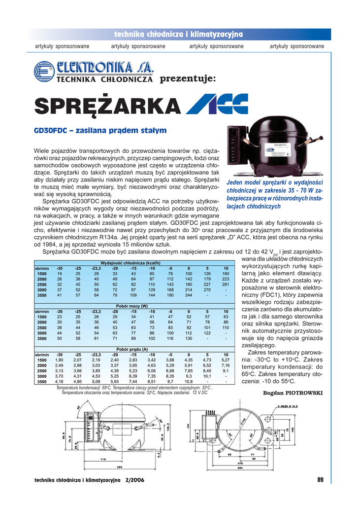 artykuły sponsorowane artykuły sponsorowane artykuły sponsorowane artykuły sponsorowane prezentuje: SPRĘŻARKA GD30FDC – zasilana prądem stałym Wiele pojazdów transportowych do przewo¿enia towarów np. ciê¿arówki oraz pojazdów rekreacyjnych, przyczep campingowych, ³odzi oraz samochodów osobowych wyposa¿one jest czêsto w urz¹dzenia ch³odz¹ce. Sprê¿arki do takich urz¹dzeñ musz¹ byæ zaprojektowane tak aby dzia³a³y przy zasilaniu niskim napiêciem pr¹du sta³ego. Sprê¿arki Jeden model sprężarki o wydajności te musz¹ mieæ ma³e wymiary, byæ niezawodnymi oraz charakteryzochłodniczej w zakresie 35 - 70 W zawaæ siê wysok¹ sprawnoœci¹. Sprê¿arka GD30FDC jest odpowiedzi¹ ACC na potrzeby u¿ytkow- bezpiecza pracę w różnorodnych instaników wymagaj¹cych wygody oraz niezawodnoœci podczas podró¿y, lacjach chłodniczych na wakacjach, w pracy, a tak¿e w innych warunkach gdzie wymagane jest u¿ywanie ch³odziarki zasilanej pr¹dem sta³ym. GD30FDC jest zaprojektowana tak aby funkcjonowa³a cicho, efektywnie i niezawodnie nawet przy przechy³ach do 30o oraz pracowa³a z przyjaznym dla œrodowiska czynnikiem ch³odniczym R134a. Jej projekt oparty jest na serii sprê¿arek „D” ACC, która jest obecna na rynku od 1984, a jej sprzeda¿ wynios³a 15 milionów sztuk. Sprê¿arka GD30FDC mo¿e byæ zasilana dowolnym napiêciem z zakresu od 12 do 42 VDC i jest zaprojektowana dla uk³adów ch³odniczych wykorzystuj¹cych rurkê kapilarn¹ jako element d³awi¹cy. Ka¿de z urz¹dzeñ zosta³o wyposa¿one w sterownik elektroniczny (FDC1), który zapewnia wszelkiego rodzaju zabezpieczenia zarówno dla akumulatora jak i dla samego sterownika oraz silnika sprê¿arki. Sterownik automatycznie przystosowuje siê do napiêcia gniazda zasilaj¹cego. Zakres temperatury parowania: -30 oC to +10 oC. Zakres temperatury kondensacji: do 65oC. Zakres temperatury otoczenia: -10 do 55oC. Temperatura kondensacji: 55oC, Temperatura cieczy przed elementem rozprężnym: 32oC , Temperatura otoczenia oraz temperatura ssania: 32oC, Napięcie zasilania: 12 V DC technika ch³odnicza i klimatyzacyjna 2/2006 Bogdan PIOTROWSKI 89