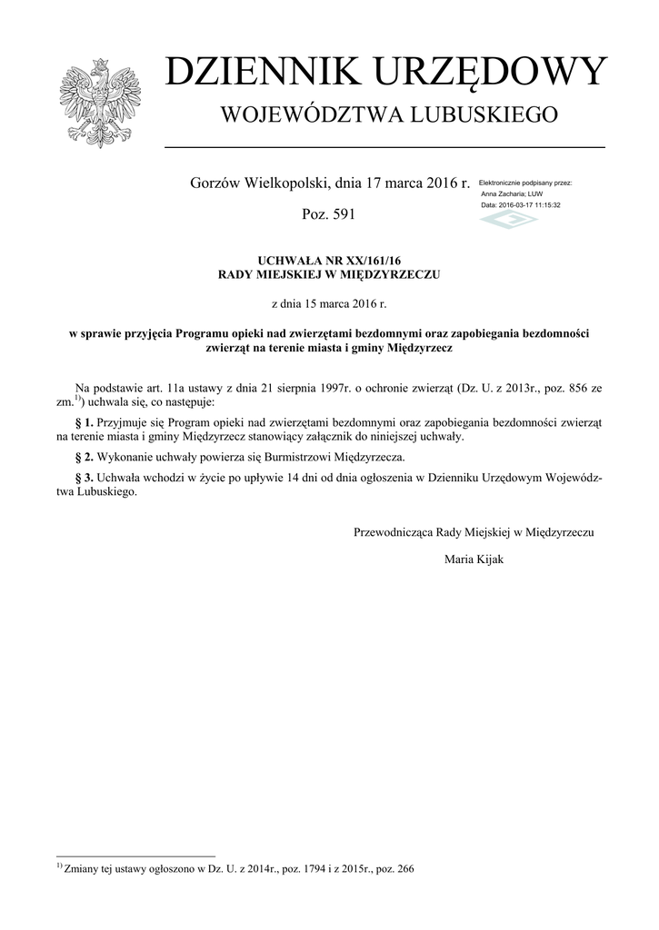 DZIENNIK URZĘDOWY WOJEWÓDZTWA LUBUSKIEGO Gorzów Wielkopolski, dnia 17 marca 2016 r. Elektronicznie podpisany przez: Anna Zacharia; LUW Poz. 591 Data: 2016-03-17 11:15:32 UCHWAŁA NR XX/161/16 RADY MIEJSKIEJ W MIĘDZYRZECZU z dnia 15 marca 2016 r. w sprawie przyjęcia Programu opieki nad zwierzętami bezdomnymi oraz zapobiegania bezdomności zwierząt na terenie miasta i gminy Międzyrzecz Na podstawie art. 11a ustawy z dnia 21 sierpnia 1997r. o ochronie zwierząt (Dz. U. z 2013r., poz. 856 ze zm.1)) uchwala się, co następuje: § 1. Przyjmuje się Program opieki nad zwierzętami bezdomnymi oraz zapobiegania bezdomności zwierząt na terenie miasta i gminy Międzyrzecz stanowiący załącznik do niniejszej uchwały. § 2. Wykonanie uchwały powierza się Burmistrzowi Międzyrzecza. § 3. Uchwała wchodzi w życie po upływie 14 dni od dnia ogłoszenia w Dzienniku Urzędowym Województwa Lubuskiego. Przewodnicząca Rady Miejskiej w Międzyrzeczu Maria Kijak 1) Zmiany tej ustawy ogłoszono w Dz. U. z 2014r., poz. 1794 i z 2015r., poz. 266 Dziennik Urzędowy Województwa Lubuskiego –2– Poz. 591 Załącznik do uchwały Nr XX/161/16 Rady Miejskiej w Międzyrzeczu z dnia 15 marca 2016r. Program opieki nad zwierzętami bezdomnymi oraz zapobiegania bezdomności zwierząt na terenie miasta i gminy Międzyrzecz Wprowadzenie § 1. 1. Program opieki nad zwierzętami bezdomnymi oraz zapobiegania bezdomności zwierząt na terenie miasta i gminy Międzyrzecz, zwany w dalszej części Programem, jest zgodny z ustawą o ochronie zwierząt. 2. Program określa ogólne wytyczne dotyczące zapewnienia opieki nad zwierzętami bezdomnymi oraz zapobiegania bezdomności zwierząt poprzez określenie celów, zadań realizowanych w roku 2016 w ramach programu wraz ze wskazaniem realizujących je podmiotów. 3. W programie określono zadania, których wybór został podyktowany zapisami art. 11a ustawy z dnia 21 sierpnia 1997r. o ochronie zwierząt (Dz. U. z 2013r., poz. 856 ze zm.) oraz wnioskami wynikającymi z działań podejmowanych do tej pory w zakresie dotyczącym bezdomnych zwierząt na terenie miasta i gminy. 4. Program dotyczy zwierząt bezdomnych w obszarze gminy Międzyrzecz, tj. zwierząt domowych lub gospodarskich, które uciekły, zabłąkały się lub zostały porzucone przez człowieka, a nie ma możliwości ustalenia ich właściciela lub innej osoby, pod której opieką trwale dotąd pozostawały. § 2. Cele Programu. Celem wprowadzenia Programu jest zapobieganie bezdomności zwierząt, w szczególności przez: 1) zapewnienie opieki bezdomnym zwierzętom; 2) wyłapywanie bezdomnych zwierząt; 3) poszukiwanie nowych właścicieli; 4) zmniejszenie populacji bezdomnych zwierząt i zapobieganie zwiększeniu się populacji zwierząt bezdomnych przez kastrację i sterylizację psów i kotów oraz usypianie ślepych miotów tych zwierząt; 5) edukacja mieszkańców gminy Międzyrzecz w zakresie obowiązków właścicieli zwierząt i ochrony zwierząt, w tym humanitarnego traktowania zwierząt. § 3. Zadania w ramach programu. W ramach Programu Gmina Międzyrzecz realizuje następujące zadania: 1) zapewnienie bezdomnym zwierzętom miejsca w schronisku dla zwierząt; 2) opiekę nad wolno żyjącymi kotami, w tym ich dokarmianie; 3) odławianie bezdomnych zwierząt; 4) obligatoryjną sterylizację albo kastrację zwierząt w schronisku dla zwierząt; 5) poszukiwanie właścicieli dla bezdomnych zwierząt; 6) usypianie ślepych miotów; 7) wskazanie gospodarstwa rolnego w celu zapewnienia miejsca dla zwierząt gospodarskich; 8) zapewnienie całodobowej opieki weterynaryjnej w przypadkach zdarzeń drogowych z udziałem zwierząt; 9) edukację w zakresie ochrony zwierząt. § 4. Wykonawcy programu 1. Program realizuje Gmina Międzyrzecz i podmioty, którym zleciła odławianie bezdomnych zwierząt, ich leczenie, zapewnienie im miejsca w schronisku albo w gospodarstwach rolnych i przy współpracy z Policją, Państwową Strażą Pożarną oraz Powiatowym Lekarzem Weterynarii. Dziennik Urzędowy Województwa Lubuskiego –3– Poz. 591 2. Zadania te bezpośrednio realizuje Wydział Gospodarki Mieniem Urzędu Miejskiego w Międzyrzeczu (tel. 95 7426977, 95 7426942). Ponadto wszelkie informacje zamieszczane będą na stronie internetowej: www.miedzyrzecz.pl. § 5. Zapewnienie bezdomnym zwierzętom miejsca w schronisku dla zwierząt. 1) Schronisko przyjmuje i zapewnia opiekę bezdomnym zwierzętom domowym z terenu miasta i gminy Międzyrzecz; 2) Opiekę w schronisku nad bezdomnymi zwierzętami z terenu miasta i gminy Międzyrzecz zapewnia lek. wet. Zenon Jażdżewski, prowadzący działalność gospodarczą pod nazwą VET-ZOO Sewis z siedzibą w Trzciance. § 6. Opieka nad wolno żyjącymi kotami. Przewiduje się powierzenie opieki nad wolno żyjącymi kotami, w tym ich dokarmianie, organizacjom pozarządowym, do których statutowych zadań należy opieka nad bezdomnymi zwierzętami i ochrona zwierząt w trybie ustawy z dnia 24 kwietnia 2003r. o działalności pożytku publicznego i o wolontariacie (Dz. U. z 2014r., poz. 1118 z późn. zm.). § 7. Odławianie bezdomnych zwierząt 1. Odławianiu podlegają zwierzęta domowe i gospodarskie, które uciekły, zabłąkały się lub zostały porzucone przez człowieka, a nie istnieje możliwość ustalenia właściciela lub innej osoby, pod której opieką zwierzęta dotąd pozostawały. 2. Bezdomne zwierzęta na terenie gminy Międzyrzecz podlegają bieżącemu odławianiu, w zależności od przyjętych zgłoszeń. Zgłoszenia od mieszkańców o bezdomnych zwierzętach przyjmuje Wydział Gospodarki Mieniem Urzędu Miejskiego w Międzyrzeczu. 3. Odławianie zwierząt bezdomnych może być prowadzone za pomocą specjalistycznego sprzętu, który nie będzie stwarzał zagrożenia dla życia i zdrowia wyłapanych zwierząt, a także nie będzie zadawał im cierpienia. 4. Środki do przewozu zwierząt powinny spełniać warunki określone w ustawie o ochronie zwie