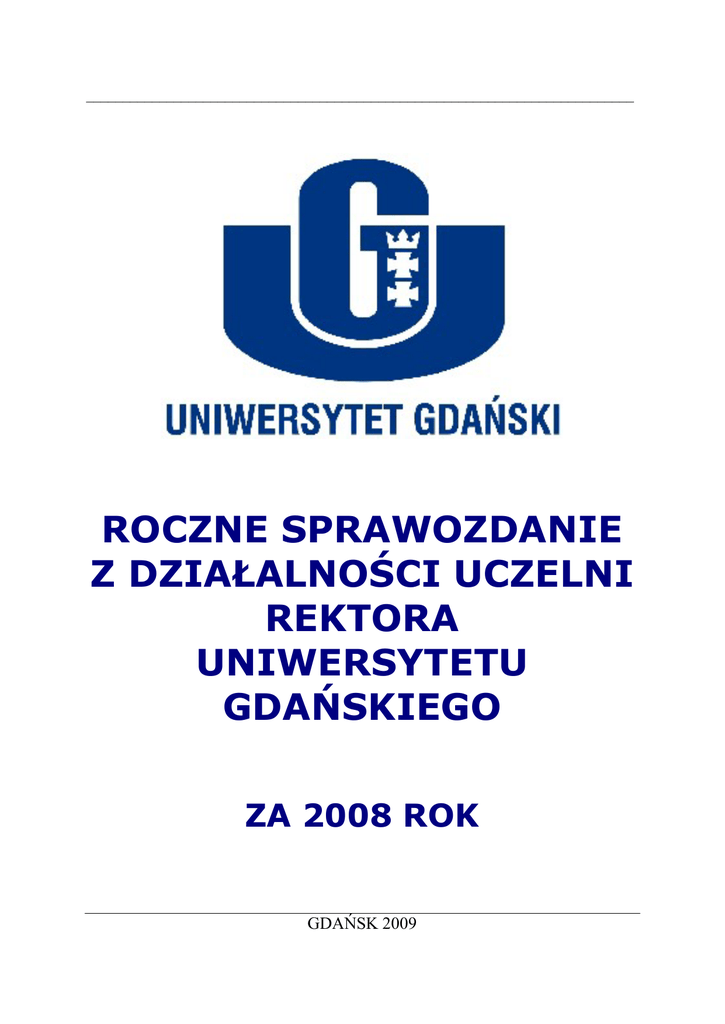 ___________________________________________________________________________ ROCZNE SPRAWOZDANIE Z DZIAŁALNOŚCI UCZELNI REKTORA UNIWERSYTETU GDAŃSKIEGO ZA 2008 ROK GDAŃSK 2009 Spis treści Spis treści Senat …………………………………………………………………………………………… Uchwały Senatu ………………………………………………………………………….. Komisje ……………………………………………………………………………………. Akty prawne wewnętrznie obowiązujące ………………………………………………. Zmiany organizacyjne ………………………………………………………………….... Informacja o osobach będących organami uczelni (kadencja 2008-2012) .............. Skład Senatu UG ..................................................................................................... Dane teleadresowe Uczelni ..................................................................................... Studenci i studia ………………………………………………………………………………. Liczba studentów …………………………………………………………………………. Liczba absolwentów ……………………………………………………………………… Sprawność nauczania …………………………………………………………………… Terminowość kończenia studiów ……………………………………………………….. Liczba uczestników studiów doktoranckich ……………………………………………. Wykaz studiów pierwszego stopnia ……………………………………………………. Realizacja studenckich praktyk zawodowych …………………………………………. Rekrutacja ................................................................................................................ Liczba kandydatów zgłoszonych i przyjętych na studia ……………………………… Wymiana zagraniczna studentów ………………………………………………………. Parlament Studentów ……………………………………………………………………. Studenckie sprawy socjalne …………………………………………………………….. Informacja o wysokości opłat za studia .................................................................... Kadra …………………………………………………………………………………………… Stan zatrudnienia nauczycieli akademickich w osobach ……………....................... Struktura zatrudnienia nauczycieli akademickich w etatach ……………………….... Stan zatrudnienia nauczycieli akademickich wg tytułów i stopni naukowych ……… Stan zatrudnienia pracowników w UG ..........................................................………. Badania naukowe …………………………………………………………………………….. Fundusze na działalność naukowo-badawczą ………………………………………... Wyniki działalności naukowo-badawczej ………………………………………………. Realizacja poszczególnych rodzajów badań ………………………………………….. Współpraca z zagranicą ……………………………………………………………………… Przyjazdy cudzoziemców do UG ……………………………………………………….. Wyjazdy za granicę studentów i pracowników UG …………………………………… Liczba tematów prac badawczych realizowanych we współpracy z zagranicą …… Biuro Programów Europejskich …………………………………………………………. Biblioteka i Wydawnictwo ……………………………………………………………………. Biblioteka Główna ………………………………………………………………………… Główne dokonania ……………………………………………………………………... Efekty działalności ……………………………………………………………………… Statystyka biblioteczna ………………………………………………………………… Pracownicy biblioteki …………………………………………………………………... Sprawy administracyjne ……………………………………………………………….. Wydawnictwo ……………………………………………………………………………... Obsługa informatyczna uczelni ……………………………………………………………… Nauczanie języków obcych ………………………………………………………………….. Studium Języków Obcych ……………………………………………………………….. Centrum Herdera …………………………………………………………………………. Ośrodek Alliance Francaise …………………………………………………………….. Inne obszary działalności uczelni …………………………………………………………… Studium Wychowania Fizycznego i Sportu ……………………………………………. Sprawozdanie roczne Rektora Uniwersytetu Gdańskiego 1 1 7 7 8 13 14 16 17 17 28 30 33 35 36 37 37 37 44 46 48 52 66 66 67 68 69 70 70 70 73 81 81 85 89 90 96 96 96 98 104 108 109 111 112 134 134 139 142 144 144 Spis treści Akademickie Centrum Kultury …………………………………………………………... Akademicka Telewizja Edukacyjna …………………………………………………….. Biuro Karier ……………………………………………………………………………….. Pełnomocnik Rektora ds. Kontaktów z Pracodawcami ........................................... Biuro Informacji i Promocji …………