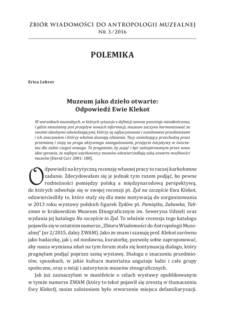 ZBIÓR WI ADOMOŚCI DO A NTROPOLOGII MUZE ALNEJ Nr 3 / 2 016 POLEMIKA Erica Lehrer Muzeum jako dzieło otwarte: Odpowiedź Ewie Klekot W warunkach muzealnych, w których sytuacja z definicji zawsze pozostaje niezakończona, i gdzie nieustanny jest przepływ nowych informacji, muzeum zaczyna harmonizować ze swoimi idealnymi odwiedzającymi, którzy są zafascynowani i oszołomieni przedmiotami i ich znaczeniem i którzy właśnie doznają olśnienia. Tacy zwiedzający przechodzą przez przemianę i stoją na progu aktywnego zaangażowania, przejęcia inicjatywy w tworzeniu dla siebie czegoś nowego. To pragnienie, by pojąć i być zainspirowanym przez nowe idee sprawia, że najlepsi użytkownicy muzeów odzwierciedlają sobą otwarte możliwości muzeów [David Carr 2001: 180]. O dpowiedź na krytyczną recenzję własnej pracy to raczej karkołomne zadanie. Zdecydowałam się je jednak tym razem podjąć, bo pewne rozbieżności pomiędzy polską a międzynarodową perspektywą, do których odwołuje się w swojej recenzji pt. Żyd na szczęście Ewa Klekot, odzwierciedliły te, które stały się dla mnie motywacją do zorganizowania w 2013 roku wystawy polskich figurek Żydów pt. Pamiątka, Zabawka, Talizman w krakowskim Muzeum Etnograficznym im. Seweryna Udzieli oraz wydania jej katalogu Na szczęście to Żyd. To właśnie recenzja tego katalogu pojawiła się w ostatnim numerze „Zbioru Wiadomości do Antropologii Muzealnej” (nr 2/2015, dalej: ZWAM). Jako że znam i szanuję prof. Klekot zarówno jako badaczkę, jak i, od niedawna, kuratorkę, pozwolę sobie zaproponować, aby nasza wymiana zdań na tym forum stała się kontynuacją dialogu, który pragnęłam podjąć poprzez samą wystawę. Dialogu o znaczeniu przedmiotów, sposobach, w jakie kultura materialna angażuje ludzi i całe grupy społeczne, oraz o misji i autorytecie muzeów etnograficznych. Jak już zaznaczyłam w manifeście o celach wystawy opublikowanym w tymże numerze ZWAM (który to tekst pojawił się zresztą w tłumaczeniu Ewy Klekot), moim założeniem było stworzenie miejsca defamiliaryzacji. 196 Erica Lehrer Strategia ta nie zakłada karmienia odwiedzających dydaktyzmem i gotową wizją ekspercką, ale, zamiast tego, wymaga od nich wypracowania własnych interpretacji i wyciągnięcia wniosków, które ukształtują potem ich przekonania. Moje podejście zakładało więc, że wystawa, rozszerzona o crowd-sourcingową stronę internetową, dyskusje panelowe, salę dialogu oraz interaktywne zeszyty, które zapraszały odwiedzających do odpowiedzenia na serię pytań podczas wizyty w poszczególnych galeriach, będzie katalizatorem a nie platformą pedagogiczną. Katalog, na którym skupia się Klekot, jak i sama wystawa, której porządek odzwierciedla, ma otwarty format. Zbudowany jako „ekspozycja w formie książkowej” [Lehrer 2014: 15], jest skromną dokumentacją tego wydarzenia i koncentruje się na przedstawionych obiektach i reakcji odwiedzających. Ewa Klekot jednak recenzuje ten szczególny rodzaj publikacji, powiązanej z konkretnym jednorazowym wydarzeniem, jakby była to – lub jakby powinna to być – niezależna monografia naukowa. To pomylenie gatunków jest niefortunne, odpowiem jednak na najważniejsze aspekty tej krytyki, które dotyczą zarówno samej wystawy, jak i tej późniejszej publikacji. Ewa Klekot w swojej recenzji oskarża mnie przede wszystkim o esencjalizację i przedstawianie polskiej i żydowskiej perspektywy na figurki jako spolaryzowanych, spisując tę rzekomą „homogenizującą perspektywę” na karb moich wcześniejszych badań nad jakoby nieświadomymi turystami, którzy odbierają Polskę poprzez pryzmat uproszczonych stereotypów, serwowanych im przez przemysł turystyczny. Tę krytykę trudno jest uznać za uzasadnioną wobec wystawy, której raison d’etre było pokazanie różnorodności, zarówno form figurek, jak i ich interpretacji. Odzwierciedlały to zarówno nie tylko teksty na ścianach wystawy, skupione wokół serii pytań, wywiady z Polakami i Żydami (w tym polskimi), lecz także sala, w której można było śledzić ciągle dodawane komentarze odwiedzających. Co więcej, dosyć elitarystyczne przypisanie przez recenzentkę „spojrzeniu turysty” uproszczeń jest problematyczne samo w sobie. Powracające żydowskie spojrzenie na Polskę, często umożliwione właśnie przez doświadczenie turystyczne, stało się przecież katalizatorem głębokich zmian w polskiej świadomości kulturowej, historycznej i etycznej [Lehrer 2013, Waligórska 2013]. Najważniejszą misją etnografii jest próba zrozumienia innych perspektyw, a nie ich osądzenie, dlatego ten rodzaj wielogłosu jest szczególnie ważny, jeżeli muzea mają odpowiedzialnie traktować sporną historię. Muzeum jako dzieło otwarte: Odpowiedź Ewie Klekot 197 Włączenie do wystawy figurek Afroamerykanów i Indian również spot kało się z krytyką Ewy Klekot, która interpretuje ten zabieg jako tworzenie nieuzasadnionych paraleli między amerykańskim a polskim zjawiskiem. W tym wypadku jednak po raz kolejny źle rozumie rolę, którą miały odgrywać. Umieściłam kilka takich figurek w oddzielnej sali na innym piętrze wystawy, w miejscu, które, za pomocą towarzyszącej mu serii prowokacyjnych pytań, miało inspirować dialog. Ten porządek eksponatów odzwierciedlony został także w katalogu wystawy, gdzie owe figurki pojawiły się dopiero w ostatniej galerii pt. Czy tylko w Polsce? Ich obecność miała z jednej strony skłonić Amerykanów do zastanowienia się nad tym, czy nie za łatwo przychodzi im wytykać palcami Polaków, z drugiej strony zaś miała zaoferować Polakom dodatkową ramę interpretacyjną, dającą nowe spojrzenie na debatę o przedstawieniach Innego i pluralizmie w przestrzeni publicznej. Moim zamierzeniem nie było więc tworzenie gładkich historycznych porównań, ale raczej zaproponowanie dodatkowych materiałów źródłowych, kt