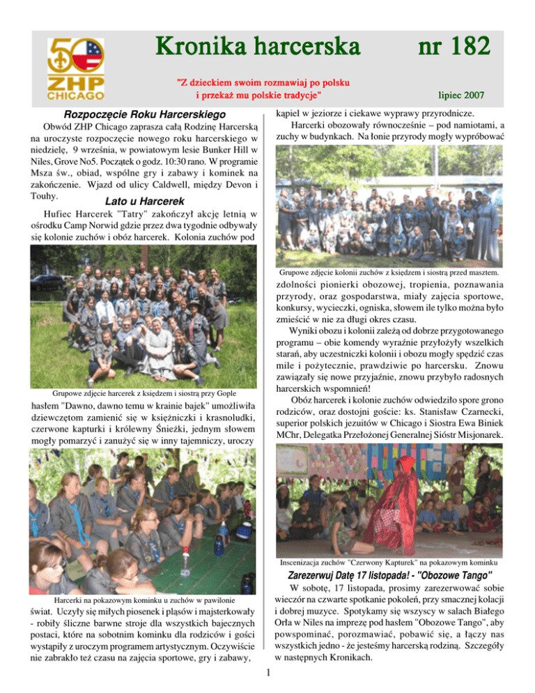 Kronika harcerska &Z dzieckiem swoim rozmawiaj po polsku i przeka# mu polskie tradycje& nr 182 lipiec 2007 k'piel w jeziorze i ciekawe wyprawy przyrodnicze. Harcerki obozowa;y r[wnocze=nie – pod namiotami, a zuchy w budynkach. Na ;onie przyrody mog;y wypr[bowa\ Rozpocz/cie Roku Harcerskiego Obw[d ZHP Chicago zaprasza ca;' Rodzin/ Harcersk' na uroczyste rozpocz/cie nowego roku harcerskiego w niedziel/, 9 wrze=nia, w powiatowym lesie Bunker Hill w Niles, Grove No5. Pocz'tek o godz. 10>30 rano. W programie Msza =w., obiad, wsp[lne gry i zabawy i kominek na zako]czenie. Wjazd od ulicy Caldwell, mi/dzy Devon i Touhy. Lato u Harcerek Hufiec Harcerek &Tatry& zako]czy; akcj/ letni' w o=rodku Camp Norwid gdzie przez dwa tygodnie odbywa;y si/ kolonie zuch[w i ob[z harcerek. Kolonia zuch[w pod Grupowe zdj/cie kolonii zuch[w z ksi/dzem i siostr' przed masztem. zdolno=ci pionierki obozowej, tropienia, poznawania przyrody, oraz gospodarstwa, mia;y zaj/cia sportowe, konkursy, wycieczki, ogniska, s;owem ile tylko mo#na by;o zmie=ci\ w nie za d;ugi okres czasu. Wyniki obozu i kolonii zale#' od dobrze przygotowanego programu – obie komendy wyra-nie przy;o#y;y wszelkich stara], aby uczestniczki kolonii i obozu mog;y sp/dzi\ czas mile i po#ytecznie, prawdziwie po harcersku. Znowu zawi'za;y si/ nowe przyja-nie, znowu przyby;o radosnych harcerskich wspomnie]! Ob[z harcerek i kolonie zuch[w odwiedzi;o spore grono rodzic[w, oraz dostojni go=cie> ks. Stanis;aw Czarnecki, superior polskich jezuit[w w Chicago i Siostra Ewa Biniek MChr, Delegatka Prze;o#onej Generalnej Si[str Misjonarek. Grupowe zdj/cie harcerek z ksi/dzem i siostr' przy Gople has;em &Dawno, dawno temu w krainie bajek& umo#liwi;a dziewcz/tom zamieni\ si/ w ksi/#niczki i krasnoludki, czerwone kapturki i kr[lewny +nie#ki, jednym s;owem mog;y pomarzy\ i zanu#y\ si/ w inny tajemniczy, uroczy Inscenizacja zuch[w &Czerwony Kapturek& na pokazowym kominku Zarezerwuj Dat/ 17 listopada! * &Obozowe Tango& W sobot/, 17 listopada, prosimy zarezerwowa\ sobie wiecz[r na czwarte spotkanie pokole], przy smacznej kolacji i dobrej muzyce. Spotykamy si/ wszyscy w salach Bia;ego Or;a w Niles na imprez/ pod has;em &Obozowe Tango&, aby powspomina\, porozmawia\, pobawi\ si/, a ;'czy nas wszystkich jedno * #e jeste=my harcersk' rodzin'. Szczeg[;y w nast/pnych Kronikach. Harcerki na pokazowym kominku u zuch[w w pawilonie =wiat. Uczy;y si/ mi;ych piosenek i pl's[w i majsterkowa;y * robi;y =liczne barwne stroje dla wszystkich bajecznych postaci, kt[re na sobotnim kominku dla rodzic[w i go=ci wyst'pi;y z uroczym programem artystycznym. Oczywi=cie nie zabrak;o te# czasu na zaj/cia sportowe, gry i zabawy, 1 Proponujemy nast/puj'ce ceny> 1) Pobyt na O=rodku bez wy#ywienia $25 za noc od k#dego samochodu. 2) Pobyt na O=rodku z wy#ywieniem $50 od osoby i $25 od dzieci w wieku 4*12 lat. W cenie s' w;'czone 2 lub 3 noclegi i 5 posi;k[w> sobota obiad i kolacja a niedziela =niadanie, obiad i kolacja. Kole#anki i koledzy z Zarz'du KPH ch/tnie udziel' wszelkich informacji> Urszula (847)824*4435 lub Iwona (773)545*1359 Serdecznie zapraszamy. S;owo od Kapelana Naczelnego – wskazania wakacyjne Ukochani moi Harcerze, Grono Instruktorskie, Druhny i Druhowie! Najdro#si Rodacy! Jest do wype;nienia bardzo wa#ne zadanie, wa#ne dla Polski i ca;ego =wiata. Nasz #yciowy program brzmi kr[tko> Harcerz^Harcerka s;u#y Bogu, Polsce i bli-nim. S;u#ba Bogu to odpowied- na Jego Mi;o=\, to s;uchanie Jego g;osu. Na r[#ne sposoby B[g przemawia do cz;owieka. 90 lat temu Dobry B[g przys;a; na ziemi/ niezwyk;ego Ambasadora. Przysz;a na ziemi/ sama Matka Naj=wi/tsza. I to wiecie do kogo przysz;a, komu wyjawi;a wielkie tajemnice – trojgu dzieciom w ma;ym miasteczku Fatima w Portugalii. Powierzy;a im wielkie tajemnice dziej[w =wiata, wojen i g;odu. I prosi;a o pomoc. &Pom[#cie zwy* ci/#y\ mojemu sercu!& Prosi;a o modlitw/, o oddanie si/ Jej, o ofiarowywanie modlitw i cierpie] za grzesznik[w. Prosi;a o 5 pierwszych sob[t miesi'ca ku Jej czci. Ukochani przyjaciele, w tym roku ten g;os nie daje mi spokoju. Maryja i dzisiaj m[wi do Ciebie i do mnie> &Pom[#cie zwyci/#y\ mojemu sercu!& Hej! Najdro#si moi s;yszycie@ Matka Naj=wi/tsza prosi nas o pomoc. Ka#dego z nas. Ciebie i mnie – prosi. A wi/c od dzisiaj MODLITWA, szczeg[lnie RÓ~ANIEC musi by\ przy nas i oddanie si/ Matce Bo#ej. Powtarzajcie co dnia za Janem Paw;em II – &Maryjo ca;y jestem Tw[j. Ca;a jestem Twoja. Totus Tuus&. I codziennie podejmujmy postanowienia – loda nie zjem, coca coli nie wypij/, j/zyk pokonuj'c nie odgryz/ si/, z;ego s;owa nie powiem, b/d/ cierpliwy, m/#ny, prawdziwie harcerski. A przez 5 sob[t miesi'ca spowied- i komunia =wi/ta z b;aganiem o pok[j dla =wiata. Matko Bo#a, daj aby=my poj/li, #e ju# 100 lat Harcerstwo s;u#y Tobie. Dzi/kujemy Ci za ;ask/, #e mo#emy Ci s;u#y\ pomoc' w ratowaniu =wiata. Sercem i modlitw' wszystkich Was otaczam i gor'co prosz/ o dar wiernych serc. Szcz/=\ Bo#e! Czuwaj! Ks. pra;at Zdzis;aw J. Peszkowski Naczelny Kapelan ZHP pgK Warszawa, 28 czerwiec 2007 Pro=ba Redakcja Kroniki Harcerskiej prosi wszystkie harcerskie jednostki o przekazywanie nam informacji i zdj/\ z imprez harcerskich. Informacje mog' by\ napisane po polsku lub angielsku. Wszystko b/dzie zredagowane i poprawnie po polsku napisane. Zdj/cia wraz z informacjami prosz/ przes;a\ drog' e*mail> [email protected] z kopi' do> [email protected] Dar[w Harcerskich Serc Ci'g Dalszy (lista 153) Oto lista najnowszych ofiarodawc[w kt[rym sk;adamy serdeczne dzi/ki harcerskie. Na Cele Harcerskie ku pami/ci Juliana Piech> $100 * Margie MacKinnon Na Kronik/ Harcersk'> $100 * George Bartoszek, $50 * El#bieta B Link, Krystyna Mazur, $40 * Jadwiga Chru=ciel Zapraszamy dzieci i m;odzie# do naszych szereg[w! Informacje> http>^^www.zhp.us Uwaga!! Ka#dy zuch, harcerka, harcerz, wracaj'c ze zbi[rki przynosi do domu Kronik/ Harcersk'!!! Z ~a;obnej Karty 7 lipca zmar; George &Jurek& Gramza, harcerz 2DH w latach 60*ych i cz;onek pierwszej grupy tanecznej, z kt[rej powst