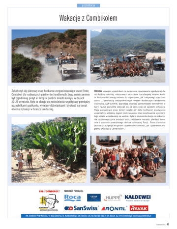 prezentacja prezentacja Wakacje z Combikolem Zakończył się pierwszy etap konkursu zorganizowanego przez firmę Combikol dla najlepszych partnerów handlowych. Jego zwieńczeniem był tygodniowy pobyt w Turcji w pobliżu miasta Alanya, w dniach 22-29 września. Była to okazja do zacieśnienia współpracy pomiędzy uczestnikami spotkania, wymiany doświadczeń i dyskusji na temat obecnej sytuacji w branży sanitarnej. PROGRAM pozwalał uczestnikom na zwiedzanie i poznawanie egzotycznej dla nas kultury tureckiej, miejscowych zwyczajów i przebogatej lokalnej kuchni. Goście mieli okazję zarówno do odpoczynku, jak i aktywnego spędzania czasu. Z pewnością niezapomnianych wrażeń dostarczyła całodzienna wycieczka JEEP SAFARI. Szaleńcza wyprawa samochodami terenowymi w Góry Taurus pozwoliła oderwać się na jakiś czas od spiekoty wybrzeża. Trasa prowadząca przez dzikie zakątki gór dała możliwość podziwiania wspaniałych widoków, kąpieli podczas postoi oraz skosztowania wyśmienitego obiadu w restauracji na wodzie. Była to znakomita okazja do zobaczenia codziennego życia prostych ludzi, zwiedzenia meczetu, plantacji bananów i poznania prawdziwego oblicza dzisiejszej Turcji. Firma Combikol jeszcze raz dziękuje wszystkim uczestnikom konkursu, jak i partnerom programu „Wakacje z Combikolem”. PARTNERZY PROGRAMU: P.H. Combikol Piotr Kolonko, 40-032 Katowice, Al. Roździeńskiego 191 (stoisko 10), tel./fax (32) 351 26 14, 351 26 15, www.combikol.pl, [email protected] łazienka 43