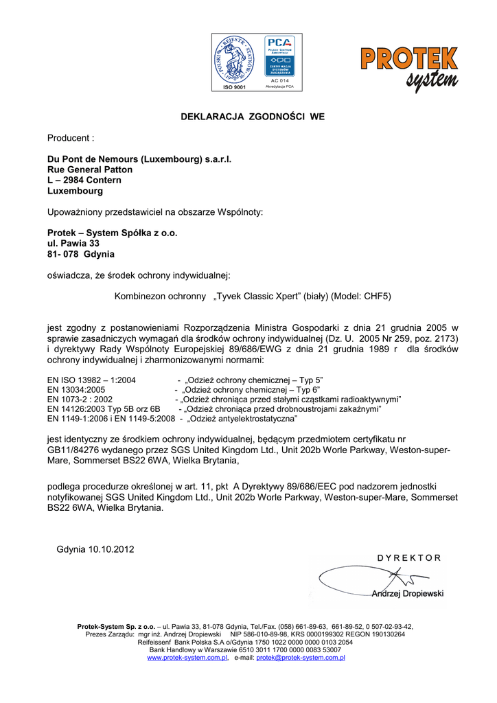 DEKLARACJA ZGODNOŚCI WE Producent : Du Pont de Nemours (Luxembourg) s.a.r.l. Rue General Patton L – 2984 Contern Luxembourg Upoważniony przedstawiciel na obszarze Wspólnoty: Protek – System Spółka z o.o. ul. Pawia 33 81- 078 Gdynia oświadcza, że środek ochrony indywidualnej: Kombinezon ochronny „Tyvek Classic Xpert” (biały) (Model: CHF5) jest zgodny z postanowieniami Rozporządzenia Ministra Gospodarki z dnia 21 grudnia 2005 w sprawie zasadniczych wymagań dla środków ochrony indywidualnej (Dz. U. 2005 Nr 259, poz. 2173) i dyrektywy Rady Wspólnoty Europejskiej 89/686/EWG z dnia 21 grudnia 1989 r dla środków ochrony indywidualnej i zharmonizowanymi normami: EN ISO 13982 – 1:2004 - „Odzież ochrony chemicznej – Typ 5” EN 13034:2005 - „Odzież ochrony chemicznej – Typ 6” EN 1073-2 : 2002 - „Odzież chroniąca przed stałymi cząstkami radioaktywnymi” EN 14126:2003 Typ 5B orz 6B - „Odzież chroniąca przed drobnoustrojami zakaźnymi” EN 1149-1:2006 i EN 1149-5:2008 - „Odzież antyelektrostatyczna” jest identyczny ze środkiem ochrony indywidualnej, będącym przedmiotem certyfikatu nr GB11/84276 wydanego przez SGS United Kingdom Ltd., Unit 202b Worle Parkway, Weston-superMare, Sommerset BS22 6WA, Wielka Brytania, podlega procedurze określonej w art. 11, pkt A Dyrektywy 89/686/EEC pod nadzorem jednostki notyfikowanej SGS United Kingdom Ltd., Unit 202b Worle Parkway, Weston-super-Mare, Sommerset BS22 6WA, Wielka Brytania. Gdynia 10.10.2012 Protek-System Sp. z o.o. – ul. Pawia 33, 81-078 Gdynia, Tel./Fax. (058) 661-89-63, 661-89-52, 0 507-02-93-42, Prezes Zarządu: mgr inż. Andrzej Dropiewski NIP 586-010-89-98, KRS 0000199302 REGON 190130264 Reifeissenf Bank Polska S.A o/Gdynia 1750 1022 0000 0000 0103 2054 Bank Handlowy w Warszawie 6510 3011 1700 0000 0083 53007 www.protek-system.com.pl, e-mail: [email protected]