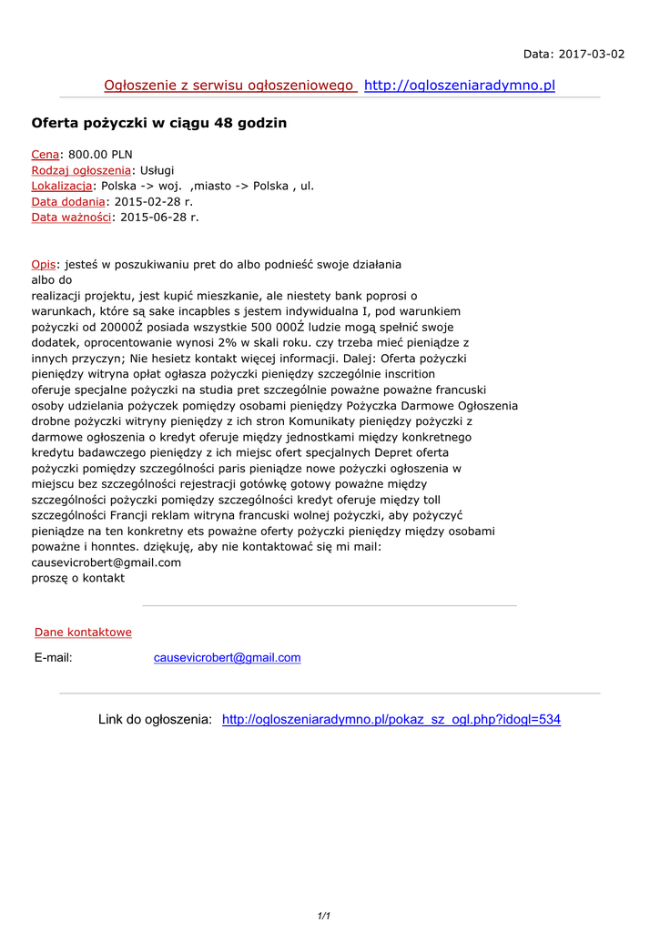 Ogłoszenie z serwisu ogłoszeniowego http://ogloszeniaradymno.pl