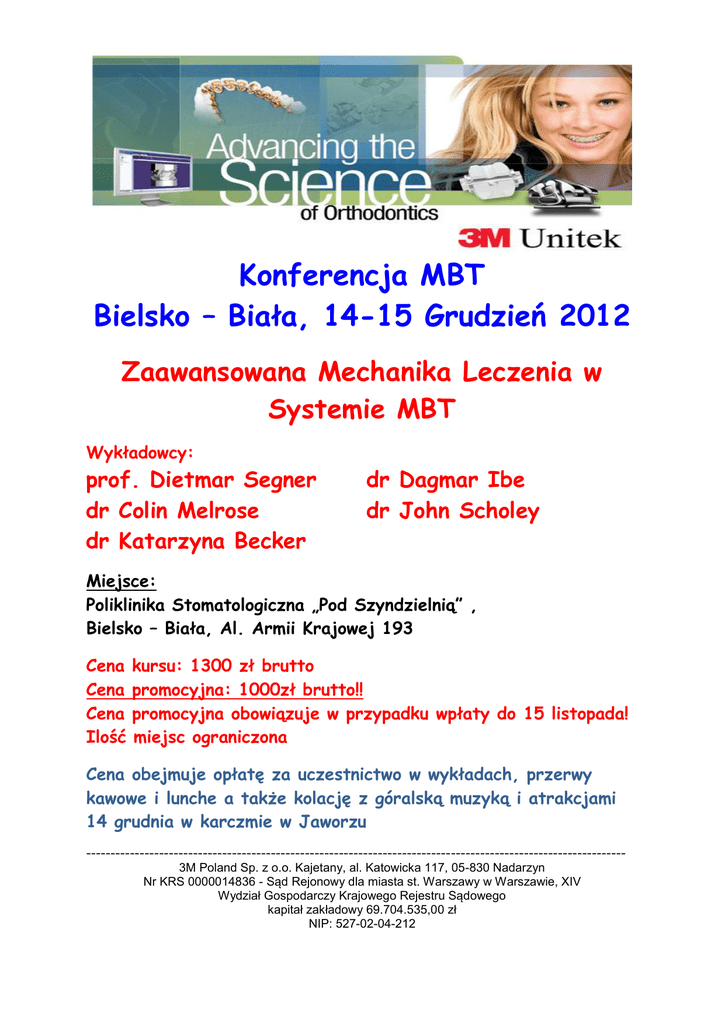 Konferencja MBT Bielsko – Biała, 14-15 Grudzień 2012 Zaawansowana Mechanika Leczenia w Systemie MBT Wykładowcy: prof. Dietmar Segner dr Colin Melrose dr Katarzyna Becker dr Dagmar Ibe dr John Scholey Miejsce: Poliklinika Stomatologiczna „Pod Szyndzielnią” , Bielsko – Biała, Al. Armii Krajowej 193 Cena Cena Cena Ilość kursu: 1300 zł brutto promocyjna: 1000zł brutto!! promocyjna obowiązuje w przypadku wpłaty do 15 listopada! miejsc ograniczona Cena obejmuje opłatę za uczestnictwo w wykładach, przerwy kawowe i lunche a także kolację z góralską muzyką i atrakcjami 14 grudnia w karczmie w Jaworzu --------------------------------------------------------------------------------------------------------------3M Poland Sp. z o.o. Kajetany, al. Katowicka 117, 05-830 Nadarzyn Nr KRS 0000014836 - Sąd Rejonowy dla miasta st. Warszawy w Warszawie, XIV Wydział Gospodarczy Krajowego Rejestru Sądowego kapitał zakładowy 69.704.535,00 zł NIP: 527-02-04-212 Agenda kursu 14 grudnia – Piątek 09:00 – 09:30 Rejestracja 09:30 - 11:00 Skuteczne leczenie trudnych przypadków 11:00 – 11:30 Przerwa kawowa 11:30 – 13:00 Precyzyjne pozycjonowanie zamków w klejeniu pośrednim Lunch Dr Dagmar Ibe System MBT w leczeniu pacjentów dorosłych. Leczenie ortodontyczne jako podstawa do dalszego, optymalnego leczenia zachowawczego Przerwa kawowa Prof. Dietmar Segner Skuteczne leczenie wad przednio-tylnych z zastosowaniem mini implantów TAD i mechaniki systemu MBT Dr Colin Melrose Dr Katarzyna Becker 13:00 – 14:00 14:00 – 15:30 15:30 – 16:00 16:00 – 17:30 Dr John Scholey Uroczysta kolacja w Karczmie w Jaworzu z atrakcjami --------------------------------------------------------------------------------------------------------------3M Poland Sp. z o.o. Kajetany, al. Katowicka 117, 05-830 Nadarzyn Nr KRS 0000014836 - Sąd Rejonowy dla miasta st. Warszawy w Warszawie, XIV Wydział Gospodarczy Krajowego Rejestru Sądowego kapitał zakładowy 69.704.535,00 zł NIP: 527-02-04-212 15 grudnia – Sobota 09:00 – 10:30 Leczenie wad klasy II u pacjentów niewspółpracujących Przerwa kawowa Dr Dagmar Ibe Dr Colin Melrose 12:30 – 13:30 Wszechstronność systemu MBT, innowacyjne podejście do leczenia Lunch 13:30 – 15:00 Leczenie zgryzów otwartych przednich Dr John Scholey 15:00 – 15:30 Przerwa kawowa 15:30 – 17:00 Skuteczna retencja 10:30 – 11:00 11:00 – 12:30 Prof. Dietmar Segner Szczegółowych informacji udzielają nasi przedstawiciele: Marcin Mazurek – tel.: 0 660 432 242 Jakub Orłów – tel.: 0 608 532 534 Agnieszka Gołębiowska - tel.: 0 600 398 855 Grzegorz Mucha – tel.: 0 600 278 037 Oraz Dział Obsługi Klienta 3M Unitek: (022) 739 60 83 , (022) 739 60 84 Ilość miejsc ograniczona. O rejestracji na kurs decyduje kolejność wpłat. Opłatę prosimy wnosić na następujące konto: Dokonywanie wpłat na konto Avigraf: MultiBank BRE BANK S.A. OBD Nr konta: 58 1140 2017 0000 4502 1189 7867 --------------------------------------------------------------------------------------------------------------3M Poland Sp. z o.o. Kajetany, al. Katowicka 117, 05-830 Nadarzyn Nr KRS 0000014836 - Sąd Rejonowy dla miasta st. Warszawy w Warszawie, XIV Wydział Gospodarczy Krajowego Rejestru Sądowego kapitał zakładowy 69.704.535,00 zł NIP: 527-02-04-212