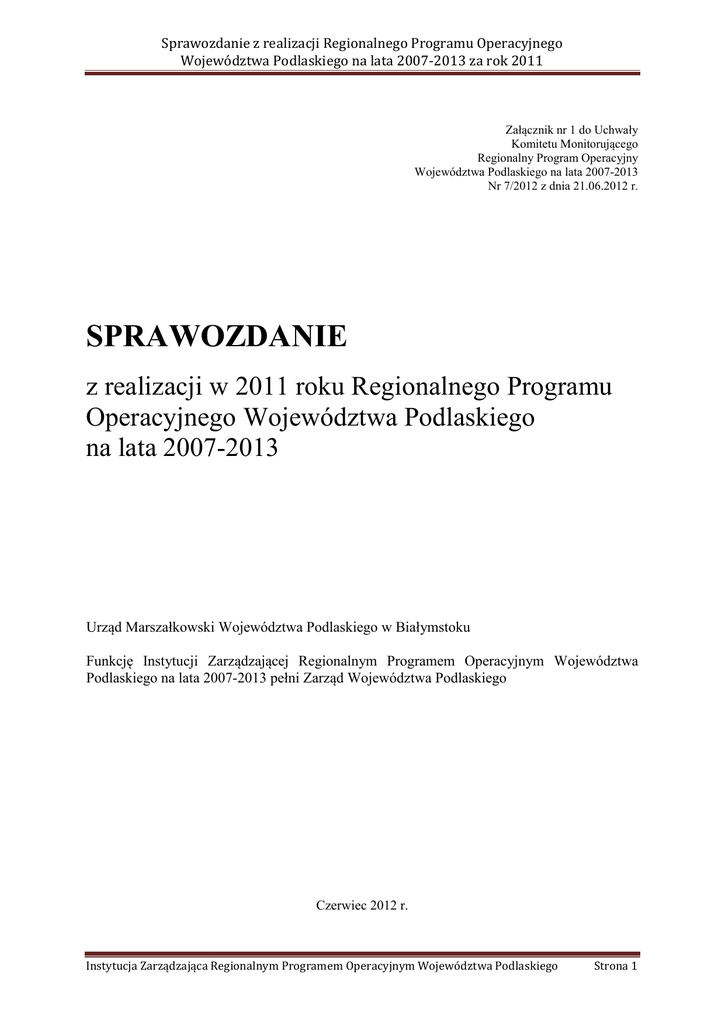 Sprawozdanie z realizacji Regionalnego Programu Operacyjnego Województwa Podlaskiego na lata 2007-2013 za rok 2011 Załącznik nr 1 do Uchwały Komitetu Monitorującego Regionalny Program Operacyjny Województwa Podlaskiego na lata 2007-2013 Nr 7/2012 z dnia 21.06.2012 r. SPRAWOZDANIE z realizacji w 2011 roku Regionalnego Programu Operacyjnego Województwa Podlaskiego na lata 2007-2013 Urząd Marszałkowski Województwa Podlaskiego w Białymstoku Funkcję Instytucji Zarządzającej Regionalnym Programem Operacyjnym Województwa Podlaskiego na lata 2007-2013 pełni Zarząd Województwa Podlaskiego Czerwiec 2012 r. Instytucja Zarządzająca Regionalnym Programem Operacyjnym Województwa Podlaskiego Strona 1 Sprawozdanie z realizacji Regionalnego Programu Operacyjnego Województwa Podlaskiego na lata 2007-2013 za rok 2011 WSTĘP Niniejsze sprawozdanie stanowi podsumowanie realizacji Regionalnego Programu Operacyjnego Województwa Podlaskiego na lata 2007 – 2013 w 2011 roku. Dokument przedstawia efekty wdrażania RPOWP oraz wpływ Programu na rozwój województwa podlaskiego. Sprawozdanie roczne z realizacji Regionalnego Programu Operacyjnego Województwa Podlaskiego na lata 2007-2013 (przyjętego decyzją Komisji Europejskiej Nr K(2007)5085 z dnia 11 października 2007 roku oraz uchwałą Zarządu Województwa nr 46/599/07 z dnia 9 listopada 2007 roku oraz zmienionego decyzją nr K(2011)9377 z dnia 21 grudnia 2011 r.) zostało sporządzone przez Departament Zarządzania Regionalnym Programem Operacyjnym, pełniący obowiązki Instytucji Zarządzającej RPOWP. Dokument jest jednym z elementów systemu monitorowania i zarządzania pomocą strukturalną dla regionu. Obejmuje okres od 1 stycznia do 31 grudnia 2011 roku. Został przygotowany w oparciu o system sprawozdawczości i monitoringu przewidziany w Rozporządzeniu Rady (WE) nr 1083/2006 z dnia 11 lipca 2006 r. ustanawiającym przepisy ogólne dotyczące Europejskiego Funduszu Rozwoju Regionalnego, Europejskiego Funduszu Społecznego oraz Funduszu Spójności i uchylającego rozporządzenie (WE) nr 1260/1999 (Dz. Urz. UE L 210/25 z 31.07.2006), a także Rozporządzeniu Komisji (WE) nr 1828/2006 z dnia 8 grudnia 2006 r. ustanawiającym szczegółowe zasady wykonania Rozporządzenia Rady (WE) nr 1083/2006 ustanawiającego przepisy ogólne dotyczące Europejskiego Funduszu Rozwoju Regionalnego, Europejskiego Funduszu Społecznego i Funduszu Spójności oraz Rozporządzenia (WE) nr 1080/2006 Parlamentu Europejskiego i Rady w sprawie Europejskiego Funduszu Rozwoju Regionalnego (Dz. Urz. UE L 371 z 27. 12.2006) oraz Wytycznych w zakresie sprawozdawczości, wydanych przez Ministra Rozwoju Regionalnego na podstawie art. 35 ust. 3 pkt 6 ustawy z dnia 6 grudnia 2006 r. o zasadach prowadzenia polityki rozwoju (Dz. U. Nr 227, poz. 1658, z późn. zm.). Regionalny Program Operacyjny Województwa Podlaskiego na lata 2007 – 2013 to pierwszy w historii tak duży program finansujący rozwój regionu. Województwo podlaskie ma typowo rolniczy charakter (przerost zatrudnienia w rolnictwie, wysokie bezrobocie i niski stopień towarowości produkcji). W związku z tym strategia programu ma na celu zmianę tej niekorzystnej struktury i przesunięcie pracowników z sektora rolnictwa do gałęzi przemysłu i usług, co przyczyni się do osiągnięcia wyższego tempa rozwoju gospodarczego. Działania te, zgodnie z założeniami Programu, prowadzone są przy poszanowaniu i zachowaniu dziedzictwa przyrodniczego i kulturowego regionu. Konsekwencją dążenia do realizacji opisanego wyżej celu głównego jest różnorakie wsparcie trzech obszarów – potencjałów rozwojowych województwa: inwestycje (wzrost inwestycji zewnętrznych), przedsiębiorcy (wzrost inwestycji wewnętrznych) oraz turystyka (dziedzina gospodarki, w której województwo ma potencjał inwestycyjny – dotychczas nie w pełni wykorzystywany). Szczegółowy opis poszczególnych obszarów wsparcia zawarty został w poniższym sprawozdaniu. Analiza realizacji Programu w okresie objętym sprawozdaniem zawarta jest w rozdziale drugim. Zawarte są w nim m.in. informacje dotyczące postępów rzeczowych i finansowych. Opisano w nim najistotniejsze obszary wsparcia oraz objęte pomocą grupy docelowe. Dokonano analizy jakościowej wdrażania Programu, w tym poziomu realizacji Instytucja Zarządzająca Regionalnym Programem Operacyjnym Województwa Podlaskiego Strona 2 Sprawozdanie z realizacji Regionalnego Programu Operacyjnego Województwa Podlaskiego na lata 2007-2013 za rok 2011 zapisanych wskaźników w nim. Trzeci rozdział niniejszego sprawozdania opisuje realizację Programu w podziale na osie priorytetowe, z uwzględnieniem zrealizowanych celów oraz zaistniałych problemów. W piątym rozdziale zawarte są informacje dotyczące realizowanych w regionie dużych projektów. Szósty rozdział poświęcony jest działaniom z zakresu pomocy technicznej i działań na rzecz wzmocnienia potencjału Instytucji Zarządzającej. Ostatni – siódmy rozdział tematyczny – poświęcono działaniom na rzecz informacji i promocji Programu. W sprawozdaniu zastosowano następujący kurs EURO: 1 EUR = 4,5270 PLN. Instytucja Zarządzająca Regionalnym Programem Operacyjnym Województwa Podlaskiego Strona 3 Sprawozdanie z realizacji Regionalnego Programu Operacyjnego Województwa Podlaskiego na lata 2007-2013 za rok 2011 INTRODUCTION The following report constitutes the summary of the implementation of the Regional Operational Programme of Podlaskie Voivodship (ROP of Podlaskie Voivodship) for years 2007 -2013 in year 2011. The document presents the effects of the implementation of ROP of Podlaskie Voivodship and the impact of the Programme on the development of Podlaskie Voivodship. The annual report on the implementation of the Regional Operational Programme of Podlaskie Voivodship for years 2007-2013 (approved by the decision of the European Commission No K(2011)9377 of 11 October 2007 and by the reso
