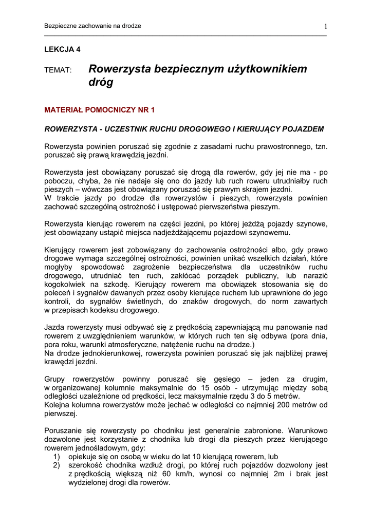 Lekcja 4 "Rowerzysta bezpiecznym użytkownikiem dróg"