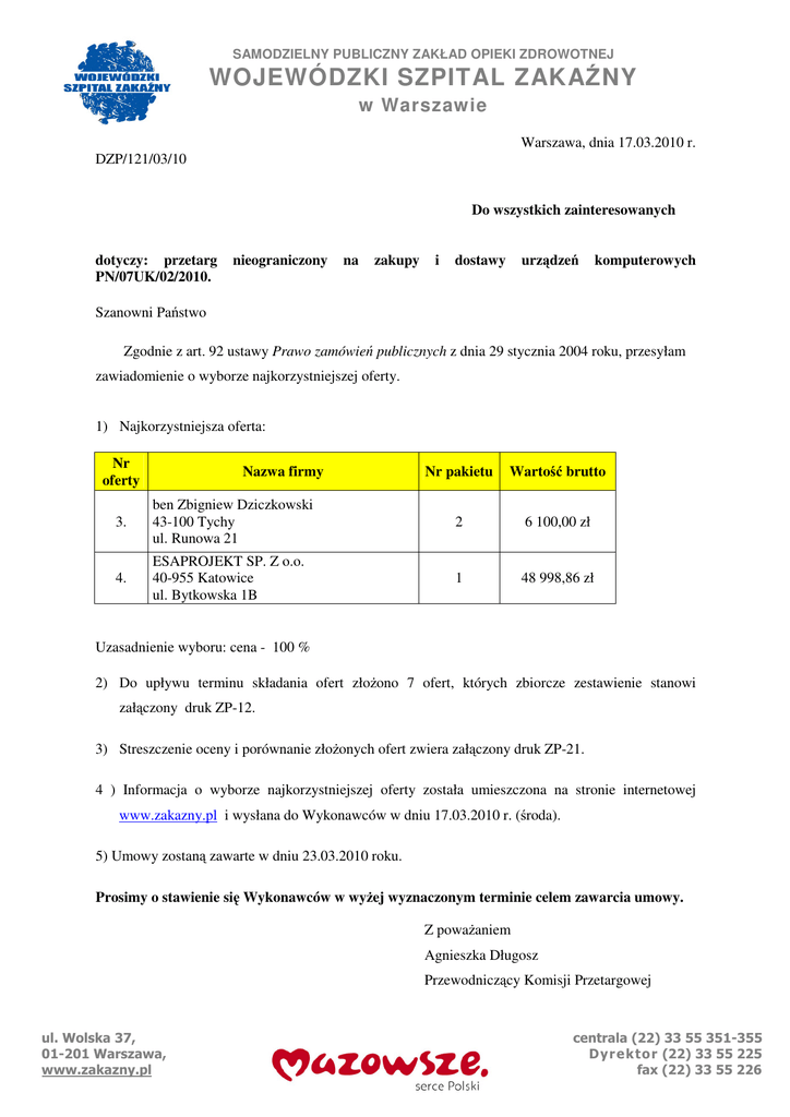 SAMODZIELNY PUBLICZNY ZAKŁAD OPIEKI ZDROWOTNEJ WOJEWÓDZKI SZPITAL ZAKAŹNY w Warszawie Warszawa, dnia 17.03.2010 r. DZP/121/03/10 Do wszystkich zainteresowanych dotyczy: przetarg PN/07UK/02/2010. nieograniczony na zakupy i dostawy urządzeń komputerowych Szanowni Państwo Zgodnie z art. 92 ustawy Prawo zamówień publicznych z dnia 29 stycznia 2004 roku, przesyłam zawiadomienie o wyborze najkorzystniejszej oferty. 1) Najkorzystniejsza oferta: Nr oferty Nazwa firmy Nr pakietu Wartość brutto 3. ben Zbigniew Dziczkowski 43-100 Tychy ul. Runowa 21 2 6 100,00 zł 4. ESAPROJEKT SP. Z o.o. 40-955 Katowice ul. Bytkowska 1B 1 48 998,86 zł Uzasadnienie wyboru: cena - 100 % 2) Do upływu terminu składania ofert złoŜono 7 ofert, których zbiorcze zestawienie stanowi załączony druk ZP-12. 3) Streszczenie oceny i porównanie złoŜonych ofert zwiera załączony druk ZP-21. 4 ) Informacja o wyborze najkorzystniejszej oferty została umieszczona na stronie internetowej www.zakazny.pl i wysłana do Wykonawców w dniu 17.03.2010 r. (środa). 5) Umowy zostaną zawarte w dniu 23.03.2010 roku. Prosimy o stawienie się Wykonawców w wyŜej wyznaczonym terminie celem zawarcia umowy. Z powaŜaniem Agnieszka Długosz Przewodniczący Komisji Przetargowej ul. Wolska 37, 01-201 Warszawa, www.zakazny.pl centrala (22) 33 55 351-355 Dyr e k to r (22) 33 55 225 fax (22) 33 55 226 oznaczenie sprawy PN/07UK/02/2010 DRUK ZP-12 Pieczęć zamawiającego Zbiorcze zestawienie ofert/ofert wstępnych* Numer oferty Nazwa (firma) i adres wykonawcy Nr pakietu Cena Termin wykonania Warunki płatności Przelew 30 dni 1. ARSO SERWIS P.U. 71-312 Szczecin ul. Domańskiego 7/1 2 9 230,52 zł 31.03.2010 2. TREBIT Robert Makowski 26-500 Szydłowiec ul. Staszica 25/42 2 8 698,60 zł 31.03.2010 2 6 100,00 zł 31.03.2010 Przelew 30 dni 1 48 998,86 zł 31.03.2010 Przelew 30 dni 2 8 527,80 zł 31.03.2010 Przelew 30 dni 3. 4. 5. ben Zbigniew Dziczkowski 43-100 Tychy ul. Runowa 21 ESAPROJEKT SP. z o.o. 40-955 Katowice ul. Bytkowska 1B. euroimpex II Sp. z o.o. 01-460 Warszawa ul. Górczewska 228D/40 Przelew 30 dni oznaczenie sprawy PN/07UK/02/2010 DRUK ZP-12 6. APEX SYSTEM Sp. z o.o. 00-108 Warszawa ul. Zielna 39 2 6 209,80 zł 31.03.2010 Przelew 30 dni 7. SET-UP SYSTEMY KOMPUTEROWE MoŜdŜonek GraŜyna 04-501 Warszawa ul. Płowiecka 70 1 77 726,20 zł 31.03.2010 Przelew 30 dni .................................................... podpis osoby sporządzającej protokół) numer strony ... ......................................................................... (data i podpis kierownika zamawiającego lub osoby upowaŜnionej) oznaczenie sprawy PN/07UK/02/2010 DRUK ZP-21 Pieczęć zamawiającego Streszczenie oceny i porównania złoŜonych ofert Pakiet 1 Nr oferty Liczba punktów 4 100 7 63 Pakiet 2 Nr oferty 1 2 3 5 6 ..................................................... (podpis osoby sporządzającej protokół) numer strony…… Liczba punktów 66 70 100 71 98 …………………………………………………………… (data i podpis kierownika zamawiajacego lub osoby upowaŜnionej)