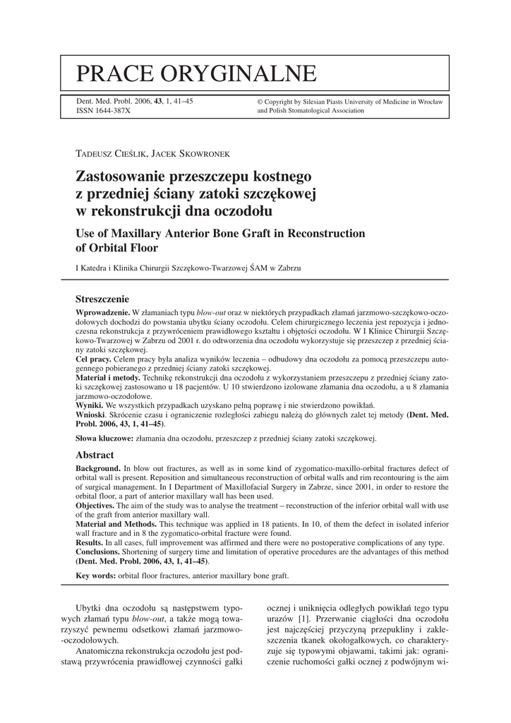 PRACE ORYGINALNE Dent. Med. Probl. 2006, 43, 1, 41–45 ISSN 1644−387X © Copyright by Silesian Piasts University of Medicine in Wrocław and Polish Stomatological Association TADEUSZ CIEŚLIK, JACEK SKOWRONEK Zastosowanie przeszczepu kostnego z przedniej ściany zatoki szczękowej w rekonstrukcji dna oczodołu Use of Maxillary Anterior Bone Graft in Reconstruction of Orbital Floor I Katedra i Klinika Chirurgii Szczękowo−Twarzowej ŚAM w Zabrzu Streszczenie Wprowadzenie. W złamaniach typu blow−out oraz w niektórych przypadkach złamań jarzmowo−szczękowo−oczo− dołowych dochodzi do powstania ubytku ściany oczodołu. Celem chirurgicznego leczenia jest repozycja i jedno− czesna rekonstrukcja z przywróceniem prawidłowego kształtu i objętości oczodołu. W I Klinice Chirurgii Szczę− kowo−Twarzowej w Zabrzu od 2001 r. do odtworzenia dna oczodołu wykorzystuje się przeszczep z przedniej ścia− ny zatoki szczękowej. Cel pracy. Celem pracy była analiza wyników leczenia – odbudowy dna oczodołu za pomocą przeszczepu auto− gennego pobieranego z przedniej ściany zatoki szczękowej. Materiał i metody. Technikę rekonstrukcji dna oczodołu z wykorzystaniem przeszczepu z przedniej ściany zato− ki szczękowej zastosowano u 18 pacjentów. U 10 stwierdzono izolowane złamania dna oczodołu, a u 8 złamania jarzmowo−oczodołowe. Wyniki. We wszystkich przypadkach uzyskano pełną poprawę i nie stwierdzono powikłań. Wnioski. Skrócenie czasu i ograniczenie rozległości zabiegu należą do głównych zalet tej metody (Dent. Med. Probl. 2006, 43, 1, 41–45). Słowa kluczowe: złamania dna oczodołu, przeszczep z przedniej ściany zatoki szczękowej. Abstract Background. In blow out fractures, as well as in some kind of zygomatico−maxillo−orbital fractures defect of orbital wall is present. Reposition and simultaneous reconstruction of orbital walls and rim recontouring is the aim of surgical management. In I Department of Maxillofacial Surgery in Zabrze, since 2001, in order to restore the orbital floor, a part of anterior maxillary wall has been used. Objectives. The aim of the study was to analyse the treatment – reconstruction of the inferior orbital wall with use of the graft from anterior maxillary wall. Material and Methods. This technique was applied in 18 patients. In 10, of them the defect in isolated inferior wall fracture and in 8 the zygomatico−orbital fracture were found. Results. In all cases, full improvement was affirmed and there were no postoperative complications of any type. Conclusions. Shortening of surgery time and limitation of operative procedures are the advantages of this method (Dent. Med. Probl. 2006, 43, 1, 41–45). Key words: orbital floor fractures, anterior maxillary bone graft. Ubytki dna oczodołu są następstwem typo− wych złamań typu blow−out, a także mogą towa− rzyszyć pewnemu odsetkowi złamań jarzmowo− −oczodołowych. Anatomiczna rekonstrukcja oczodołu jest pod− stawą przywrócenia prawidłowej czynności gałki ocznej i uniknięcia odległych powikłań tego typu urazów [1]. Przerwanie ciągłości dna oczodołu jest najczęściej przyczyną przepukliny i zakle− szczenia tkanek okołogałkowych, co charaktery− zuje się typowymi objawami, takimi jak: ograni− czenie ruchomości gałki ocznej z podwójnym wi− 42 T. CIEŚLIK, J. SKOWRONEK dzeniem (diplopia), zapadnięcie gałki ocznej (eno− ftalmia) i zaburzenie unerwienia czuciowego [2–5]. Celem leczenia jest wczesne odtworzenie uszkodzonego dna oczodołu w celu uzyskania podparcia dla jego zawartości. Należy podkreślić, że odroczona rewizja złamania może być przyczy− ną niepowodzenia zabiegu, a przetrwała diplopia wymaga często specjalistycznego leczenia okuli− stycznego [6]. Dlatego ważne jest wczesne rozpo− znanie złamania i wykonanie tomografii kompute− rowej w przypadku podejrzenia takiego urazu [7]. Mimo istnienia wielu różnorodnych tworzyw, w dalszym ciągu w rekonstrukcji złamań kości części twarzowej czaszki najczęściej wykorzystu− je się przeszczepy kostne. Należy wymienić trady− cyjne zastosowanie przeszczepów z chrząstki że− bra, grzebienia kości biodrowej i kości strzałkowej [6, 8–13]. Inną okolicą wykorzystywaną do pobra− nia przeszczepów jest spojenie żuchwy, wyrostek dziobiasty i przegroda nosa [14–16]. W odbudo− wie zarysu ścian oczodołu mają także zastosowa− nie przeszczepy z kości pokrywy czaszki [10, 12]. W chirurgii oczodołu wykorzystuje się rów− nież auto− i homogenne materiały, takie jak okost− na, opona twarda i powięź mięśnia szerokiego uda [14, 17] oraz wszczepy alloplastyczne, np.: Ethi− sorb, Silastic i folia z polidioksanonu (PDS) [18]. Od 2001 r. w Klinice Chirurgii Szczękowo− −Twarzowej w Zabrzu do rekonstrukcji dna oczo− dołu stosuje się u większości chorych przeszczep z przedniej ściany zatoki szczękowej. Celem pracy była analiza wyników leczenia – odbudowy uszkodzonego dna oczodołu za pomo− cą przeszczepu autogennego pobieranego z przed− niej ściany zatoki szczękowej. Materiał i metody Leczeniem objęto 18 chorych: 15 mężczyzn (84%) i 3 kobiety (16%), z pourazowym ubyt− kiem dna oczodołu. U 10 chorych stwierdzono ty− powe, izolowane złamanie dna oczodołu, a u 8 złamania jarzmowo−oczodołowe z ubytkiem kost− nym ściany dolnej. Rozpoznanie było postawione na podstawie badania klinicznego, okulistycznego i radiologicznego w projekcji na zatoki szczęko− we oraz tomografii komputerowej (tab 1). U większości chorych wystąpiły typowe objawy złamania. U 11 leczonych pacjentów stwierdzono zapadnięcie gałki ocznej z podwójnym widze− niem. Zabiegi wykonano w warunkach leczenia sta− cjonarnego w znieczuleniu ogólnym z intubacją dotchawiczą. U 2 chorych wykorzystano cięcie przezspojówkowe, a u pozostałych cięcie podrzę− Tabela 1 Płeć i typ złamań u leczonyc