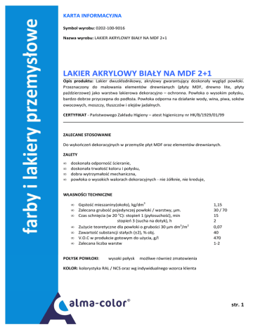 KARTA INFORMACYJNA Symbol wyrobu: 0202-100-9016 Nazwa wyrobu: LAKIER AKRYLOWY BIAŁY NA MDF 2+1 LAKIER AKRYLOWY BIAŁY NA MDF 2+1 Opis produktu: Lakier dwuskładnikowy, akrylowy gwarantujący doskonały wygląd powłoki. Przeznaczony do malowania elementów drewnianych (płyty MDF, drewno lite, płyty paździerzowe) jako warstwa lakierowa dekoracyjno – ochronna. Powłoka o wysokim połysku, bardzo dobrze przyczepna do podłoża. Powłoka odporna na działanie wody, wina, piwa, soków owocowych, moszczy, tłuszczów i olejów jadalnych. CERTYFIKAT - Państwowego Zakładu Higieny – atest higieniczny nr HK/B/1929/01/99 ZALECANE STOSOWANIE Do wykończeń dekoracyjnych w przemyśle płyt MDF oraz elementów drewnianych. ZALETY • • • • doskonała odporność ścieranie, doskonała trwałość koloru i połysku, dobra wytrzymałość mechaniczna, powłoka o wysokich walorach dekoracyjnych - nie żółknie, nie kreduje, WŁASNOŚCI TECHNICZNE • • • • • • • Gęstość mieszaniny(około), kg/dm3 Zalecana grubość pojedynczej powłoki / warstwy, µm. Czas schnięcia (w 20 oC): stopień 1 (pyłosuchość), min stopień 3 (sucha na dotyk), h Zużycie teoretyczne dla powłoki o grubości 30 µm dm3/m2 Zawartość substancji stałych (±2), % obj. V.O.C w produkcie gotowym do użycia, g/l Zalecana liczba warstw POŁYSK POWŁOKI: wysoki połysk 1,15 30 / 70 15 2 0,07 40 470 1-2 możliwe również zmatowienia KOLOR: kolorystyka RAL / NCS oraz wg indywidualnego wzorca klienta str. 1 SPOSÓB APLIKACJI Przygotowanie farby - składniki I i II dokładnie wymieszać – (II składnik - 0104-009-0000) zmieszać ze sobą w j proporcji objętościowej: • I składnik 2 • II składnik 1 • rozpuszczalnik o symbolu 8002, 8010 - max 20 % obj. Po upływie 15 minut (w temp. 20°C) wyrób nadaje się do użycia. Temperatura przechowywania wyrobu: 5oC-35oC. Podłoże Oczyszczanie i odtłuszczanie. Przed szlifowaniem należy upewnić się, że powierzchnia przeznaczona do malowania lub lakierowania jest czysta i dobrze odtłuszczona oraz sucha. Szlifowanie. Dokładne przeszlifowanie każdej powierzchni przed malowaniem jest bardzo istotne, gdyż pozwala uzyskać dobrą przyczepność pomiędzy warstwami oraz gładkie i obojętne podłoże. Przed nałożeniem każdej kolejnej warstwy lakieru przeszlifować poprzednią warstwę. Podłoże należy przeszlifować papierem ściernym o gradacji (ziarnistości) – 320 - 420. Prace te najlepiej wykonywać ręcznie. Nie doradzamy mechanicznego szlifowania w połączeniu z gruboziarnistym papierem, ponieważ może to spowodować powstanie rys oraz zeszlifowanie zbyt grubej warstwy lakieru. Dobór odpowiedniego papieru ściernego oraz wielkość ziaren został opisany dla każdego systemu. Metoda aplikacji wyrobu • pędzel • natrysk powietrzny (po rozcieńczeniu ; lepkość DIN 4: 20–22 s): Ø 1,2-1,4 mm; 2,5-3,5 atm odległość dyszy od podłoża 20-25 cm SPOSÓB STOSOWANIA Lakier akrylowy nakłada się na uprzednio natryśnięte i wysuszone podkłady. Natryskiwać należy 2-3 pojedyncze warstwy pozostawiając czas na odparowanie 20-30 min między powłokami (zależnie od temperatury i grubości warstwy). Warunki podczas malowania i utwardzania powłoki: • minimalna temperatura podłoża: 10 - 15oC, • wilgotność względna powietrza do 80% • dobra wentylacja. Czas do nałożenia kolejnych warstw: najkrótszy w 20 oC – 15-20 min, w 15 oC – 20-25 min, Podane czasy dotyczą powłoki o zalecanej grubości, schnącej w warunkach dobrej wentylacji. Czasy te mogą ulec zmianie wraz ze zmianą temperatury, warunków wentylacji, ilości warstw i grubości pokrycia str. 2 INFORMACJA DODATKOWA W zależności od przeznaczenia i rodzaju podłoża można założyć grubość pojedynczej powłoki inną niż zalecana w instrukcji stosowania. Przy natrysku powietrznym typowy zakres grubości jednej powłoki wynosi od 30 do 40 µm. Zmiana grubości powłoki powoduje zmianę zużycia teoretycznego, grubości warstwy, czasów schnięcia oraz czasu do nałożenia kolejnej warstwy TRWAŁOŚĆ WYROBU: 12 miesięcy od daty produkcji w fabrycznie zamkniętym opakowaniu. UWAGA! Wyrób do profesjonalnego stosowania w przemyśle. Informacje dotyczące bezpieczeństwa stosowania wyrobu zawarte są w Karcie Charakterystyki. str. 3