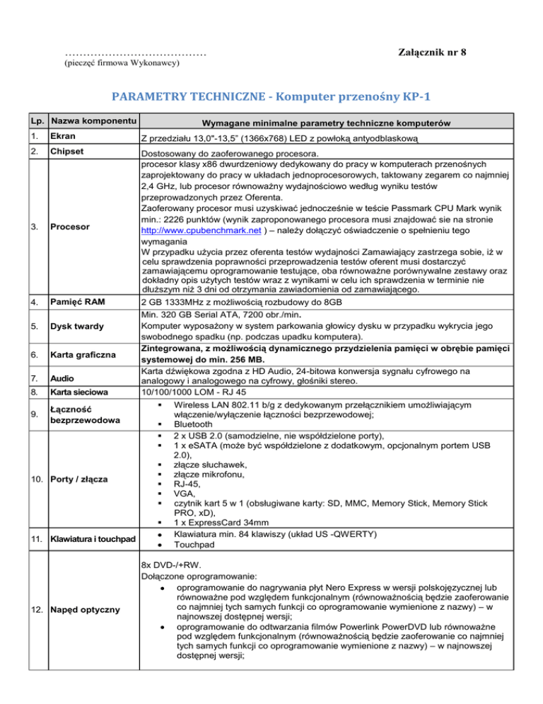 ………………………………… Załącznik nr 8 (pieczęć firmowa Wykonawcy) PARAMETRY TECHNICZNE - Komputer przenośny KP-1 Lp. Nazwa komponentu Wymagane minimalne parametry techniczne komputerów 1. Ekran Z przedziału 13,0"-13,5” (1366x768) LED z powłoką antyodblaskową 2. Chipset 3. Procesor Dostosowany do zaoferowanego procesora. procesor klasy x86 dwurdzeniowy dedykowany do pracy w komputerach przenośnych zaprojektowany do pracy w układach jednoprocesorowych, taktowany zegarem co najmniej 2,4 GHz, lub procesor równoważny wydajnościowo według wyniku testów przeprowadzonych przez Oferenta. Zaoferowany procesor musi uzyskiwać jednocześnie w teście Passmark CPU Mark wynik min.: 2226 punktów (wynik zaproponowanego procesora musi znajdować sie na stronie http://www.cpubenchmark.net ) – należy dołączyć oświadczenie o spełnieniu tego wymagania W przypadku użycia przez oferenta testów wydajności Zamawiający zastrzega sobie, iż w celu sprawdzenia poprawności przeprowadzenia testów oferent musi dostarczyć zamawiającemu oprogramowanie testujące, oba równoważne porównywalne zestawy oraz dokładny opis użytych testów wraz z wynikami w celu ich sprawdzenia w terminie nie dłuższym niż 3 dni od otrzymania zawiadomienia od zamawiającego. 4. Pamięć RAM 5. Dysk twardy 6. Karta graficzna 7. Audio 8. Karta sieciowa 9. Łączność bezprzewodowa 10. Porty / złącza 2 GB 1333MHz z możliwością rozbudowy do 8GB Min. 320 GB Serial ATA, 7200 obr./min. Komputer wyposażony w system parkowania głowicy dysku w przypadku wykrycia jego swobodnego spadku (np. podczas upadku komputera). Zintegrowana, z możliwością dynamicznego przydzielenia pamięci w obrębie pamięci systemowej do min. 256 MB. Karta dźwiękowa zgodna z HD Audio, 24-bitowa konwersja sygnału cyfrowego na analogowy i analogowego na cyfrowy, głośniki stereo. 10/100/1000 LOM - RJ 45 11. Klawiatura i touchpad 12. Napęd optyczny Wireless LAN 802.11 b/g z dedykowanym przełącznikiem umożliwiającym włączenie/wyłączenie łączności bezprzewodowej; Bluetooth 2 x USB 2.0 (samodzielne, nie współdzielone porty), 1 x eSATA (może być współdzielone z dodatkowym, opcjonalnym portem USB 2.0), złącze słuchawek, złącze mikrofonu, RJ-45, VGA, czytnik kart 5 w 1 (obsługiwane karty: SD, MMC, Memory Stick, Memory Stick PRO, xD), 1 x ExpressCard 34mm Klawiatura min. 84 klawiszy (układ US -QWERTY) Touchpad 8x DVD-/+RW. Dołączone oprogramowanie: oprogramowanie do nagrywania płyt Nero Express w wersji polskojęzycznej lub równoważne pod względem funkcjonalnym (równoważnością będzie zaoferowanie co najmniej tych samych funkcji co oprogramowanie wymienione z nazwy) – w najnowszej dostępnej wersji; oprogramowanie do odtwarzania filmów Powerlink PowerDVD lub równoważne pod względem funkcjonalnym (równoważnością będzie zaoferowanie co najmniej tych samych funkcji co oprogramowanie wymienione z nazwy) – w najnowszej dostępnej wersji; 13. Bateria 4 komorowa, Li-Ion, gwarantująca uzyskanie w teście BAPCO Mobilemark 2007 Battery Life Rating wyniku minimum 180 minut. Potwierdzeniem spełnienia tego wymogu powinien być załączony przez Wykonawcę do oferty oraz dostarczonego sprzętu, wydruk z przeprowadzonych testów dla oferowanej konfiguracji komputera. Testy powinny być potwierdzone przez przedstawiciela producenta w Polsce. 14. Zasilacz Zasilacz min. 65W, waga maksymalna 0,29 kg Preinstalowany fabrycznie Microsoft Windows 7 Professional PL 32-bit. Zainstalowany system nie wymagający aktywacji za pomocą telefonu lub Internetu w firmie 15. System operacyjny Microsoft. Dołączony nośnik z oprogramowaniem. 16. Bezpieczeństwo 17. Złącze typu Kensington Lock. Certyfikat ISO 9001:2000 dla producenta sprzętu (należy załączyć do oferty) Certyfikat ISO 14001 dla producenta sprzętu (należy załączyć do oferty) Certyfikaty i standardy Waga z baterią 4 komorową max. 1,8kg 18. Waga 19. Gwarancja 20. Inne 5 lat w następnym dniu roboczym (dotyczy sprzętu). Czas reakcji serwisu - do końca następnego dnia roboczego. Firma serwisująca musi posiadać ISO 9001:2000 na świadczenie usług serwisowych oraz posiadać autoryzacje producenta komputera - dokumenty potwierdzające załączyć do oferty. Oświadczenie producenta komputera, że w przypadku nie wywiązywania się z obowiązków gwarancyjnych oferenta lub firmy serwisującej, przejmie na siebie wszelkie zobowiązania związane z serwisem. Możliwość telefonicznego sprawdzenia konfiguracji sprzętowej komputera oraz warunków gwarancji po podaniu numeru seryjnego bezpośrednio u producenta lub jego przedstawiciela. Dedykowane przyciski, umożliwiające: odtwarzanie/pauza, odtwarzanie poprzedniego utworu, odtwarzanie następnego utworu, stop, zwiększenie siły dźwięku, zmniejszenie siły dźwięku. Dołączony nośnik ze sterownikami. Obudowa notebooka w kolorze czarnym lub srebrnym lub w innych ciemnych, przygaszonych (niejaskrawych) kolorach Nazwa urządzenia: ………………………………………………………………………….. Cena netto za 1 sztukę: ……………… x …….% VAT ……………kwota VAT = =………………Cena jednostkowa brutto x 12 sztuk = Wartość brutto: ………………… PLN ……………………………… (Data) ……………………………….. (Podpis i pieczęć osoby upoważnionej do składania oświadczeń w imieniu Wykonawcy)
