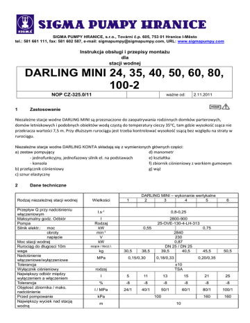 SIGMA PUMPY HRANICE, s.r.o., Tovární č.p. 605, 753 01 Hranice I-Město tel.: 581 661 111, fax: 581 602 587, e-mail: [email protected], URL: www.sigmapumpy.com Instrukcja obsługi i przepisy montażu dla stacji wodnej DARLING MINI 24, 35, 40, 50, 60, 80, 100-2 ważne od: NOP CZ-325.0/11 1 2.11.2011 Zastosowanie Niezależne stacje wodne DARLING MINI są przeznaczone do zaopatrywania rodzinnych domków parterowych, domów letniskowych i podobnych obiektów wodą czystą do temperatury cieczy 35oC, tam gdzie wysokość ssąca nie przekracza wartości 7,5 m. Przy dłuższym rurociągu jest trzeba kontrolować wysokość ssącą bez względu na straty w rurociągu. Niezależne stacje wodne DARLING KONTA składają się z wymienionych głównych części: a) zestaw pompujący d) manometr - jednofunkcyjny, jednofazowy silnik el. na podstawach - konsola b) przełącznik ciśnieniowy c) sznur elastyczny 2 e) kształtka f) zbiornik ciśnieniowy z workiem gumowym g) wąż Dane techniczne Rodzaj niezależnej stacji wodnej Przepływ Q przy nadciśnieniu włączeniowym Maksymalny godz. Odbiór Pompa Silnik elektr.: moc obroty napięcie Moc stacji wodnej Rurociąg do długosci 10m waga Nadciśnienie włączeniowe/wyłączeniowe Tolerancja Wyłącznik ciśnieniowy Największy odbiór między wyłączeniem a włączeniem Tolerancja Objętosć zbiornika / maks. nadciśnienie Przed pompowanie Największy wyciek nad stacją wodną Wielkości 1 DARLING MINI – wykonanie wertykalne 2 3 4 5 l.s-1 0,8-0,25 l Rodzaj kW min-1 V kW 2800-900 25-OVE-130-4-LH-313 0,55 ssące / tłocz.l. kg MPa 30,5 38,5 0,15/0,30 6 0,75 2840 230 0,87 DN 25 / DN 25 39,5 40,5 0,18/0,33 45,5 50,5 0,20/0,35 ±10 TSA rodzaj l 5 11 13 15 21 25 % -8 -8 -8 -8 -8 -8 l / MPa 24/1 40/1 50/1 60/1 80/1 100/1 160 160 kPa m 100 10 Wysokość ssąca m Ekwiwalencyjny poziom dB akustycznego ciśnienia A Na dodaną ilość Q wpływa wysokość ssąca, która jest w zakresie 1,7 – 7,5 m. 7,5 70 Bezpieczeństwo 3 Niniejsza NOP zawiera podstawowe polecenia, które muszą zostać dotrzymane w ciągu instalacji, działania i konserwacji pompy. Dlatego jest potrzebne, by właściciel i osoby obsługujące zawsze przed montażem i wprowadzeniem pompy do eksploatacji dokładnie przeczytali sobie jego tekst. Również jest wymagane, by dana NOP znajdowała się w miejscu montażu pompy po cały czas używania. Dotrzymane muszą zostać nie tylko powyżej wymienione ogólne instrukcje bezpieczeństwa, które są wymienione pod niniejszym akapitem, ale także wszystkie specyficzne instrukcje bezpieczeństwa, np. dla używania prywatnego. Ostrzeżenia umieszczone prosto na pompie, np.: - Strzałka kierunku obrotu - Kierunek przepływu - Etykieta informacyjna Jest niezbędne bezwarunkowo respektować i utrzymywać w stanie czytelnym. Niedotrzymywanie poleceń bezpieczeństwa może spowodować zagrożenie osób, środowiska i samych pomp. Dalej może spowodować stratę wszelkich praw gwarancyjnych. Bezpieczeństwo eksploatacyjne zestawy pompowej jest zabezpieczone tylko przy używaniu w celu według punktu 1 niniejszej NOP. Wartości graniczne wymienione v NOP nie mogą być w żadnym wypadku przekroczone. W niniejszej NOP znajdują się poniższe oznakowania: Ostrzeżenie na możliwe uszkodzenie pompy albo jej funkcji Ostrzeżenie na ogólne niebezpieczeństwa Ostrzeżenie przed niebezpieczeństwem obrażenia prądem elektrycznym Instrukcje bezpieczeństwa dla właściciela i osób obsługujących - - Nie remontować stację wodną przy eksploatacji albo pod ciśnieniem pompowanej cieczy. Zapewnić by przy remontach urządzenia pompującego nie mogła osoba nieupoważniona uruchomić silnik napędowy. Dbać by ingerencje do sprzętu elektrycznego (razem z przyłączeniem do sieci) przeprowadzała tylko osoba upoważniona, tzn. osoba z kwalifikacją odpowiadającą niebezpieczeństwu przeprowadzanych czynności i z tego płynącej odpowiedzialności. Pokrywy ochronne przed częściami poruszającymi się (np. złączami) nie mogą być usuwane z urządzenia przy eksploatacji. Instrukcje bezpieczeństwa dla prac konserwacyjnych i montażowych Właściciel powinien zadbać, żeby wszystkie prace konserwacyjne, kontrolne i montażowe przeprowadzał upoważniony i zakwalifikowany personel, który był szczegółowo zaznajomiony z NOP. Prace na zestawie przeprowadzają się po jego odstawieniu z eksploatacji. Przy tym musi dotrzymywać się opisany sposób do odstawienia urządzenia z eksploatacji. 4 Montaż 4.1 Umieszczenie stacji wodnej Wykonanie pozwala umieszczenie stacji wodnej w środowisku zwykłym i wilgotnym, do miejsc chronionych przed zalaniem i zamarznięciem. Stacja wodna w wykonaniu zwykłym nie umieszcza się z powodu hałaśliwości do przestrzeni mieszkaniowych albo przestrzeni z nimi bezpośrednio sąsiadujących. Jest niezbędne by stacja wodna była umieszczona jak najbliżej do źródła wodnego tak, by redukowana wysokość ssąca nie przekroczyła 8 m. Dla każdego urządzenia pompującego jest zawsze korzystne uniknąć od długiego i rozczłonkowanego rurociągu ssącego, ponieważ sytuacja na stronie ssącej jak najbardziej wpływa na gospodarną i niezawodną eksploatację pompy. W związku z tym, że przy wzrastaniu redukowanej wysokości ssącej dochodzi do spadku przepływu i obliczenie strat jest złożone, są w następującej tab. dla pionowych odległości między powierzchnią wody w studni i poziomą równią przechadzającą środkiem pompy – zsg (m) wymienione maks. długości rurociągu ssącego. Wymienione maks. długości są przeznaczone dla zwykłych systemów ssących wyposażonych koszem ssącym i 2 łuki odpowiedniej wielkości. Pionowa odległość Maks. Długość Maks. długość rurociągu Przykład: Dla stacji wodnej była zmierzona pionowa od powierzchni DN25 (G1) ssącego DN32 (G11/4) odległość między powierzchnią wody i osią pompy zsg = 1 m 90 m 350 m 6 m. Zakładana długość rurociągu ssącego jest 1