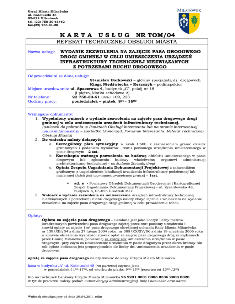 Urząd Miasta Milanówka ul. Kościuszki 45 05-822 Milanówek tel. (22) 758-30-61/62 fax.(22) 755-81-20 KARTA USŁUG NR TOM/04 REFERAT TECHNICZNEJ OBSŁUGI MIASTA Nazwa usługi: WYDANIE ZEZWOLENIA NA ZAJĘCIE PASA DROGOWEGO DROGI GMINNEJ W CELU UMIESZCZENIA URZĄDZEŃ INFRASTRUKTURY TECHNICZNEJ NIEZWIĄZANYCH Z POTRZEBAMI RUCHU DROGOWEGO Odpowiedzialni za daną usługę: Stanisław Borkowski – główny specjalista ds. drogowych Kinga Niedźwiecka – Reszczyk – podinspektor Miejsce urzędowania: ul. Spacerowa 4, budynek „C”, pokój nr 18 (I piętro, klatka schodowa A) Nr telefonu: 22 758-30-61 wew. 109, 223 Godziny pracy: poniedziałek – piątek 800 - 1600 Wymagane dokumenty: 1. Wypełniony wniosek o wydanie zezwolenia na zajęcie pasa drogowego drogi gminnej w celu umieszczenia urządzeń infrastruktury technicznej. (wniosek do pobrania w Punktach Obsługi Interesanta lub na stronie internetowej www.milanowek.pl – zakładka Samorząd: Poradnik Interesanta: Referat Technicznej Obsługi Miasta) 2. Do wniosku należy dołączyć: a. Szczegółowy plan sytuacyjny w skali 1:500, z zaznaczeniem granic działek gruntowych i podaniem wymiarów pasie drogowym – 2 szt. rzutu poziomego urządzenia umieszczanego w b. Kserokopia ważnego pozwolenia na budowę obiektu umieszczanego w pasie drogowym lub zgłoszenia budowy właściwemu organowi administracji architektoniczno-budowlanej – na żądanie Zarządy drogi c. Opinia Zespołu Uzgadniania Dokumentacji Projektowej z załącznikiem graficznym z uzgodnieniem lokalizacji urządzenia infrastruktury podziemnej lub naziemnej (jeżeli jest wymagana przepisami prawa) – 1szt. ad. e - Powiatowy Ośrodek Dokumentacji Geodezyjnej i Kartograficznej Zespół Uzgadniania Dokumentacji Projektowej – ul. Żyrardowska 48, budynek A, 05-825 Grodzisk Maz.. 3. Wniosek o wydanie zezwolenia na umieszczenie urządzeń infrastruktury technicznej niezwiązanych z potrzebami ruchu drogowego należy złożyć łącznie z wnioskiem na wydanie zezwolenia na zajęcie pasa drogowego drogi gminnej w celu prowadzenia robót. Opłaty: Opłata za zajęcie pasa drogowego – ustalana jest jako iloczyn liczby metrów kwadratowych powierzchni pasa drogowego zajętej przez rzut poziomy urządzenia i stawki opłaty za zajęcie 1m2 pasa drogowego określonej uchwałą Rady Miasta Milanówka nr 139/XIII/04 z dnia 27 lutego 2004 roku, nr 388/XXXIV/06 z dnia 19 września 2006 roku w sprawie określenia wysokości stawek opłat za zajęcie pasa drogowego dróg zarządzanych przez Gminę Milanówek, pobieranej za każdy rok umieszczenia urządzenia w pasie drogowym, przy czym za umieszczenie urządzenia w pasie drogowym przez okres krótszy niż rok opłata obliczana jest proporcjonalnie do liczby dni umieszczenia urządzenia w pasie drogowym. opłatę za zajęcie pasa drogowego należy wnieść do kasy Urzędu Miasta Milanówka kasa w budynku „A” ul. Kościuszki 45 (na parterze) czynna jest: w poniedziałek 1100-1700, od wtorku do piątku 900-1500 (przerwa od 1200-1230) lub na rachunek bankowy Urzędu Miasta Milanówka 96 9291 0001 0086 8336 2000 0020 w tytule przelewu należy podać: numer decyzji administracyjnej, imię i nazwisko oraz adres Wniosek obowiązujący od dnia 26.04.2011 roku Ustawowy termin odbioru dokumentu: wydanie zezwolenia lub jego odmowa następuje w formie decyzji administracyjnej, w nieprzekraczalnym terminie do 30 dni od daty złożenia wniosku z wymaganymi dokumentami, lub do 60 dni od daty złożenia wniosku w przypadku sprawy szczególnie skomplikowanej. Tryb odwoławczy: do Samorządowego Kolegium Odwoławczego, w terminie 14 dni od dnia doręczenia decyzji, za pośrednictwem Burmistrza Miasta Milanówka, który decyzję wydał. Odbiór dokumentu: ul. Spacerowa 4, pokój nr 18 - budynek C (I piętro) Uwagi: 1. Wniosek o wydanie zezwolenia na zajęcie pasa drogowego drogi gminnej w celu umieszczenia 2. 3. 4. 5. urządzeń infrastruktury technicznej należy złożyć z wyprzedzeniem umożliwiającym rozpatrzenie wniosku i wydanie zezwolenia przed umieszczeniem urządzenia. Zezwolenie na zajęcie pasa drogowego drogi gminnej w celu umieszczenia urządzeń infrastruktury technicznej wydaje się na czas określony. Ze względu na potrzeby związane z zarządzaniem drogami, wymogi wynikające z warunków technicznych dróg publicznych i bezpieczeństwa ruchu drogowego oraz istniejące warunki atmosferyczne, może nastąpić odmowa wydania zezwolenia. Przed faktycznym umieszczeniem urządzeń infrastruktury technicznej w pasie drogowym należy wystąpić do Zarządcy drogi o wydanie odrębnego zezwolenia na zajęcie pasa drogowego drogi gminnej w celu prowadzenia robót. Za zajęcie pasa drogowego bez zezwolenia pobiera się karę pieniężną w wysokości dziesięciokrotności należnej opłaty. Przez zajęcie pasa drogowego bez zezwolenia rozumie się: a. samowolne zajęcie pasa, b. przekroczenie terminu zajęcia, c. zajęcie większej powierzchni niż określona w zezwoleniu. Podstawa prawna: 1. Ustawa z dnia 14 czerwca 1960 roku Kodeks postępowania administracyjnego (Dz. U. z 2000 r. Nr 98, poz. 1071 z późn. zm.). 2. Ustawa z dnia 21 marca 1985 roku o drogach publicznych (Dz. U. z 2007 r. Nr 19, poz. 115 z późn. zm.). 3. Ustawa z dnia 16 listopada 2006 roku o opłacie skarbowej (Dz. U. z 2006 r. Nr 225, poz. 1635). 4. Ustawa z dnia 27 marca 2003 roku o planowaniu i zagospodarowaniu przestrzennym (Dz. U. z 2003 r. Nr 80, poz. 717 z późn. zm.). 5. Ustawa z dnia 7 lipca 1994 rok Prawo budowlane (tekst jednolity Dz. U. z 2010 r. Nr 243, poz. 1623 z późn. zm.) 6. Rozporządzenie Rady Ministrów z dnia 1 czerwca 2004 roku w sprawie określenia warunków udzielania zezwoleń na zajęcie pasa drogowego (Dz. U. Nr 140, poz. 1481). 7. Rozporządzenie Ministra Transportu i Gospodarki Morskiej z dnia 2 marca 1999 roku w sprawie warunków technicznych, jakim powinny odpowiadać drogi publiczne i ich usytuowanie (Dz. U. Nr 43, poz. 430). 8. Uchwała