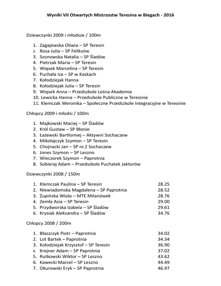 Wyniki VII Otwartych Mistrzostw Teresina w Biegach - 2016 Dziewczynki 2009 i młodsze / 100m 1. Zagajewska Oliwia – SP Teresin 2. Rosa Julia – SP Feliksów 3. Sosnowska Natalia – SP Śladów 4. Pietrzak Maria – SP Teresin 5. Więsek Marcelina – SP Teresin 6. Puchała Iza – SP w Kaskach 7. Kołodziejak Hanna 8. Kołodziejak Julia – SP Teresin 9. Więsek Anna – Przedszkole Leśna Akademia 10. Lewicka Hanna – Przedszkole Publiczne w Teresinie 11. Klemczak Weronika – Społeczne Przedszkole Integracyjne w Teresinie Chłopcy 2009 i młodsi / 100m 1. 2. 3. 4. 5. 6. 7. 8. Majkowski Maciej – SP Śladów Król Gustaw – SP Błonie Łażewski Bartłomiej – Aktywni Sochaczew Mikołajczyk Szymon – SP Teresin Chojnacki Jan – SP nr.2 Sochaczew Jones Szymon – SP Leszno Wieczorek Szymon – Paprotnia Sobieraj Adam – Przedszkole Puchatek Jaktorów Dziewczynki 2008 / 150m 1. 2. 3. 4. 5. 6. Klemczak Paulina – SP Teresin Niewiadomska Magdalena – SP Paprotnia Żupińska Wiola – MTE Milanówek Zemła Asia – SP Teresin Przydworska Izabela – SP Śladów Krysiak Aleksandra – SP Śladów 28.25 28.52 28.76 29.00 29.61 34.76 Chłopcy 2008 / 200m 1. Błaszczyk Piotr – Paprotnia 2. Lot Bartek – Paprotnia 3. Kołodziejak Krzysztof – SP Teresin 4. Krejner Adam – SP Paprotnia 5. Rutkowski Wiktor – SP Leszno 6. Kawecki Marcel – SP Leszno 7. Okurowski Eryk – SP Paprotnia 34.02 34.34 36.90 37.02 43.62 44.49 46.97 Dziewczynki 2007 / 200m 1. 2. 3. 4. 5. 6. 7. 8. 9. Bany Ada – UKS Filipides Teresin / Leszno Korycka Ania – MTE Milanówek Kosińska Lena – SP Śladów Miecznikowska Maja – SP Śladów Panasiuk Julia – SP Paprotnia Kuźmińska Dominika – UKS Filipides Teresin Kamińska Maja – UKS Filipides Teresin Nowakowska Maja – Teresin Jones Hania – SP Leszno 33.00 33.72 34.68 36.40 37.29 37.50 37.75 41.00 42.81 Chłopcy 2007 / 300m 1. 2. 3. 4. Dobrzyński Marcel – SP Śladów Poryszewski Maciej – SP Śladów Mikołajczyk Filip – SP Teresin Ziąbski Wiktor – SP Wiskitki 58.38 59.49 1:10.23 1:18.54 Dziewczynki 2006 – 2005 / 300m 1. Sokół Ola – UKS Filipides Teresin / Leszno 2. Sokół Oliwia – UKS Filipides Teresin / Leszno 3. Burlewicz Tosia – MTE Milanówek 4. Skrzypczuk Weronika – UKS Filipides Teresin 5. Kowalczuk Karolina – SP Paprotnia 6. Kalbarczyk Martyna – SP Teresin 7. Donat Natalia – SP Teresin 8. Kowalska Aleksandra – SP Teresin 9. Chojnacka Maja – SP Teresin 10.Kowalska Izabela – SP Teresin 11.Tempczyk Sylwia – SP Paprotnia 12.Celarek Natalia – SP Śladów 13.Wieczorek Maja – SP Paprotnia 14.Pacholska Martyna – SP Śladów 15.Kruszyńska Katarzyna – SP Paprotnia 51.30 52.34 52.81 54.10 54.54 56.66 57.62 58.93 59.56 1:00.51 1:01.23 1:07.75 1:08.63 1:08.85 1:11.18 Chłopcy 2006 – 2005 / 600m 1. Góralczyk Marcel – SP Paprotnia 2. Sot Wiktor – Promyk Nowa Sucha 3. Odolczyk Mateusz SP 7 Sochaczew 4. Boczkowski Mateusz – SP Paprotnia 5. Wróbel Ignacy – SP Paprotnia 6. Łyczywek Dominik – SP Śladów 1:54.03 1:58.98 2:04.19 2:04.77 2:06.61 2:08.28 7. Bart osiński Wiktor – KS Biegi Grodzisk Maz. 8. Kopiec Bartłomiej – SP Paprotnia 9. Bogucki Krzysztof – SP Paprotnia 10.Tomaszewski Borys – SP Paprotnia 11.Skomlał Mateusz – SP Paprotnia 12.Żak Mirosław – SP Paprotnia 13.Wosiński Mateusz – SP Śladów 14.Makowiecki Bartosz – SP Teresin 15.Białkowski Maciej – SP Teresin 16.Kopka Mateusz – SP Śladów 17.Pol Mariusz – SP Paprotnia 18.Bolesta Karol – SP Teresin 19.Żochowski Michał – SP Paprotnia 2:09.93 2:14.58 2:18.04 2:18.57 2:21.61 2:22.68 2:23.93 2:25.07 2:36.33 2:41.64 2:46.04 2:42.93 2:46.18 Dziewczynki 2004 – 2003 / 600m 1. Wosińska Julia – KM Aktywni Sochaczew 2. Lewandowska Weronika – KM Aktywni Sochaczew 3. Maglakelidze Lilianna – MTE Milanówek 4. Glińska Natalia – UKS Filipides Teresin 5. Kuchta Anna – SP Paprotnia 6. Dudzińska Julia – SP Śladów 7. Odolczyk Maria – Gimnazjum Nr.3 Sochaczew 8. Grzybowska Kinga – SP Paprotnia 9. Dylik Karolina – SP Paprotnia 10.Piasta Julia – SP Paprotnia 1:52.82 1:54.74 2:07.10 2:10.63 2:16.36 2:18.23 2:19.21 2:21.75 2:24.21 2:36.32 Chłopcy 2004 – 2003 / 1000m 1. Szuliński Filip – Gimnazjum Kozłów Biskupi 2. Góralczyk Michał – Gimnazjum Teresin 3. Bany Marek – UKS Filipides / Leszno 4. Pietruszewski Damian – UKS Filipides Teresin 5. Kalbarczyk Maksymilian – SP Teresin 6. Majer Filip – KS Biegi Grodzisk Maz. 7. Mikołajczyk Dominik – SP Teresin 8. Okurowski Patryk – UKS Filipides Teresin 9. Razum Jakub – SP Paprotnia 10.Kuchta Piotr – SP Paprotnia 11.Skrzypczuk Dawid – SP Paprotnia 12.Radziejewski Jakub – SP Teresin 3:12.27 3:32.29 3:32.55 3:59.27 3:59.73 4:08.77 4:09.92 4:10.49 4:24.37 4:26.46 4:26.60 4:29.60 Dziewczęta 2002 – 2001 / 600m 1. Jackiewicz Patrycja – LKS Mazowsze Teresin 2. Lot Natalia – UKS Filipides Teresin 3. Iracka Weronika – Gimnazjum Szymanów 1:48.15 1:50.89 1:58.45 4. Bany Daria – UKS Filipides / Leszno 5. Ciesielska Magda – LKS Mazowsze Teresin 6. Grzegorek Agata – UKS Filipides Teresin 1:58.60 2:07.69 2:25.71 Chłopcy 2002 – 2001 / 1000m 1. Bartosz Świerczewski – UKS Filipides Teresin 2. Krejner Mateusz – UKS Filipides Teresin 3:15.07 3:37.80 Kobiety 2000 – 1997 / 1500m 1. Wiśniewska Ola – UKS Filipides Teresin 6:12.33 Mężczyźni 2000 – 1997 / 1500m 1. Skorupa Kamil – UKS Filipides Teresin 2. Sadowski Mateusz – UKS Filipides Teresin 3. Nosarzewski Daniel – KM Aktywni Sochaczew 4:45.48 4:48.42 4:50.72 Kobiety 1996 i starsze 1. Bajurska Dorota – Teresin 2. Białkowska Sylwia – Kaski 6:53.12 7:36.31 Mężczyźni 1996 i starsi 1. 2. 3. 4. Mikulski Tomasz – KM Aktywni Sochaczew Ząbczyński Adam – Sochaczew Pawłowski Andrzej – UKS Filipides Teresin Aksamit Jakub – KM Aktywni Sochaczew UKS Filipides Teresin 2016 Slandi - elektroniczny pomiar czasu 4:27.03 4:41.83 5:41.05 5:52.47