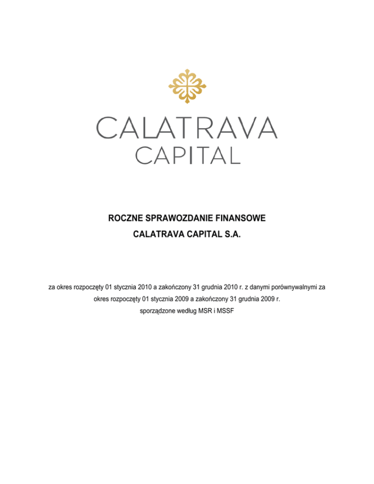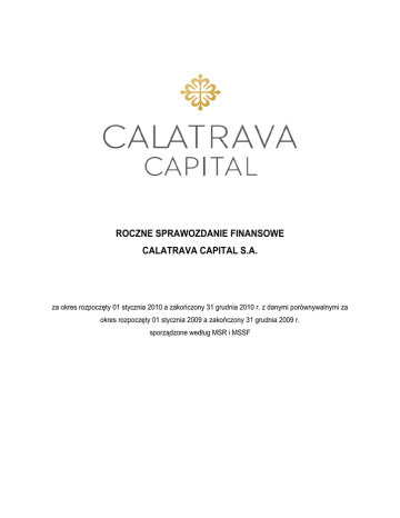 ROCZNE SPRAWOZDANIE FINANSOWE CALATRAVA CAPITAL S.A. za okres rozpoczęty 01 stycznia 2010 a zakończony 31 grudnia 2010 r. z danymi porównywalnymi za okres rozpoczęty 01 stycznia 2009 a zakończony 31 grudnia 2009 r. sporządzone według MSR i MSSF ROCZNE SPRAWOZDANIE FINANSOWE CALATRAVA CAPITAL S.A. za 2010 r. WYBRANE DANE FINANSOWE SPÓŁKI CALATRAVA CAPITAL S.A. NA 31.12.2010 ............................ 3 LIST PREZESA DO AKCJONARIUSZY CALATRAVA CAPITAL S.A. ..................................................... 4 OPINIA NIEZALEŻNEGO BIEGŁEGO REWIDENTA ............................................................................ 6 A.INFORMACJE OGÓLNE ............................................................................................................................... 9 B. ANALIZA WYNIKU FINANSOWEGO ORAZ SYTUACJI MAJĄTKOWEJ I FINANSOWEJ SPÓŁKI ... 15 OŚWIADCZENIE ZARZĄDU ............................................................................................................26 ROCZNE SPRAWOZDANIE Z SYTUACJI FINANSOWEJ CALATRAVA CAPITAL S.A. NA 31.12.2010 ....27 SPRAWOZDANIE Z CAŁKOWITYCH DOCHODÓW CALATRAVA CAPITAL ZA OKRES 01.01.2010-31.12.2010 .....................................................................................................................................................29 INFORMACJA DODATKOWA DO ROCZNEGO SPRAWOZDANIA FINANSOWEGO CALATRAVA CAPITAL S.A. ZA ROK 2010 .................................................................................................................................33 I. WPROWADZENIE ...................................................................................................................................... 33 II. OŚWIADCZENIE O ZGODNOŚCI Z MSSF...................................................................................................... 34 III. STOSOWANE NADRZĘDNE ZASADY RACHUNKOWOŚCI ................................................................................. 34 IV. ISTOTNE ZASADY RACHUNKOWOŚCI .......................................................................................................... 35 V. NOTY OBJAŚNIAJĄCE DO ROCZNEGO SPRAWOZDANIA Z SYTUACJI FINANSOWEJ CALATRAVA CAPITAL S.A. ................................................................................................................................................. 41 1. WARTOŚCI NIEMATERIALNE I PRAWNE ..................................................................................................... 41 2. NIERUCHOMOŚCI INWESTYCYJNE ............................................................................................................ 44 3. RZECZOWE AKTYWA TRWAŁE ................................................................................................................... 45 4. DŁUGOTERMINOWE AKTYWA FINANSOWE ............................................................................................... 48 5. AKTYWA Z TYTUŁU ODROCZONEGO PODATKU DOCHODOWEGO ............................................................ 51 6. NALEśNOŚCI DŁUGOTERMINOWE ............................................................................................................. 52 7. ZAPASY...................................................................................................................................................... 52 8. NALEśNOŚCI KRÓTKOTERMINOWE ........................................................................................................... 53 9. ŚRODKI PIENIĘśNE I ICH EKWIWALENTY................................................................................................... 55 10. INNE INWESTYCJE KRÓTKOTERMINOWE ................................................................................................ 55 11. AKTYWA DŁUGOTERMINOWE SKLASYFIKOWANE JAKO DOSTĘPNE DO SPRZEDAśY ............................. 57 12. CZYNNE ROZLICZENIA MIĘDZYOKRESOWE ............................................................................................ 57 13. KAPITAŁ PODSTAWOWY .......................................................................................................................... 58 14. KAPITAŁ Z AKTUALIZACJI WYCENY.......................................................................................................... 61 15. ZOBOWIĄZANIA DŁUGOTERMINOWE ....................................................................................................... 61 16. DŁUGOTERMINOWA REZERWA NA ŚWIADCZENIA EMERYTALNE ............................................................ 64 17. REZERWA Z TYTUŁU ODROCZONEGO PODATKU DOCHODOWEGO ........................................................ 64 18. ZOBOWIĄZANIA KRÓTKOTERMINOWE ..................................................................................................... 65 19. ZOBOWIĄZANIA POZABILANSOWE........................................................................................................... 67 20. POZOSTAŁE REZERWY KRÓTKOTERMINOWE ......................................................................................... 69 21. WARTOŚĆ KSIĘGOWA AKCJI ................................................................................................................... 69 VI. NOTY OBJAŚNIAJĄCE DO ROCZNEGO SPRAWOZDANIA Z CAŁKOWITYCH DOCHODÓW ........ 70 22. PRZYCHODY ZE SPRZEDAśY................................................................................................................... 70 23. KOSZTY WEDŁUG RODZAJU .................................................................................................................... 70 24. POZOSTAŁE PRZYCHODY I KOSZTY OPERACYJNE ................................................................................. 71 25. ZYSK/(STRATA) Z INWESTYCJI ................................................................................................................. 71 26. PRZYCHODY I KOSZTY FINANSOWE .............................................