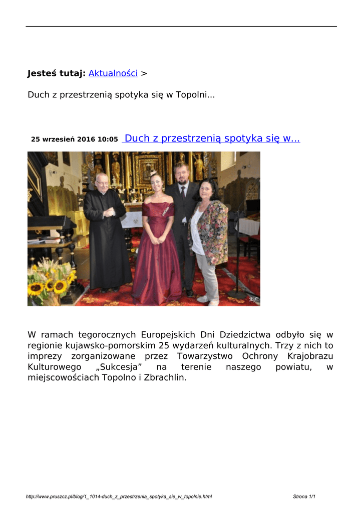 Jesteś tutaj: Aktualności > Duch z przestrzenią spotyka się w Topolni... 25 wrzesień 2016 10:05 Duch z przestrzenią spotyka się w... W ramach tegorocznych Europejskich Dni Dziedzictwa odbyło się w regionie kujawsko-pomorskim 25 wydarzeń kulturalnych. Trzy z nich to imprezy zorganizowane przez Towarzystwo Ochrony Krajobrazu Kulturowego „Sukcesja” na terenie naszego powiatu, w miejscowościach Topolno i Zbrachlin. http://www.pruszcz.pl/blog/1_1014-duch_z_przestrzenia_spotyka_sie_w_topolnie.html Powered by TCPDF (www.tcpdf.org) Strona 1/1