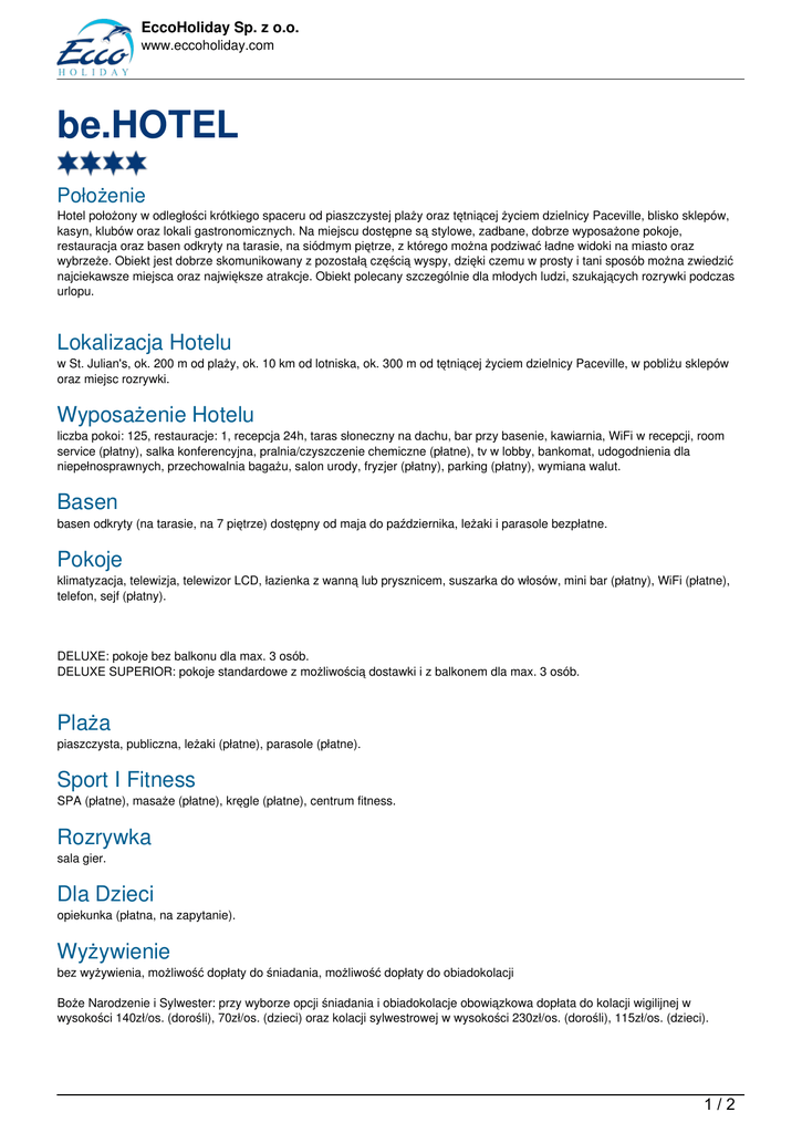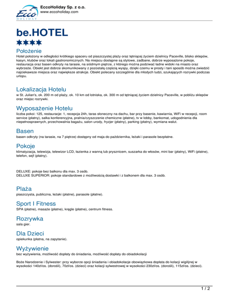 EccoHoliday Sp. z o.o. www.eccoholiday.com be.HOTEL Położenie Hotel położony w odległości krótkiego spaceru od piaszczystej plaży oraz tętniącej życiem dzielnicy Paceville, blisko sklepów, kasyn, klubów oraz lokali gastronomicznych. Na miejscu dostępne są stylowe, zadbane, dobrze wyposażone pokoje, restauracja oraz basen odkryty na tarasie, na siódmym piętrze, z którego można podziwać ładne widoki na miasto oraz wybrzeże. Obiekt jest dobrze skomunikowany z pozostałą częścią wyspy, dzięki czemu w prosty i tani sposób można zwiedzić najciekawsze miejsca oraz największe atrakcje. Obiekt polecany szczególnie dla młodych ludzi, szukających rozrywki podczas urlopu. Lokalizacja Hotelu w St. Julian's, ok. 200 m od plaży, ok. 10 km od lotniska, ok. 300 m od tętniącej życiem dzielnicy Paceville, w pobliżu sklepów oraz miejsc rozrywki. Wyposażenie Hotelu liczba pokoi: 125, restauracje: 1, recepcja 24h, taras słoneczny na dachu, bar przy basenie, kawiarnia, WiFi w recepcji, room service (płatny), salka konferencyjna, pralnia/czyszczenie chemiczne (płatne), tv w lobby, bankomat, udogodnienia dla niepełnosprawnych, przechowalnia bagażu, salon urody, fryzjer (płatny), parking (płatny), wymiana walut. Basen basen odkryty (na tarasie, na 7 piętrze) dostępny od maja do października, leżaki i parasole bezpłatne. Pokoje klimatyzacja, telewizja, telewizor LCD, łazienka z wanną lub prysznicem, suszarka do włosów, mini bar (płatny), WiFi (płatne), telefon, sejf (płatny). DELUXE: pokoje bez balkonu dla max. 3 osób. DELUXE SUPERIOR: pokoje standardowe z możliwością dostawki i z balkonem dla max. 3 osób. Plaża piaszczysta, publiczna, leżaki (płatne), parasole (płatne). Sport I Fitness SPA (płatne), masaże (płatne), kręgle (płatne), centrum fitness. Rozrywka sala gier. Dla Dzieci opiekunka (płatna, na zapytanie). Wyżywienie bez wyżywienia, możliwość dopłaty do śniadania, możliwość dopłaty do obiadokolacji Boże Narodzenie i Sylwester: przy wyborze opcji śniadania i obiadokolacje obowiązkowa dopłata do kolacji wigilijnej w wysokości 140zł/os. (dorośli), 70zł/os. (dzieci) oraz kolacji sylwestrowej w wysokości 230zł/os. (dorośli), 115zł/os. (dzieci). 1/2 EccoHoliday Sp. z o.o. www.eccoholiday.com Informacje Dodatkowe W hotelu pobierana jest kaucja zwrotna w wysokości 100 EUR za pobyt. Od tej kwoty będzie odliczany ewentualny koszt użytku internetu ok. 9.50 EUR za dzień lub ok. 29.50 EUR za tydzień oraz minibar w pokoju, jeśli Goście poproszą o jakieś napoje/przekąski. Oferta: Wylot 01.01.1970 Powrót 01.01.1970 godz. godz. Zakwaterowanie -() Dni dni Cena os. dorosła 2/2 Powered by TCPDF (www.tcpdf.org)