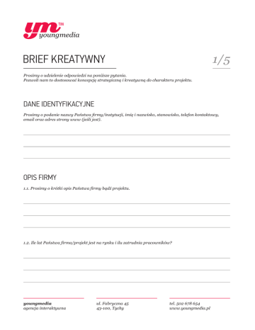 1/5 BRIEF KREATYWNY Prosimy o udzielenie odpowiedzi na poniższe pytania. Pozwoli nam to dostosować koncepcję strategiczną i kreatywną do charakteru projektu. DANE IDENTYFIKACYJNE Prosimy o podanie nazwy Państwa firmy/instytucji, imię i nazwisko, stanowisko, telefon kontaktowy, email oraz adres strony www (jeśli jest). OPIS FIRMY 1.1. Prosimy o krótki opis Państwa firmy bądź projektu. 1.2. Ile lat Państwa firma/projekt jest na rynku i ilu zatrudnia pracowników? youngmedia agencja interaktywna ul. Fabryczna 45 43-100, Tychy tel. 502 678 654 www.youngmedia.pl 2/5 BRIEF KREATYWNY 1.3. Kim są Państwa klienci (dotychczasowi lub potencjalni) oraz jaka jest grupa docelowa? 1.4. Prosimy o opisanie największej konkurencji dla Państwa firmy/projektu oraz o napisanie co chcieliby Państwo ulepszyć w stosunku do wizerunku konkurencji. (prosimy także o adresy www konkurencji) 1.5. Jaki wizerunek firmy chcieliby Państwo stworzyć, jak chcieliby Państwo aby firma była postrzegana? youngmedia agencja interaktywna ul. Fabryczna 45 43-100, Tychy tel. 502 678 654 www.youngmedia.pl 3/5 BRIEF KREATYWNY ZAŁOŻENIA DOTYCZĄCE PROJEKTU 2.1. Co jest przedmiotem zlecenia? (Strona www kompletna czy sam layout, logotyp, corporate identity, film, branding, wizualizacja produktu etc.) 2.2. Jeżeli przedmiotem zlecenia jest layout strony www, kompletna strona www prosimy skrótowo opisać funkcjonalność serwisu. 2.3. Prosimy skrótowo opisać co ma być motywem przewodnim projektu? (prostota nawigacji, przejrzystość, schludność, atrakcyjna grafika etc.) youngmedia agencja interaktywna ul. Fabryczna 45 43-100, Tychy tel. 502 678 654 www.youngmedia.pl 4/5 BRIEF KREATYWNY 2.4. Co chcą Państwo osiągnąć poprzez przygotowany projekt? (Zbudowanie świadomości marki/odświeżenie wizerunku, promocja produktu, prezentacja) 2.5. Czy posiadają Państwo kompletną księgę znaku lub brandbook? Jeśli nie, prosimy opisać kolorystykę i typografię, których można użyć. 2.6. Prosimy o zaznaczenie rodzaju strony www, którą mamy wykonać. Serwis firmowy, korporacyjny Aplikacja webowa Sklep internetowy Serwis społeczniościowy Blog Inna 2.7. Prosimy skrótowo opisać mapę strony (ilość zakładek, jakie to zakładki, ilość podstron). youngmedia agencja interaktywna ul. Fabryczna 45 43-100, Tychy tel. 502 678 654 www.youngmedia.pl 5/5 BRIEF KREATYWNY 2.8. Czy na stronie mają znaleźć się elementy flash? Jeśli tak to jakie? 2.9. Czy do strony www zostaną dostarczone wszelkie materiały? (zdjęcia, teksty, mockupy, inne) Jeśli tak to jakie? 2.10. Prosimy o podanie adresów do strony, które się Państwu podobają lub oddają charakter Państwa wyobrażeń o projekcie. 2.11. Prosimy o podanie budżetu oraz oczekiwanego terminu realizacji. youngmedia agencja interaktywna ul. Fabryczna 45 43-100, Tychy tel. 502 678 654 www.youngmedia.pl
