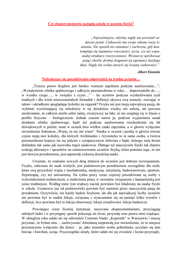 Czy eksperymentaria zastąpią szkołę w uczeniu fizyki? „Najważniejsze, abyśmy nigdy nie przestali zadawać pytań. Ciekawość ma swoje własne racje istnienia. Nie sposób nie oniemieć z zachwytu, gdy kontempluje się tajemnice wieczności, życia, czy też wspaniałej struktury rzeczywistości. Wystarczy spróbować pojąć choćby drobny fragment tej tajemnicy każdego dnia. Nigdy nie wolno utracić tej świętej ciekawości.” Albert Einstein Niekończące się poszukiwania odpowiedzi na trudne pytania… „Trzecie prawo Keplera jest bardzo ważnym aspektem podczas analizowania…”, „Wynalezienie silnika spalinowego i odkrycie piorunochronu w roku…. doprowadziło do…., w wyniku czego…., w związku z czym…” – ilu uczniów podczas wysłuchiwania tych trudnych i dla wielu niezrozumiałych formułek i definicji ukrywa swą senność, ziewając w rękaw i ukradkiem spoglądając koledze na zegarek? Fizyka nie jest moją największą pasją, do wybitnie wyróżniającej się młodzieży w tej dziedzinie wiedzy nie należę, ale powiem nieskromnie, że całkiem nieźle sobie radzę, zważywszy na fakt, że nie znajduję się w klasie o profilu fizyczno – biologicznym. Jednak czasem nawet ja, podczas wyjaśniania zasad działania silnika spalinowego, bądź też podczas analizowania rozchodzenia się fal dźwiękowych w próżni, mam w oczach dwa wielkie znaki zapytania, a w głowie wyłącznie stwierdzenie Sokratesa „Wiem, że nic nie wiem”. Panikę w oczach i pustkę w głowie równie często mają moi koledzy, dla których Archimedes i Arystoteles to ta sama osoba, a twórca piorunochronu kojarzy im się jedynie z sympatycznym żółwiem z bajki, którego imię brzmi dokładnie tak samo jak nazwisko tegoż naukowca. Dlatego też nauczyciele fizyki tak chętnie szukają alternatyw i sposobów na zainteresowanie uczniów fizyką, która pomimo tego, że nie jest łatwym przedmiotem, jest naprawdę ciekawą dziedziną nauki. Uważam, że szukanie nowych dróg dotarcia do uczniów jest dobrym rozwiązaniem. Fizyka, zaliczana do nauk ścisłych, jest podstawowym przedmiotem szczególnie dla osób, które swą przyszłość wiążą z mechatroniką, medycyną, inżynierią, budownictwem, sportem, fizjoterapią, czy też astronomią. Na rynku pracy coraz częściej poszukiwane są osoby z wykształceniem technicznym, a znalezienie pracy w zawodzie związanym z humanistyką jest coraz trudniejsze. Według mnie tym większy nacisk powinien być kładziony na naukę fizyki w szkole. Uczniowie już od podstawówki powinni być zarażeni przez nauczyciela pasją do przedmiotu. Oczywiście, nie każdy będzie fizykiem, ale dla jak największej liczby uczniów nie powinna być to nudna lekcja, związaną z wyuczeniem się na pamięć kilku wzorów i definicji, lecz powinna być to lekcja obserwacji, lekcja cierpliwości, lekcja badawcza. Powstające coraz liczniej instytucje, nazywane eksperymentariami, przyciągają młodych ludzi i w przystępny sposób pokazują im świat, przyrodę oraz prawa nimi rządzące. W ubiegłym roku udało mi się odwiedzić Centrum Nauki „Kopernik” w Warszawie i muszę przyznać, że byłam nim… zachwycona! Absolutną nieprawdą jest stwierdzenie, że to miejsce przeznaczone wyłącznie dla dzieci – ja, jako niemalże osoba pełnoletnia, uczyłam się tam bawiąc i bawiłam, ucząc. Poszczególne działy, które udało mi się zwiedzić i liczne przyrządy, z którymi mogłam poeksperymentować, były dla mnie szansą na zgłębienie wiedzy fizycznej i na praktyczne doświadczenie tego, o czym dotychczas tylko słyszałam. Lustro weneckie, latający dywan, łoże fakira, trzęsienie ziemi, camera obscura, możliwość przeprowadzenia operacji laparoskopowej, zamknięcia się w bańce mydlanej i zaobserwowania, jak krew płynie w ciele człowieka, były niesamowitymi doświadczeniami i niezwykłą przygodą. A to wszystko objaśniane przez pracujące tam osoby w możliwie najprostszy sposób, ponieważ część działów tematycznych była wspólna dla dzieci i młodzieży. Tłumy zastane w Centrum Nauki „Kopernik” wcale mnie nie zdziwiły. Liczne wycieczki szkolne, rodziny z dziećmi, wreszcie osoby, która same zapragnęły zagłębić się w świat tajemniczych praw fizyki. Czy to jednak oznacza, że eksperymentaria są jedyną szansą na zainteresowanie młodych ludzi tym przedmiotem? Czy tradycyjne i konwencjonalne metody nauczania mają stać się przeżytkiem? Uważam, że kluczem do sukcesu jest zainteresowanie fizyką dzieci. To one są najbardziej ciekawe i żądne wiedzy. „Dlaczego…?”, „Po co…?”, „Jak…?”, „Kiedy…?” – to ulubione pytania dzieci, niejednokrotnie doprowadzające rodziców do poirytowania. Bo jak po ciężkim dniu w pracy wytłumaczyć maluchowi, czym są gwiazdozbiory i dlaczego niektóre ciała niebieskie widać gołym okiem, a inne nie? Według mnie eksperymentaria powinny być urozmaiceniem tradycyjnych lekcji, na których jednak nauczyciele nie skupialiby się tylko na wpajaniu uczniom wiadomości teoretycznych, ale także pokazywali im to, o czym opowiadają, w praktyce. Ciekawym pomysłem byłyby obserwacje gwiazd podczas wyjazdów terenowych i wycieczek albo prowadzenie kilkunastu godzin zajęć w terenie np. podczas objaśniania, czym jest ciśnienie i dlaczego podczas jego obliczania należy znać siłę nacisku danego ciała i jego pole powierzchni. Z własnego doświadczenia, które posiadam jako starsza siostra i wolontariuszka pracująca w świetlicy terapeutycznej wiem, że dzieci są bardzo ciekawe świata, a na każde ich pytanie, powinna zostać udzielona odpowiedź. Wiem, jaką radością są dla nich wyjazdy i możliwość poznania czegoś nowego, dlatego właśnie chciałabym, aby mój młodszy brat mógł odwiedzić Centrum Nauki „Kopernik”. Ponadto planujemy pojechać razem do niedawno otwartego Centrum Nowoczesności Młyn Wiedzy w Toruniu. Myślę, ż