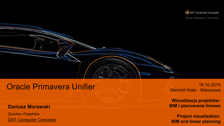 Oracle Primavera Unifier Dariusz Morawski Dyrektor Projektów DAT Computer Concepts 16.10.2015 Marriott Hotel - Warszawa Wizualizacja projektów: BIM i planowanie liniowe Project visualization: BIM and linear planning Oracle Primavera Unifier Narzędzie do efektywnej komunikacji Środowisko projektowe Konfigurowane procesy biznesowe Arkusz kosztów projektu Przepływ danych Panele informacyjne Korzyści z zastosowania Unifier Oracle Primavera Unifier Wspólna platforma dla: Firmy EPC Kontrakty, Zapytania ofertowe Zarządzanie zmianą Inwestorzy Dostawcy • informowanie, monitorowanie, zarządzanie zdarzeniami biznesowymi Primavera Unifier Klient 1 Środowisko projektowe Klient 2 Unifier wspomaga: Klient 3 Zarządzanie kontraktami zawartymi z klientami i dostawcami, w tym: Zarządzanie zmianą, Prognozowanie i analizę Cash Flow na poziomie projektu oraz firmy, Przetargi na dostawy materiałów i usług, Zbiorcze zamówienia dla wielu projektów, Rozliczanie dostaw i wykonanych prac, Planowanie wieloletnie kosztów i przychodów, Wielowalutowość na poziomie transakcji i projektu. Firma X Zamówienia zbiorcze Podwykonawca A Podwykonawca B Podwykonawca C Podwykonawca A Prj.1 Prj.2 Podwykonawca C Prj.3 Podwykonawca D Primavera Unifier Procesy biznesowe a cykl życia projektu Monitorowanie i Kontrola Rozpoczęcie Fund Approp. Procesy wspólne Project Request Vendors Clients Bid Items BPO‘s Planowanie Realizacja Zakończenie „Phase Gates“ regulują dostęp do procesów biznesowych, właściwych dla danej fazy projektu . Zakładanie projektu Szacowanie kosztów Estimates Budżetowanie Budget Approval Budget Change Budget Transfer Projektowanie Design Reviews Transmittals, Submittals, Design Change Request Analiza ryzyka Risks & Issues Przetargi RFB Umowy Contracts Purchase Orders Work Releases Wykonanie robót budowlanych, zarzadzanie zmianą RFI‘s Design Change Req. CRX Change Orders PO Amendments Odbiór prac, zakończenie projektu Punchlist Project Closeout, Lessons Learned Obsługa płatności Pay Apps. Invoices SOV Obsługa budowy Transmittals, Submittals, Meeting Minutes Action Items Company Level BP Proj. / Shell Level BP Primavera Unifier Podstawa rozwiązania nr 1. vera Unifier Gotowy - model podstawa referencyjny procesów rozwiązania biznesowych nr 1. imavera Unifier - podstawa rozwiązania nr 1. Primavera Unifier Podstawa rozwiązania nr 2. Mechanizm konfigurowania procesów biznesowych Change Request + Create Approve Acknowledge End Primavera Unifier Menu główne systemu Primavera Unifier Arkusz kosztów projektu • Szacunki kosztów • Budżet wstępny • Niezatwierdzone zmiany budżetu • Zatwierdzone zmiany budżetu • Budżet zatwierdzony • Ryzyka projektowe • Zamówienia zakupu • Niezatwierdzone zmiany dla zamówień • Zatwierdzone zmiany dla zamówień zakupu • Dane wykonane • … Primavera Unifier Analliza kosztów w czasie rzeczywistym Aktualizacja Arkusza Kosztów Aktualizacja Arkusza Kosztów Payment Application Workflow Przepływ danych Aktualizacja Arkusza Kosztów Change Order Workflow Purchase Order Workflow Contractor Payment Application Contractor Change Order Request Purchase Order Primavera Unifier Cash flow Primavera Unifier Panele informacyjne Primavera Unifier Korzyści z zastosowania systemu Pełna kontrola kosztów i przychodów jednocześnie w wielu projektach, Prognozowanie cash flow na bazie danych planowanych i rzeczywistych, Poprawa efektywności zarządzania kluczowymi procesami biznesowymi, w tym zarządzania zmianą, ofertowaniem, zamówieniami, dostawami, Pełny wgląd we wszystkie transakcje biznesowe, Ujednolicenie procedur w biurze i na budowie, Oszczędność czasu i kosztów administrowania danymi i raportowania, Dziękuję za uwagę. Thank you for your attention. Dariusz Morawski DAT Computer Concepts [email protected] www.datcc.pl