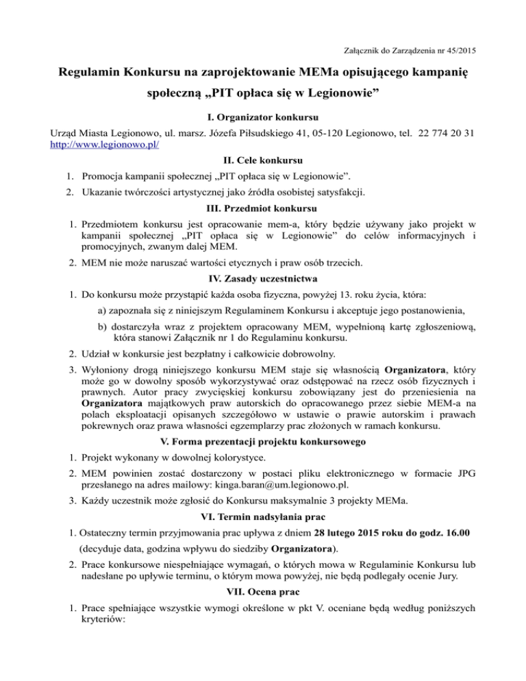Załącznik do Zarządzenia nr 45/2015 Regulamin Konkursu na zaprojektowanie MEMa opisującego kampanię społeczną „PIT opłaca się w Legionowie” I. Organizator konkursu Urząd Miasta Legionowo, ul. marsz. Józefa Piłsudskiego 41, 05-120 Legionowo, tel. 22 774 20 31 http://www.legionowo.pl/ II. Cele konkursu 1. Promocja kampanii społecznej „PIT opłaca się w Legionowie”. 2. Ukazanie twórczości artystycznej jako źródła osobistej satysfakcji. III. Przedmiot konkursu 1. Przedmiotem konkursu jest opracowanie mem-a, który będzie używany jako projekt w kampanii społecznej „PIT opłaca się w Legionowie” do celów informacyjnych i promocyjnych, zwanym dalej MEM. 2. MEM nie może naruszać wartości etycznych i praw osób trzecich. IV. Zasady uczestnictwa 1. Do konkursu może przystąpić każda osoba fizyczna, powyżej 13. roku życia, która: a) zapoznała się z niniejszym Regulaminem Konkursu i akceptuje jego postanowienia, b) dostarczyła wraz z projektem opracowany MEM, wypełnioną kartę zgłoszeniową, która stanowi Załącznik nr 1 do Regulaminu konkursu. 2. Udział w konkursie jest bezpłatny i całkowicie dobrowolny. 3. Wyłoniony drogą niniejszego konkursu MEM staje się własnością Organizatora, który może go w dowolny sposób wykorzystywać oraz odstępować na rzecz osób fizycznych i prawnych. Autor pracy zwycięskiej konkursu zobowiązany jest do przeniesienia na Organizatora majątkowych praw autorskich do opracowanego przez siebie MEM-a na polach eksploatacji opisanych szczegółowo w ustawie o prawie autorskim i prawach pokrewnych oraz prawa własności egzemplarzy prac złożonych w ramach konkursu. V. Forma prezentacji projektu konkursowego 1. Projekt wykonany w dowolnej kolorystyce. 2. MEM powinien zostać dostarczony w postaci pliku elektronicznego w formacie JPG przesłanego na adres mailowy: [email protected]. 3. Każdy uczestnik może zgłosić do Konkursu maksymalnie 3 projekty MEMa. VI. Termin nadsyłania prac 1. Ostateczny termin przyjmowania prac upływa z dniem 28 lutego 2015 roku do godz. 16.00 (decyduje data, godzina wpływu do siedziby Organizatora). 2. Prace konkursowe niespełniające wymagań, o których mowa w Regulaminie Konkursu lub nadesłane po upływie terminu, o którym mowa powyżej, nie będą podlegały ocenie Jury. VII. Ocena prac 1. Prace spełniające wszystkie wymogi określone w pkt V. oceniane będą według poniższych kryteriów: a) oryginalność (0 - 5 pkt), b) zgodność z tematyką (0 - 5 pkt), c) czytelność (0 - 5 pkt), Oceniana praca może uzyskać maksymalnie 15 pkt. 2. Oceny prac dokona powołana przez Prezydenta Miasta Legionowo Komisja Konkursowa składająca się z 3 pracowników Urzędu Miasta Legionowo oraz z przedstawiciela Miejskiego Ośrodka Kultury. 3. Komisja Konkursowa dokona wyboru najlepszej pracy. Decyzja Komisji jest ostateczna i nie przysługuje od niej odwołanie. VIII Ogłoszenie wyników 1. Ogłoszenie wyników nastąpi do 2 marca 2015 roku. 2. Informacja o zwycięskim projekcie znajdzie się na stronie www.legionowo.pl. 3. Autor zwycięskiego MEMa otrzyma nagrodę w postaci Smarthphona. 4. Organizator konkursu zastrzega sobie prawo do opublikowania imienia, nazwiska i informacji o laureacie konkursu, a także projektów konkursowych oraz umieszczenia tych informacji w materiałach reklamowych Organizatora oraz w mediach i internecie. IX. Postanowienia końcowe 1. Organizator konkursu zastrzega sobie prawo do wprowadzania zmian w regulaminie oraz przerwania lub odwołania konkursu na każdym etapie bez podania przyczyny. 2. Wszelkie kwestie sporne rozstrzygać będzie Organizator konkursu. 3. Wszelkie kwestie i pytania związane z organizacją konkursu należy kierować na adres: Urząd Miasta Legionowo, ul. Piłsudskiego 41, 05-120 Legionowo, Referat Marketingu, e-mail: [email protected] Załącznik nr 1 do Regulaminu Konkursu KARTA ZGŁOSZENIOWA KONKURS NA ZAPROJEKTOWANIE MEMA OPISUJĄCEGO KAMPANIĘ PROMOCJĄ „PIT OPŁACA SIĘ W LEGIONOWIE” 1. Dane uczestnika konkursu Imię i nazwisko autora: …………………………………………………………………………... Data urodzenia: …………………………………………………………………………………… 2. Adres do korespondencji i dane kontaktowe Miejscowość: …………………………………….. Ulica: ………………………………………. Nr domu: ……………………………….. Kod pocztowy: ………………………………………. Nr telefonu: …………………………… Adres e-mail: ………………………………………….. Nr konta bankowego ……………………………………………………………………………… 3. Oświadczenia a) Oświadczam, że znam i akceptuję postanowienia Regulaminu Konkursu na zaprojektowanie MEMa opisującego kampanię promocją „PIT opłaca się w Legionowie” b) Oświadczam, że projekt nie narusza praw osób trzecich, w szczególności nie narusza ich majątkowych i osobistych praw autorskich. W przypadku wystąpienia przez osobę trzecią z roszczeniami wynikającymi z tytułu naruszenia praw określonych powyżej osoba przekazująca zrekompensuje Organizatorowi, jako wyłącznie odpowiedzialna, koszty poniesione w związku ze skierowaniem przeciwko niemu roszczeń odszkodowawczych, zwalniając Organizatora od wszelkich zobowiązań, jakie powstaną z tego tytułu, c) Wyrażam zgodę na przetwarzanie moich danych osobowych zgodnie z ustawą z dnia 29 sierpnia 1997 r. o ochronie danych osobowych (Dz.U. z 2002 r., Nr 101, poz. 926 z późn. zm.) przez Organizatora konkursu dla celów związanych z przeprowadzeniem i rozstrzygnięciem konkursu, o którym mowa w pkt. a, w tym na ich opublikowanie w środkach masowego przekazu. …………………………………….. /miejscowość i data/ …………………………………… /podpis autora projektu/