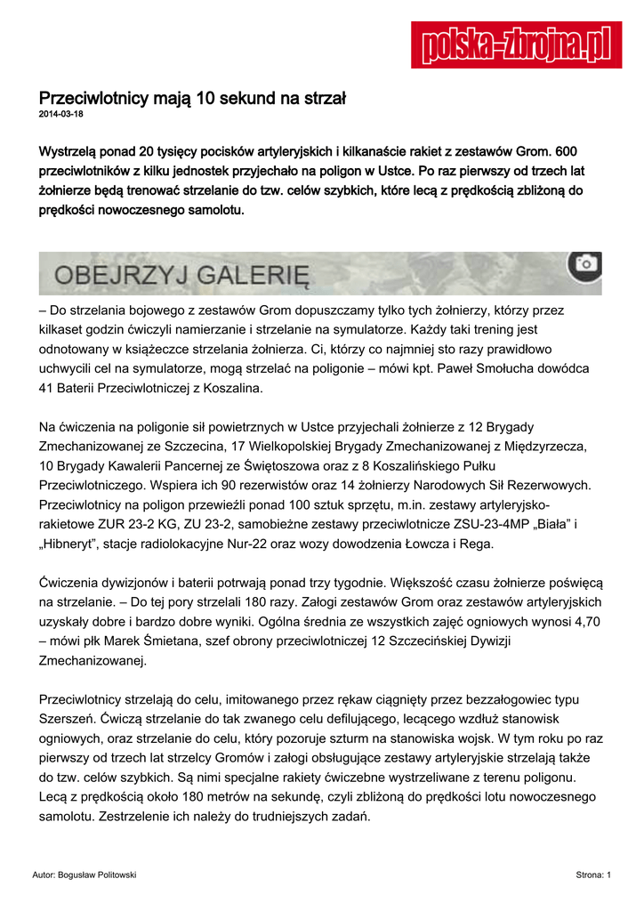 Przeciwlotnicy mają 10 sekund na strzał 2014-03-18 Wystrzelą ponad 20 tysięcy pocisków artyleryjskich i kilkanaście rakiet z zestawów Grom. 600 przeciwlotników z kilku jednostek przyjechało na poligon w Ustce. Po raz pierwszy od trzech lat żołnierze będą trenować strzelanie do tzw. celów szybkich, które lecą z prędkością zbliżoną do prędkości nowoczesnego samolotu. – Do strzelania bojowego z zestawów Grom dopuszczamy tylko tych żołnierzy, którzy przez kilkaset godzin ćwiczyli namierzanie i strzelanie na symulatorze. Każdy taki trening jest odnotowany w książeczce strzelania żołnierza. Ci, którzy co najmniej sto razy prawidłowo uchwycili cel na symulatorze, mogą strzelać na poligonie – mówi kpt. Paweł Smołucha dowódca 41 Baterii Przeciwlotniczej z Koszalina. Na ćwiczenia na poligonie sił powietrznych w Ustce przyjechali żołnierze z 12 Brygady Zmechanizowanej ze Szczecina, 17 Wielkopolskiej Brygady Zmechanizowanej z Międzyrzecza, 10 Brygady Kawalerii Pancernej ze Świętoszowa oraz z 8 Koszalińskiego Pułku Przeciwlotniczego. Wspiera ich 90 rezerwistów oraz 14 żołnierzy Narodowych Sił Rezerwowych. Przeciwlotnicy na poligon przewieźli ponad 100 sztuk sprzętu, m.in. zestawy artyleryjskorakietowe ZUR 23-2 KG, ZU 23-2, samobieżne zestawy przeciwlotnicze ZSU-23-4MP „Biała” i „Hibneryt”, stacje radiolokacyjne Nur-22 oraz wozy dowodzenia Łowcza i Rega. Ćwiczenia dywizjonów i baterii potrwają ponad trzy tygodnie. Większość czasu żołnierze poświęcą na strzelanie. – Do tej pory strzelali 180 razy. Załogi zestawów Grom oraz zestawów artyleryjskich uzyskały dobre i bardzo dobre wyniki. Ogólna średnia ze wszystkich zajęć ogniowych wynosi 4,70 – mówi płk Marek Śmietana, szef obrony przeciwlotniczej 12 Szczecińskiej Dywizji Zmechanizowanej. Przeciwlotnicy strzelają do celu, imitowanego przez rękaw ciągnięty przez bezzałogowiec typu Szerszeń. Ćwiczą strzelanie do tak zwanego celu defilującego, lecącego wzdłuż stanowisk ogniowych, oraz strzelanie do celu, który pozoruje szturm na stanowiska wojsk. W tym roku po raz pierwszy od trzech lat strzelcy Gromów i załogi obsługujące zestawy artyleryjskie strzelają także do tzw. celów szybkich. Są nimi specjalne rakiety ćwiczebne wystrzeliwane z terenu poligonu. Lecą z prędkością około 180 metrów na sekundę, czyli zbliżoną do prędkości lotu nowoczesnego samolotu. Zestrzelenie ich należy do trudniejszych zadań. Autor: Bogusław Politowski Strona: 1 Dostała je do wykonania szer. Justyna Pewińska z 41 Baterii Przeciwlotniczej z Koszalina, która służy w drużynie niemal w całości składającej się z kobiet. Szeregowa zniszczyła cel za pomocą przeciwlotniczego zestawu Grom. Na namierzenie i oddanie strzału miała zaledwie 10 sekund. Ale zadanie wykonała bezbłędnie – wart blisko pół miliona złotych pocisk rakietowy trafił w lecący obiekt. Część zajęć przeciwlotnicy poświęcą na taktykę wojskową. Rozpoznają drogi marszu, będą zmieniać miejsca stacjonowania, ćwiczyć szybkie zajmowanie rejonów obrony czy stanowisk ogniowych. Szkolenie pododdziałów przeciwlotniczych w Ustce zakończy się 28 marca. Autor: Bogusław Politowski Strona: 2