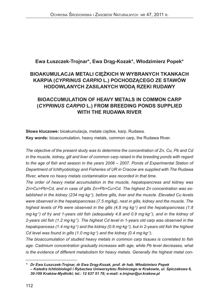 Ochrona Środowiska i Zasobów Naturalnych nr 47, 2011 r. Ewa Łuszczek-Trojnar*, Ewa Drąg-Kozak*, Włodzimierz Popek* BIOAKUMULACJA METALI CIĘŻKICH W WYBRANYCH TKANKACH KARPIA (CYPRINUS CARPIO L.) POCHODZĄCEGO ZE STAWÓW HODOWLANYCH ZASILANYCH WODĄ RZEKI RUDAWY BIOACCUMULATION OF HEAVY METALS IN COMMON CARP (CYPRINUS CARPIO L.) FROM BREEDING PONDS SUPPLIED WITH THE RUDAWA RIVER Słowa kluczowe: bioakumulacja, metale ciężkie, karp, Rudawa. Key words: bioaccumulation, heavy metals, common carp, the Rudawa River. The objective of the present study was to determine the concentration of Zn, Cu, Pb and Cd in the muscle, kidney, gill and liver of common carp raised in the breeding ponds with regard to the age of fish and season in the years 2006 – 2007. Ponds of Experimental Station of Department of Ichthyobiology and Fisheries of UR in Cracow are supplied with The Rudawa River, where no heavy metals contamination was recorded in that time. The order of heavy metal accumulation in the muscle, hepatopancreas and kidney was Zn>Cu>Pb>Cd, and in case of gills Zn>Pb>Cu>Cd. The highest Zn concentration was established in the kidney (234 mg·kg-1), before gills, liver and the muscle. Elevated Cu levels were observed in the hepatopancreas (7.5 mg/kg), next in gills, kidney and the muscle. The highest levels of Pb were observed in the gills (4.8 mg kg-1) and the hepatopancreas (1.8 mg·kg-1) of fry and 1-years old fish (adequately 4.8 and 0.9 mg·kg-1), and in the kidney of 2-years old fish (1.2 mg·kg-1). The highest Cd level in 1-years old carp was observed in the hepatopanceas (1.4 mg·kg-1) and the kidney (0.6 mg·kg-1), but in 2-years old fish the highest Cd level was found in gills (1.0 mg·kg-1) and the kidney (0.4 mg·kg-1). The bioaccumulation of studied heavy metals in common carp tissues is correlated to fish age. Cadmium concentration gradually increases with age, while Pb level decreases, what is the evidence of different metabolism for heavy metals. Generally the highest metal con* Dr Ewa Łuszczek-Trojnar, dr Ewa Drąg-Kozak, prof. dr hab. Włodzimierz Popek – Katedra Ichtiobiologii i Rybactwa Uniwersytetu Rolniczego w Krakowie, ul. Spiczakowa 6, 30-199 Kraków-Mydlniki; tel.: 12 637 51 76; e-mail: [email protected] 112 Bioakumulacja metali ciężkich w wybranych tkankach karpia (Cyprinus carpio L.)... centrations were observed in 1-years old fish. In case of some tissues the correlation to fish age and season was found. 1. WPROWADZENIE Metale ciężkie są powszechnie występującym zanieczyszczeniem zarówno gleb, jak i wód powierzchniowych, gdzie dostają się najczęściej wraz ze ściekami przemysłowymi. Jako cięższe od wody opadają na dno i w każdym momencie wzruszenia pokładów dennych mogą się do niej dostać ponownie. Będąc składnikiem osadów podlegają bioakumulacji w roślinach, poprzez ich system korzeniowy, jak również w ciałach żyjących tam bezkręgowców, stanowiących podstawowy pokarm ryb bentosożernych, do jakich należy między innymi karp. Jest to jedna z dróg wnikania metali ciężkich do organizmu ryb. Na skutek nieustannego penetrowania dna przez ryby bentosożerne duże pokłady metali są ponownie uwalniane do wody i mogą dostawać się do organizmów ryb także przez skrzela podczas procesu oddychania. Inną drogą wchłaniania jest skóra, przez którą mogą przenikać toksyczne związki rozpuszczone w wodzie. Ryby należą do zwierząt, które nie mogą uwolnić się od zanieczyszczonego środowiska, w którym żyją, i są narażone na ciągłe wchłanianie substancji toksycznych znajdujących się w różnych elementach ich ekosystemu [Olafa i in. 2004]. Z tej przyczyny ryby są ważnym bioindykatorem środowiska. Zanieczyszczenia przemieszczające się w procesie biomaganifikacji przez kolejne ogniwa łańcucha troficznego są odpowiedzialne za negatywne zmiany w kondycji i stanie zdrowia organizmów [Farkas i in. 2002]. Metale ciężkie wchodząc do łańcucha pokarmowego mogą ostatecznie zostać zasymilowane przez ostatnie jego ogniwo – człowieka, powodując zagrożenie również jego zdrowia [Agah i in. 2009]. Ryby, stojąc na wysokim szczeblu drabiny troficznej, są istotnym źródłem pożywienia człowieka, dlatego też często są wykorzystywane jako wskaźniki zanieczyszczenia metalami ciężkimi [Blasco i in. 1998, Agah i in. 2009]. Celem niniejszej pracy było zbadanie akumulacji miedzi, cynku, kadmu i ołowiu w różnych tkankach trzech roczników karpia, pochodzącego z hodowli stawowej Rybackiej Stacji Doświadczalnej zasilanej wodą z rzeki Rudawy, w dwóch okresach roku, jesienią pod koniec okresu wegetacyjnego ryb i wiosną na początku kolejnego okresu wegetacyjnego. Rudawa to prawobrzeżny dopływ Wisły wpadający do niej w Krakowie. Przez 35 kilometrów swojego biegu rzeka Rudawa zbiera zanieczyszczenia z Krzeszowic, Rudawy i Zabierzowa oraz wielu miejscowości, przez które przepływają liczne dopływy tej rzeki. Wody Rudawy na 9 kilometrze od ujścia w Szczyglicach są ujmowane do zaopatrzenia w wodę pitną mieszkańców zachodniej części miasta Krakowa. W tej okolicy woda Rudawy zaopatruje również stawy hodowlane Rybackiej Stacji Doświadczalnej w Mydlnikach, skąd pobrano ryby do niniejszych badań. 113 Ewa Łuszczek-Trojnar, Ewa Drąg-Kozak, Włodzimierz Popek 2. MATERIAŁ I METODY Badania zostały przeprowadzone na terenie Rybackiej Stacji Doświadczalnej, Katedry Ichtiobiologii i Rybactwa Uniwersytetu Rolniczego w Krakowie. Stawy hodowlane usytuowane są w Mydlnikach, wzdłuż biegu rzeki Rudawy, z której pobierana jest woda uzupełniająca stan zbiorników wodnych Stacji. Jakość wody w latach poboru próbek była zaklasyfikowana jako zadowalająca, w III klasie czystości (Ocena…2007, 2008), z koncentracją badanych metali ciężkich nieprzekraczającą wartości granicznych klasy bardzo dobrej. Wszystkie jednostkowe pomiary stężenia kadmu wykazywały wartości poniżej 0,001 mg