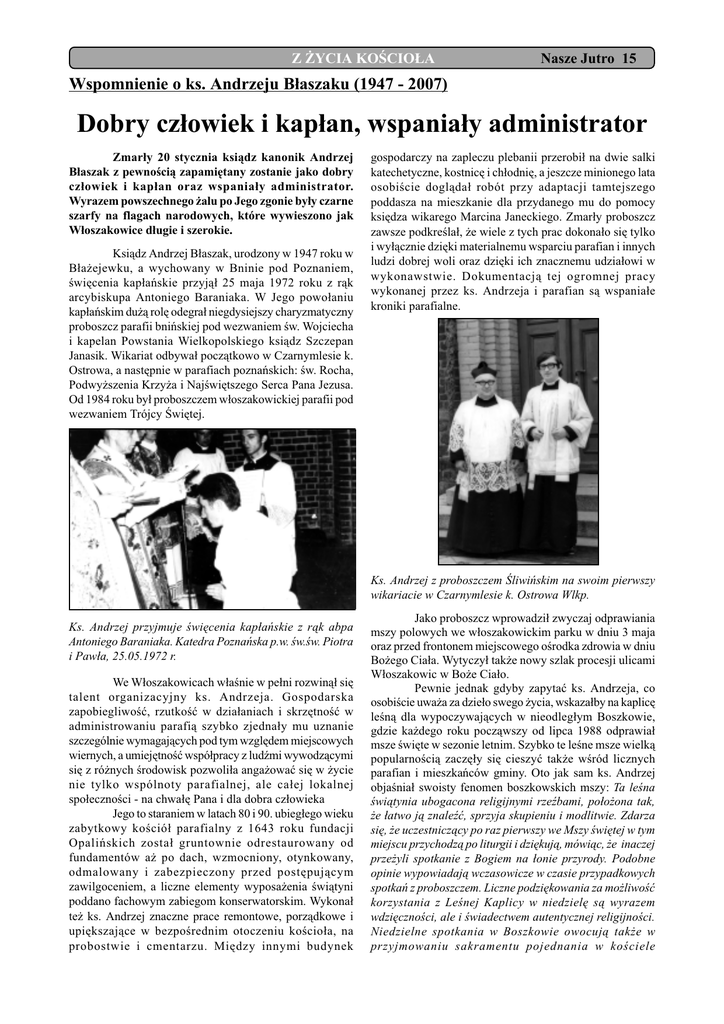 Z ¯YCIA KOCIO£A Nasze Jutro 15 Wspomnienie o ks. Andrzeju B³aszaku (1947 - 2007) Dobry cz³owiek i kap³an, wspania³y administrator Zmar³y 20 stycznia ksi¹dz kanonik Andrzej B³aszak z pewnoci¹ zapamiêtany zostanie jako dobry cz³owiek i kap³an oraz wspania³y administrator. Wyrazem powszechnego ¿alu po Jego zgonie by³y czarne szarfy na flagach narodowych, które wywieszono jak W³oszakowice d³ugie i szerokie. Ksi¹dz Andrzej B³aszak, urodzony w 1947 roku w B³a¿ejewku, a wychowany w Bninie pod Poznaniem, wiêcenia kap³añskie przyj¹³ 25 maja 1972 roku z r¹k arcybiskupa Antoniego Baraniaka. W Jego powo³aniu kap³añskim du¿¹ rolê odegra³ niegdysiejszy charyzmatyczny proboszcz parafii bniñskiej pod wezwaniem w. Wojciecha i kapelan Powstania Wielkopolskiego ksi¹dz Szczepan Janasik. Wikariat odbywa³ pocz¹tkowo w Czarnymlesie k. Ostrowa, a nastêpnie w parafiach poznañskich: w. Rocha, Podwy¿szenia Krzy¿a i Najwiêtszego Serca Pana Jezusa. Od 1984 roku by³ proboszczem w³oszakowickiej parafii pod wezwaniem Trójcy wiêtej. gospodarczy na zapleczu plebanii przerobi³ na dwie salki katechetyczne, kostnicê i ch³odniê, a jeszcze minionego lata osobicie dogl¹da³ robót przy adaptacji tamtejszego poddasza na mieszkanie dla przydanego mu do pomocy ksiêdza wikarego Marcina Janeckiego. Zmar³y proboszcz zawsze podkrela³, ¿e wiele z tych prac dokona³o siê tylko i wy³¹cznie dziêki materialnemu wsparciu parafian i innych ludzi dobrej woli oraz dziêki ich znacznemu udzia³owi w wykonawstwie. Dokumentacj¹ tej ogromnej pracy wykonanej przez ks. Andrzeja i parafian s¹ wspania³e kroniki parafialne. Ks. Andrzej z proboszczem liwiñskim na swoim pierwszy wikariacie w Czarnymlesie k. Ostrowa Wlkp. Ks. Andrzej przyjmuje wiêcenia kap³añskie z r¹k abpa Antoniego Baraniaka. Katedra Poznañska p.w. w.w. Piotra i Paw³a, 25.05.1972 r. We W³oszakowicach w³anie w pe³ni rozwin¹³ siê talent organizacyjny ks. Andrzeja. Gospodarska zapobiegliwoæ, rzutkoæ w dzia³aniach i skrzêtnoæ w administrowaniu parafi¹ szybko zjedna³y mu uznanie szczególnie wymagaj¹cych pod tym wzglêdem miejscowych wiernych, a umiejêtnoæ wspó³pracy z ludmi wywodz¹cymi siê z ró¿nych rodowisk pozwoli³a anga¿owaæ siê w ¿ycie nie tylko wspólnoty parafialnej, ale ca³ej lokalnej spo³ecznoci - na chwa³ê Pana i dla dobra cz³owieka Jego to staraniem w latach 80 i 90. ubieg³ego wieku zabytkowy koció³ parafialny z 1643 roku fundacji Opaliñskich zosta³ gruntownie odrestaurowany od fundamentów a¿ po dach, wzmocniony, otynkowany, odmalowany i zabezpieczony przed postêpuj¹cym zawilgoceniem, a liczne elementy wyposa¿enia wi¹tyni poddano fachowym zabiegom konserwatorskim. Wykona³ te¿ ks. Andrzej znaczne prace remontowe, porz¹dkowe i upiêkszaj¹ce w bezporednim otoczeniu kocio³a, na probostwie i cmentarzu. Miêdzy innymi budynek Jako proboszcz wprowadzi³ zwyczaj odprawiania mszy polowych we w³oszakowickim parku w dniu 3 maja oraz przed frontonem miejscowego orodka zdrowia w dniu Bo¿ego Cia³a. Wytyczy³ tak¿e nowy szlak procesji ulicami W³oszakowic w Bo¿e Cia³o. Pewnie jednak gdyby zapytaæ ks. Andrzeja, co osobicie uwa¿a za dzie³o swego ¿ycia, wskaza³by na kaplicê len¹ dla wypoczywaj¹cych w nieodleg³ym Boszkowie, gdzie ka¿dego roku pocz¹wszy od lipca 1988 odprawia³ msze wiête w sezonie letnim. Szybko te lene msze wielk¹ popularnoci¹ zaczê³y siê cieszyæ tak¿e wród licznych parafian i mieszkañców gminy. Oto jak sam ks. Andrzej objania³ swoisty fenomen boszkowskich mszy: Ta lena wi¹tynia ubogacona religijnymi rzebami, po³o¿ona tak, ¿e ³atwo j¹ znaleæ, sprzyja skupieniu i modlitwie. Zdarza siê, ¿e uczestnicz¹cy po raz pierwszy we Mszy wiêtej w tym miejscu przychodz¹ po liturgii i dziêkuj¹, mówi¹c, ¿e inaczej prze¿yli spotkanie z Bogiem na ³onie przyrody. Podobne opinie wypowiadaj¹ wczasowicze w czasie przypadkowych spotkañ z proboszczem. Liczne podziêkowania za mo¿liwoæ korzystania z Lenej Kaplicy w niedzielê s¹ wyrazem wdziêcznoci, ale i wiadectwem autentycznej religijnoci. Niedzielne spotkania w Boszkowie owocuj¹ tak¿e w przyjmowaniu sakramentu pojednania w kociele