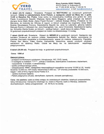 Biuro Podr62y VERO TRAVEL 45-075 Opole, ul. Krakowska 37 tel.77 454 45 69 tel./fax 77 453 95 76 www.verotravel.pl e-mail: [email protected] (23.10 niedz.): Sniadanie. Przqazd do WATYKANU we wczesnych godzinach rannych. Udzial w nabo2efstwie Aniol Pafski, a nastgpnie udzial we Mszy 5w. o godz. 13.00 w Bazytice Sw. Piotra. Czas wolny na indywidualnq modlitwg pzy grobie 5w. Jana Pawla ll.zwiedzanie Bazyliki Wiqkszej Santa Maria Maggiore, gdzie znajduje siq laskami slynqca ikona Matki Bo2ej ,,Salus Popoli Romani" i relikwie Bo2ego ZtObfa. Przej6cie na Via Merulana, do koSciola 5w. Alfonsa di Liguori, w kt6rym znajduje sig oryginalny obraz Matki Boskiej Nieustajqcej Pomocy. Nawiedzenie Bazyliki 5w. Jana na Lateranie, gl6wnej katedry Biskupa Rzymu z relikwiami 5w. Jana Ewangelisty i 5w. Jana Chrzciciela. Nawiedzenie kaplicy 6 dzieri 5w. Schod6w (Santa Scala), po kt6rych - wedlug tradycji - szedl Jezus do palacu Pilata. W godzinach popoludniowych przqazd do hotelu na obiadokolacjq i 5 nocleg. 7 dziefi (24.09 wt): Sniadanie. Wyjazd do WENEGJI w godzinach rannych. Nastgpnie rejs kanalem Giudecca do centrum miasta. Nawiedzenie Bazyliki Sw. Marka- wzorowanej na koSciele Dwunastu Apostolow w Konstantynopolu, spacer po mie5cie, zobaczymy'. Piazzetta, Piazza San Marco, Palac Do26w, Kampanilla- dzwonnica, spacer uroczymi uliczkami weneckimi do dzielnicy Rialto. Udzial we Mszy 5w. na zakoficzenie wsp6lnego pielgrzymowania. 8 dzieri (25.09 wt): Przyjazd do kraju w godzinach popoludniowych. Gena: 1590 zl SwnoczENrA: - przelazd komfortowym autokarem, klimatyzacja, WC, DVD, barek, - 5 noclegow w hotelach ***/**** , pokoje 2-osobowe, ewentualnie 3-osobowe z lazienkami, - wy2ywienie: 5 5niada6, 5 obiadokolacji, - opieka profesjonalnego pilota, - ubezpieczenie: NNW nastqpstwa nieszczg6liwych wypadkow na sume 15.000 zl, KL koszty leczenia 10.000 eur, KR koszty ratownictwa 5.000 eur, CP choroby pzewlekle 10.000 euro, ba9a21.000 zlfirmy Signal lduna Polska S.A. - opieka duchowa kaplana, - Pakiet pielgrzyma (chusta, identyfikator, Spiewnik, obrazek pamiqtkowy). Gena nie zawiera: oplat za bilety wstqpu do zwiedzanych obiekt6w, lokalnych przewodnik6w, taksy klimatycznej i transportu lokalnego np. metra w Rzymie, barkiw Wenecji, zestaw6w sluchawkowych, nale?y przygowowa6 - ok. 50 Euro na osobq.