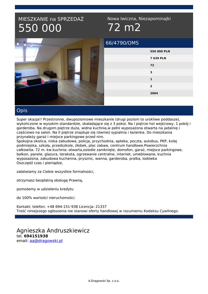 Nowa Iwiczna, Niezapominajki MIESZKANIE na SPRZEDAŻ 72 m2 550 000 66/4790/OMS 550 000 PLN 7 639 PLN 72 3 1 2 2004 Opis Super okazja!! Przestronne, dwupoziomowe mieszkanie (drugi poziom to urokliwe poddasze), wykończone w wysokim standardzie, skaładające się z 3 pokoi. Na I piętrze hol wejściowy, 1 pokój i garderoba. Na drugom piętrze duża, widna kuchnia,w pełni wyposażona otwarta na jadalnię i częściowo na salon. Na II piętrze znajduje się również sypialnia i łazienka. Do mieszkania przynależy garaż i miejsce parkingowe przed nim. Spokojna okolica, niska zabudowa, policja, przychodnia, apteka, poczta, autobus, PKP, kolej podmiejska, szkoła, przedszkole, żłobek, plac zabaw, centrum handlowe.Powierzchnia całkowita: 72 m. kw.kuchnia: otwarta,osiedle zamknięte, domofon, garaż, miejsce parkingowe, balkon, panele, glazura, terakota, ogrzewanie centralne, internet, umeblowane, kuchnia wyposażona, zabudowa kuchenna, prysznic, wanna, garderoba, pralka, lodówka Oszczędź czas i pieniądze, załatwiamy za Ciebie wszystkie formalności, otrzymasz bezpłatną obsługę Prawną, pomożemy w udzieleniu kredytu do 100% wartości nieruchomości. Kontakt: telefon: +48 694-151-938 Licencja: 21337 Treść niniejszego ogłoszenia nie stanowi oferty handlowej w rozumieniu Kodeksu Cywilnego. Agnieszka Andruszkiewicz tel. 694151938 email: [email protected] A.Drągowski Sp. z o.o. Powered by TCPDF (www.tcpdf.org)