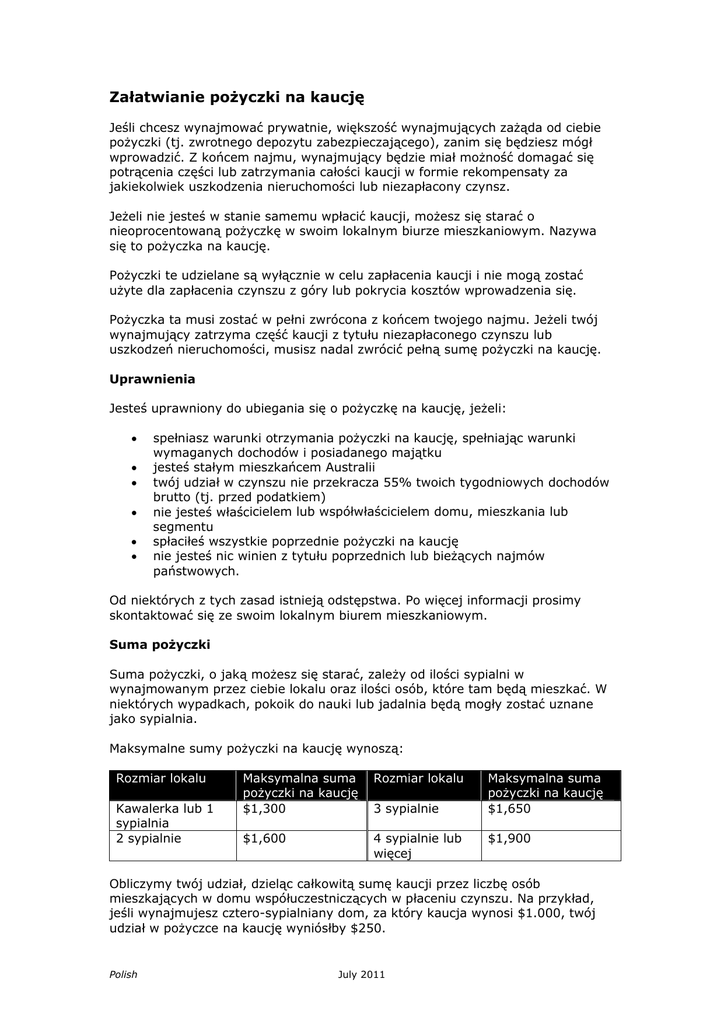 Załatwianie pożyczki na kaucję Jeśli chcesz wynajmować prywatnie, większość wynajmujących zażąda od ciebie pożyczki (tj. zwrotnego depozytu zabezpieczającego), zanim się będziesz mógł wprowadzić. Z końcem najmu, wynajmujący będzie miał możność domagać się potrącenia części lub zatrzymania całości kaucji w formie rekompensaty za jakiekolwiek uszkodzenia nieruchomości lub niezapłacony czynsz. Jeżeli nie jesteś w stanie samemu wpłacić kaucji, możesz się starać o nieoprocentowaną pożyczkę w swoim lokalnym biurze mieszkaniowym. Nazywa się to pożyczka na kaucję. Pożyczki te udzielane są wyłącznie w celu zapłacenia kaucji i nie mogą zostać użyte dla zapłacenia czynszu z góry lub pokrycia kosztów wprowadzenia się. Pożyczka ta musi zostać w pełni zwrócona z końcem twojego najmu. Jeżeli twój wynajmujący zatrzyma część kaucji z tytułu niezapłaconego czynszu lub uszkodzeń nieruchomości, musisz nadal zwrócić pełną sumę pożyczki na kaucję. Uprawnienia Jesteś uprawniony do ubiegania się o pożyczkę na kaucję, jeżeli: spełniasz warunki otrzymania pożyczki na kaucję, spełniając warunki wymaganych dochodów i posiadanego majątku jesteś stałym mieszkańcem Australii twój udział w czynszu nie przekracza 55% twoich tygodniowych dochodów brutto (tj. przed podatkiem) nie jesteś właścicielem lub współwłaścicielem domu, mieszkania lub segmentu spłaciłeś wszystkie poprzednie pożyczki na kaucję nie jesteś nic winien z tytułu poprzednich lub bieżących najmów państwowych. Od niektórych z tych zasad istnieją odstępstwa. Po więcej informacji prosimy skontaktować się ze swoim lokalnym biurem mieszkaniowym. Suma pożyczki Suma pożyczki, o jaką możesz się starać, zależy od ilości sypialni w wynajmowanym przez ciebie lokalu oraz ilości osób, które tam będą mieszkać. W niektórych wypadkach, pokoik do nauki lub jadalnia będą mogły zostać uznane jako sypialnia. Maksymalne sumy pożyczki na kaucję wynoszą: Rozmiar lokalu Kawalerka lub 1 sypialnia 2 sypialnie Maksymalna suma pożyczki na kaucję $1,300 $1,600 Rozmiar lokalu 3 sypialnie 4 sypialnie lub więcej Maksymalna suma pożyczki na kaucję $1,650 $1,900 Obliczymy twój udział, dzieląc całkowitą sumę kaucji przez liczbę osób mieszkających w domu współuczestniczących w płaceniu czynszu. Na przykład, jeśli wynajmujesz cztero-sypialniany dom, za który kaucja wynosi $1.000, twój udział w pożyczce na kaucję wyniósłby $250. Polish July 2011 Występowanie o pożyczkę na kaucję Możesz wystąpić do najbliższego biura mieszkaniowego, wypełniając formularz Bond Loan Application i udzielając nam tą drogą informacji koniecznych dla ustalenia, czy przysługuje ci pożyczka. Możesz wystąpić we własnym imieniu, jako para lub jako jeden z mieszkańców. Wymagany jest jedynie jeden formularz na każdy wynajmowany lokal. Nie płać wynajmującemu ani agentowi żadnych pieniędzy z tytułu kaucji, dopóki nie dowiesz się od nas, czy twoja pożyczka została zatwierdzona. Z wyjątkiem szczególnych przypadków, nie możemy zrefundować kaucji, jeśli ją już zdążyłeś zapłacić właścicielowi lub agentowi. Nie możesz występować o pożyczkę na kaucję do czasu, gdy twój wynajmujący lub agent nie zatwierdzą twojego wniosku o wynajęcie danego lokalu. Lokal, który pragniesz wynająć musi znajdować się w Wiktorii. Twój wynajmujący lub agent muszą również wypełnić część wniosku o pożyczkę na kaucję, by powiedzieć nam więcej na temat lokalu, który będziesz wynajmować. Jeżeli twój wynajmujący nie korzysta z agenta nieruchomości, wówczas musi również potwierdzić, że lokal jest jego własnością lub wyrazić zgodę na to, byśmy to sprawdzili w Radzie Miasta. Dochody i majątek Dochody i majątek każdej osoby ubiegającej się o pożyczkę muszą mieścić się w granicach określonych przez Urząd Mieszkalnictwa. Są one na ogół uaktualniane co 6 miesięcy. Jeśli ty lub inny wnioskodawca otrzymujecie zasiłek z Centrelink, możecie udzielić nam zgody na potwierdzenie waszych dochodów, majątku oraz innych informacji z Centrelink, korzystając z Income Confirmation Service. Jeśli skorzystasz z tej usługi, nie będziesz musiał przedstawiać nam żadnych dokumentów dotyczących twojego stanu posiadania. Jeśli ty lub inny wnioskodawca nie skorzystacie z Income Confirmation Service, będziecie musieli przedstawiać nam dokumenty stwierdzające dochody każdego z wnioskodawców. Może to być aktualny (nie dłużej niż sprzed dwóch tygodni) list z Centrelink lub Veterans Affairs, zaświadczenie o dochodach od twojego pracodawcy lub 13-tygodniowy rachunek strat i zysków, jeśli pracujesz dla siebie. Ponadto musicie nam przedstawić dokumenty stwierdzające wasz stan posiadania, włącznie z posiadanymi nieruchomościami. Dowód dochodu i stałego pobytu Każdy wnioskodawca musi przedstawić dowód tożsamości. Może on być w formie dokumentu ze zdjęciem i podpisem (na przykład paszport lub prawo jazdy) lub dwa inne dokumenty tożsamości dla każdej osoby (na przykład Medicare Card, Health Care Card czy akt urodzenia). Ponadto każdy mieszkaniec lokalu musi przedstawić dowód stałego pobytu (np. zaświadczenie o posiadaniu obywatelstwa australijskiego, wizę, paszport lub list z Departamentu Imigracji i Obywatelstwa). Polish July 2011 Otrzymanie pożyczki Jeśli twoje podanie zostanie zatwierdzone, wówczas ty lub twój wynajmujący/agent nieruchomości otrzymacie czek płatny na rzecz Residential Tenancies Bond Authority. Do czeku załączony będzie formularz Bond Lodgement, który wynajmujący wykorzysta dla wpłacenia kaucji do Residential Tenancies Bond Authority. Spłacanie pożyczki Z końcem twojego najmu, twój wynajmujący lub agent wystąpią do Residential Tenancies Bond Authority o zwrot kaucji do Urzędu Mieszkalnictwa. Jeśli twój wynajmujący zatrzyma 
