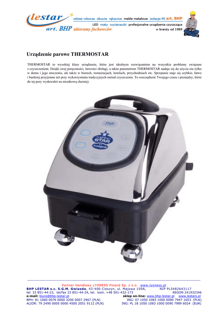 Urządzenie parowe THERMOSTAR THERMOSTAR to wysokiej klasy urządzenie, które jest idealnym rozwiązaniem na wszystkie problemy związane z czyszczeniem. Dzięki swej poręczności, łatwości obsługi, a także parametrom THERMOSTAR nadaje się do użycia nie tylko w domu i jego otoczeniu, ale także w biurach, restauracjach, hotelach, przychodniach etc. Sprzątanie staje się szybkie, łatwe i bardziej przyjemne niż przy wykorzystaniu tradycyjnych metod czyszczenia. To oszczędność Twojego czasu i pieniędzy, które do tej pory wydawałeś na niezdrową chemię). Partner Handlowy LYONESS Poland Sp. z o.o. www.lyoness.pl BHP LESTAR s.c. S.G.M. Gwiazda, 43-400 Cieszyn, ul. Majowa 159A, NIP PL5482643117 tel. 33 851-44-23, tel/fax 33 851-44-24, tel. kom. +48 501-432-173 REGON 241932346 e-mail: [email protected] sklep on-line: www.bhp-lestar.pl www.lestars.pl BPH: 81 1060 0076 0000 3200 0007 2967 (PLN) ING: 07 1050 1083 1000 0090 7947 1653 (PLN) ALIOR: 79 2490 0005 0000 4500 2051 9112 (PLN) ING: PL 18 1050 1083 1000 0090 7989 6024 (EUR) THERMOSTAR to same korzyści Czyszczenie parą o wysokiej temperaturze jest wiele dokładniejsze, bardziej higieniczne i zdrowsze od innych sposobów czyszczenia. Gorąca para o niskiej wilgotności skutecznie niszczy bakterie i grzyby. Umożliwia dotarcie do miejsc trudnodostępnych (kaloryfery, żyrandole, żaluzje, zakamarki, listwy, fugi itp.) Posadzki, płytki PCV, wykładziny wyczyścisz teraz szybciej i dokładniej. Powierzchnia będzie naprawdę czysta bez narażania Cię na żrącą chemię Mycie okien staje się najprostszą, szybką i co najważniejsze dokładną pracą - bez smug, odbić i plam - a to wszystko bez środków chemicznych. Likwidacja nieprzyjemnych zapachów z toalety i zlewów kuchennych uzyskasz dzięki dezynfekcji termicznej i neutralizacji zapachów. To duży krok w kierunku zdrowia! Użycie pary jest nie tylko ekologiczne, ale także zdrowe dla Twojej rodziny! Parametry techniczne: Kocioł: stal szlachetna Pojemność kotła: 1,4 l Pojemność zbiornika: 2,5 l Pobór energii 2000 W Ciśnienie robocze: 6 bar Wyświetlacz: cyfrowy Napięcie zasilania: 230 V -50 Hz Regulacja ciśnienia: 3 poziomy (ręczny sterownik) System oszczędności energii: tak Opcja gorącej wody: tak - 2 Lata gwarancji na urządzenie - 10 Lat gwarancji na kocioł - 10 Lat gwarancji na system grzewczy - w cenie prezentacja dla personelu Thermostar wersja podstawowa żelazko mop - 8900 zł brutto (netto 7235,77) - 980 zł brutto (netto 796,75) - 2000 zł brutto (netto 1626,01) kontakt: Robert Kalisz, tel. 33/8514423 SKYPE: bhp-lestar_sklep_on-line lub 501850428 Partner Handlowy LYONESS Poland Sp. z o.o. www.lyoness.pl BHP LESTAR s.c. S.G.M. Gwiazda, 43-400 Cieszyn, ul. Majowa 159A, NIP PL5482643117 tel. 33 851-44-23, tel/fax 33 851-44-24, tel. kom. +48 501-432-173 REGON 241932346 e-mail: [email protected] sklep on-line: www.bhp-lestar.pl www.lestars.pl BPH: 81 1060 0076 0000 3200 0007 2967 (PLN) ING: 07 1050 1083 1000 0090 7947 1653 (PLN) ALIOR: 79 2490 0005 0000 4500 2051 9112 (PLN) ING: PL 18 1050 1083 1000 0090 7989 6024 (EUR)