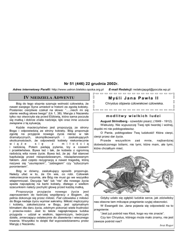 Nr 51 (446)/1 PO GÓRACH, DOLINACH... 22 grudnia 2002r. Nr 51 (446) 22 grudnia 2002r. Adres internetowy Parafii: http://www.ustron.bielsko.opoka.org.pl IV NIEDZIELA ADWENTU Bóg do tego stopnia szanuje wolność człowieka, Ŝe nawet swojego Syna umieścił w historii za zgodą kobiety. Posłaniec cierpliwie czekał na słowa: “.....niech mi się stanie według słowa twego” (Łk 1, 38). Maryja z Nazaretu tylko raz otworzyła się przed ElŜbietą, która sama poczuła się matką i dobrze znała nadzieje, lęki oraz inne uczucia związane z tą sytuacją. KaŜde macierzyństwo jest propozycją ze strony Boga i odpowiedzią ze strony kobiety. Bóg proponuje zgodę na przyjęcie nowego Ŝycia nieraz w tak dramatycznych, skomplikowanych i zaskakujących okolicznościach, Ŝe odpowiedź kobiety niekoniecznie w i ą Ŝ e s i ę z m i ł o ś c i ą i radością. Potem padają pytania, łzy a czasem i przekleństwa. Bywa teŜ i tak, Ŝe kobieta z ogromną radością wita nowe Ŝycie. Bywa teŜ, Ŝe jej fiat stanowi kapitulację przed niespodziewanym, niezaplanowanym faktem. Jest często rezygnacją a nawet tragedią, którą nazywa się “usunięciem”, “zabiegiem” czy “sztucznym poronieniem”. E-mail Redakcji: [email protected] M yś l i Ja na P aw ła II Chrystus objawia człowiekowi człowieka. modlitw y wielkich ludzi August Strindberg - szwedzki pisarz; (1849 - 1912). Wiekuisty. Nie wypuszczę Twej ręki twardej i wolnej, dopóki mi nie pobłogosławisz. O Panie, pobłogosław Twą ludzkość! Która cierpi, cierpi przez dar Ŝycia. Przede wszystkim zaś mnie, najbardziej doświadczonego bólami, nie tymi, które mam, ale tymi, które chciałbym mieć. Bóg w dziwny, zaskakujący sposób proponuje. NaleŜy ufać w to, Ŝe On wie, co robi. Człowiek niekoniecznie rozumie, ale Bóg nie musi go we wszystko wtajemniczać. Decyzja “tak” lub “nie” dla nowego Ŝycia spada najczęściej na barki kobiety, dlatego z wielkim szacunkiem naleŜy pochylić głowę przed kaŜdą matką. Propozycja przyjęcia nowego Ŝycia jest zaproszeniem do twórczej współpracy z Bogiem. Jej pełnia dokonuje się przez miłość. Fiat człowieka z miłości do Boga nadaje Ŝyciu wymiar sakralny. Miłość męŜczyzny i kobiety, zakotwiczona w Bogu, jest optymalnym klimatem dla daru Ŝycia, zdolnym pokonać wiele trudności i przeciw-ności. Jest to takŜe najpiękniejsza ludzka przygoda – udział w wielkim, tajemniczym, twórczym dziele, zmierzający ostatecznie do zbawienia i wiecznego trwania. Wszystko to dzięki fiat wypowiedzianemu przez Maryję z Nazaretu. Gdyby udało się zgłębić ludzkie serce, jak zdziwiłoby nas obecne tam milczące pragnienie czyjej obecności. W Ewangelii św. Jana pojawia się odpowiedź na to pragnienie: “Jest juŜ pośród nas Ktoś, kogo wy nie znacie”. Czy ten Chrystus, którego moŜe mało znamy, nie jest zawsze pośród nas? brat Roger Nr 51 (446)/2 22 grudnia 2002r. PO GÓRACH, DOLINACH... A Słowo stało się Ciałem i zamieszkało wśród nas Ten fragment Ewangelii św. Jana usłyszymy znowu w czasie BoŜego Narodzenia. Usłyszymy, Ŝe na początku było Słowo, a Słowo było u Boga i Bogiem było Słowo. Zdajemy sobie sprawę, Ŝe to Słowo to Bóg. To nie jest czysty werbalizm. Gdy czytamy w Hamlecie: Słowa..., słowa..., słowa..., wiemy, Ŝe mowa tylko o zwykłym gadulstwie, tymczasem wiara jest od tego bardzo daleka. W Kościele moŜna milczeć i być wtedy bliŜej Boga, bez słowa. Na początku było Słowo. Bóg, osoba, myślący i kochający Ojciec, który wypowiedział się jako artysta w Słowie. To Słowo to Chrystus. Ale Bóg mógł wypowiedzieć się tylko Bogiem. Wypowiedź Boga to Słowo o Nim samym. Chrystus to Bóg. Bóg jest zawsze na początku, na początku wszystkiego, na początku Ŝycia ludzkiego takŜe. To jest oczywiste dla kaŜdego człowieka, Ŝe Bóg jest na początku stworzenia, a jednak w Święta BoŜego Narodzenia trzeba nam nad tym znowu się zastanowić. Trzeba na nowo spojrzeć nie tylko na przyjście Syna BoŜego do człowieka, ale trzeba na nowo spojrzeć na Ŝycie ludzkie, na Ŝycie drugiego człowieka, a przede wszystkim na swoje Ŝycie. Spójrzmy na Maryję. Matka BoŜa wiedziała tyle o Mesja-szu od wielkich proroków Starego Testamentu, rozwaŜała Psalmy mesjańskie, znała takie pojęcia biblijne jak Emanuel, Syn NajwyŜszego, potomek Dawida. A jednak wsłuchiwała się w to, co opowiadali o Mesjaszu ci, którzy przyszli Mu się pokłonić, którzy w chwili narodzenia za gwiazdą, za aniołem przyszli aby takŜe mówić swoim codziennym językiem o Mesjaszu. Oni od bydła i strzyŜe-nia owiec, oni od wielkich spraw, oni od swoich codzien-nych zajęć przyszli, aby zobaczyć, ale takŜe aby opowiedzieć o widzeniu anioła, bo przecieŜ kaŜdy widział go inaczej, choć to był ten sam anioł. Dla jednych był wielką postacią, dla innych małym aniołkiem, dla jednych był przepiękny, dla innych był tylko informatorem, ale opowiadali o tym waŜnym wydarzeniu, bo było dla nich niezwykłe. Wierzyli bowiem, Ŝe Bóg ich wzywa, Ŝe Bóg kaŜe im zobaczyć Mesjasza, przywitać Go, Jemu się pokłonić, Jemu oddać cześć. KaŜdy z nas musi zachować pewien dystans do ludzkości, do człowieczeństwa, do tego co od Boga pochodzi, ale w człowieku jest realizowane. Męstwo jest tą cnotą, którą często człowiek chce się szczycić. Męstwo w róŜny sposób pojmowane: jako bohaterstwo dziejów, jako niezwykłe czyny, ale takŜe męstwo jako realizacja codzienności. św. Augustyn powia-da: Męstwo jest umiejętnością znoszenia zła i prze-ciwności Ŝycia w perspektywie radowania się wyŜszymi dobrami. Męstwo to przyjęcie tego wszystkiego, co staje przed człowiekiem jako realizacja jego zadań, realizacja jego uczuć, realizacja jego pragnień. Gdy spoglądamy na Ŝłóbek, na Nowonarodzonego takŜe chcielibyśmy w jakiś sposób siebie określić w zadaniu, którym jest męstwo. Myślę, Ŝe taki