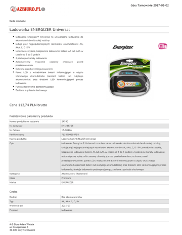 Góry Tarnowskie 2017-03-02 Karta produktu: Ładowarka ENERGIZER Universal ładowarka Energizer® Universal to uniwersalna ładowarka do akumulatorków dla całej rodziny ładuje pięć najpopularniejszych rozmiarów akumulatorów AA, AAA, C, D i 9V Umożliwia szybkie, bezpieczne ładowanie baterii AA lub AAA w czasie od 3 do 5 godzin 2 podwójne kanały ładowania Automatyczny wyłącznik czasowy chroniący przed przeładowaniem Ochrona przed przebiegunowaniem Panel LCD z wskaźnikiem baterii informującym o użyciu właściwego akumulatorka (zamiast baterii lub zużytego akumulatorka) oraz diodami LED komunikującymi proces ładowania Funkcja ładowania podtrzymującego Zasilana z gniazda sieciowego Cena 112,74 PLN brutto Podstawowe parametry produktu Numer produktu w systemie 24740 Nr dostawcy EN-298758 Nr Celcen 13-00426 Kod kreskowy 7638900298758 Nazwa produktu Ładowarka ENERGIZER Universal Opis ładowarka Energizer® Universal to uniwersalna ładowarka do akumulatorków dla całej rodziny; ładuje pięć najpopularniejszych rozmiarów akumulatorów AA, AAA, C, D i 9V; umożliwia szybkie, bezpieczne ładowanie baterii AA lub AAA w czasie od 3 do 5 godzin; 2 podwójne kanały ładowania; automatyczny wyłącznik czasowy chroniący przed przeładowaniem; ochrona przed przebiegunowaniem; panel LCD z wskaźnikiem baterii informującym o użyciu właściwego akumulatorka (zamiast baterii lub zużytego akumulatorka) oraz diodami LED komunikującymi proces ładowania; funkcja ładowania podtrzymującego; zasilana z gniazda sieciowego Kategoria Akumulatorki i ładowarki Klasa Premium Marka ENERGIZER Cecha Rodzaj Bez akumulatorków Typ AA, AAA, C, D, 9V W ofercie od 2015-07 Produkt ładowarka A-Z Biuro Adam Watoła ul. Oświęcimska 3 41-600 Góry Tarnowskie Góry Tarnowskie 2017-03-02 Karta katalogowa produktu cd. Ładowarka ENERGIZER Universal Wspólny słownik zamówień CPV 31411000-0 Certyfikaty Hit Hit Nowy produkt w ofercie Standard Serdecznie zapraszamy do współpracy A-Z Biuro Adam Watoła zespół. A-Z Biuro Adam Watoła ul. Oświęcimska 3 41-600 Góry Tarnowskie