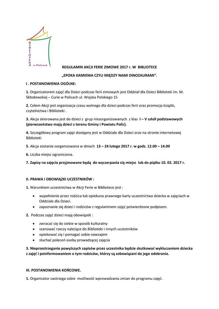 REGULAMIN AKCJI FERIE ZIMOWE 2017 r. W BIBLIOTECE „EPOKA KAMIENIA CZYLI MIĘDZY NAMI DINOZAURAMI”. I . POSTANOWIENIA OGÓLNE: 1. Organizatorem zajęć dla Dzieci podczas ferii zimowych jest Oddział dla Dzieci Biblioteki im. M. Skłodowskiej – Curie w Policach ul. Wojska Polskiego 15 2. Celem Akcji jest organizacja czasu wolnego dla dzieci podczas ferii oraz promocja książki, czytelnictwa i Biblioteki . 3. Akcja skierowana jest do dzieci z grup niezorganizowanych z klas I – V szkół podstawowych (pierwszeństwo mają dzieci z terenu Gminy i Powiatu Polic). 4. Szczegółowy program zajęć dostępny jest w Oddziale dla Dzieci oraz na stronie internetowej Biblioteki 5. Akcja zostanie zorganizowana w dniach 13 – 24 lutego 2017 r. w godz. 12.00 – 14.00 6. Liczba miejsc ograniczona. 7. Zapisy na zajęcia przyjmowane będą do wyczerpania się miejsc lub do piątku 10. 02. 2017 r. II. PRAWA I OBOWIĄZKI UCZESTNIKÓW : 1. Warunkiem uczestnictwa w Akcji Ferie w Bibliotece jest : wypełnienie przez rodzica lub opiekuna prawnego karty uczestnictwa dziecka w zajęciach w Oddziale dla Dzieci. zapoznanie się dzieci i rodziców z regulaminem zajęć potwierdzone podpisem. 2. Podczas zajęć dzieci mają obowiązek : zwracać się do siebie w sposób kulturalny szanować rzeczy należące do Biblioteki i innych uczestników opiekować się i pomagać sobie nawzajem słuchać poleceń osoby prowadzącej zajęcia 3. Nieprzestrzeganie powyższych zapisów przez uczestnika będzie skutkować wykluczeniem dziecka z zajęć i poinformowaniem o tym rodziców, którzy są zobowiązani do jego odebrania. III. POSTANOWIENIA KOŃCOWE. 1. Organizator zastrzega sobie możliwość wprowadzania zmian do programu zajęć. 2. Rodzic / opiekun prawny zobowiązany jest do zapoznania się z niniejszym regulaminem i programem zajęć przed zgłoszeniem i zapisem dziecka. 3. Przystąpienie do udziału w Akcji Ferie jest jednoznaczne z akceptacją regulaminu. 4. Przystępując do udziału w zajęciach każdy rodzic / opiekun dziecka wyraża zgodę na udostępnianie wizerunku dziecka ( np. na stronie internetowej biblioteki celem udokumentowania Akcji Ferie). Rodzic / opiekun może w każdej chwili cofnąć zgodę poprzez dostarczenie oświadczenia. 5. W sprawach nieregulowanych regulaminem uczestnicy zajęć są zobowiązani do stosowania się do pleceń prowadzącego zajęcia. Police 30. 01.2017 r. Kasprzak Renata Kierownik Oddziału dla Dzieci